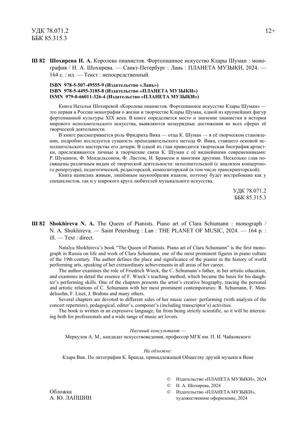 Книга Натальи Шохиревой «Королева пианистов» – это первая в России монография о жизни и творчестве Клары Шуман, одной из крупнейших фигур фортепианной культуры XIX века. В книге определяется место и значение пианистки в истории мирового исполнительского искусства, выявляются незаурядные достижения во всех сферах её творческой деятельности. В книге рассматривается роль Фридриха Вика – отца К. Шуман – в её творческом становлении, подробно исследуется сущность преподавательского метода Ф. Вика, ставшего основой исполнительского мастерства его дочери. В одной из глав приводится творческая биография артистки, прослеживаются личные и творческие связи К. Шуман с её виднейшими современниками: Р. Шуманом, Ф. Мендельсоном, Ф. Листом, И. Брамсом и многими другими. Несколько глав посвящены различным видам её творческой деятельности: исполнительской (с анализом концертного репертуара), педагогической, редакторской, композиторской (в том числе, транскрипторской). Книга написана живым, лишённым наукообразия языком, поэтому будет востребована как у специалистов, так и у широкого круга любителей музыкального искусства. Natalya Shokhireva’s book “The Queen of Pianists. Piano art of Clara Schumann” is the first monograph in Russia on life and work of Clara Schumann, one of the most prominent figures in piano culture of the 19th century. The author defines the place and significance of the pianist in the history of world performing arts, speaking of her extraordinary achievements in all areas of her career. The author examines the role of Friedrich Wieck, the C. Schumann’s father, in her artistic education, and examines in detail the essence of F. Wieck’s teaching method, which became the basis for his daughter’s performing skills. One of the chapters presents the artist’s creative biography, tracing the personal and artistic relations of C. Schumann with her most prominent contemporaries: R. Schumann, F. Mendelssohn, F. Liszt, J. Brahms and many others. Several chapters are devoted to different sides of her music career: performing (with analysis of the concert repertoire), pedagogical, editor’s, composer’s (including transcriptor’s) activities. The book is written in an expressive language, far from being strictly scientific, so it will be interesting both for professionals and a wide range of music art lovers.