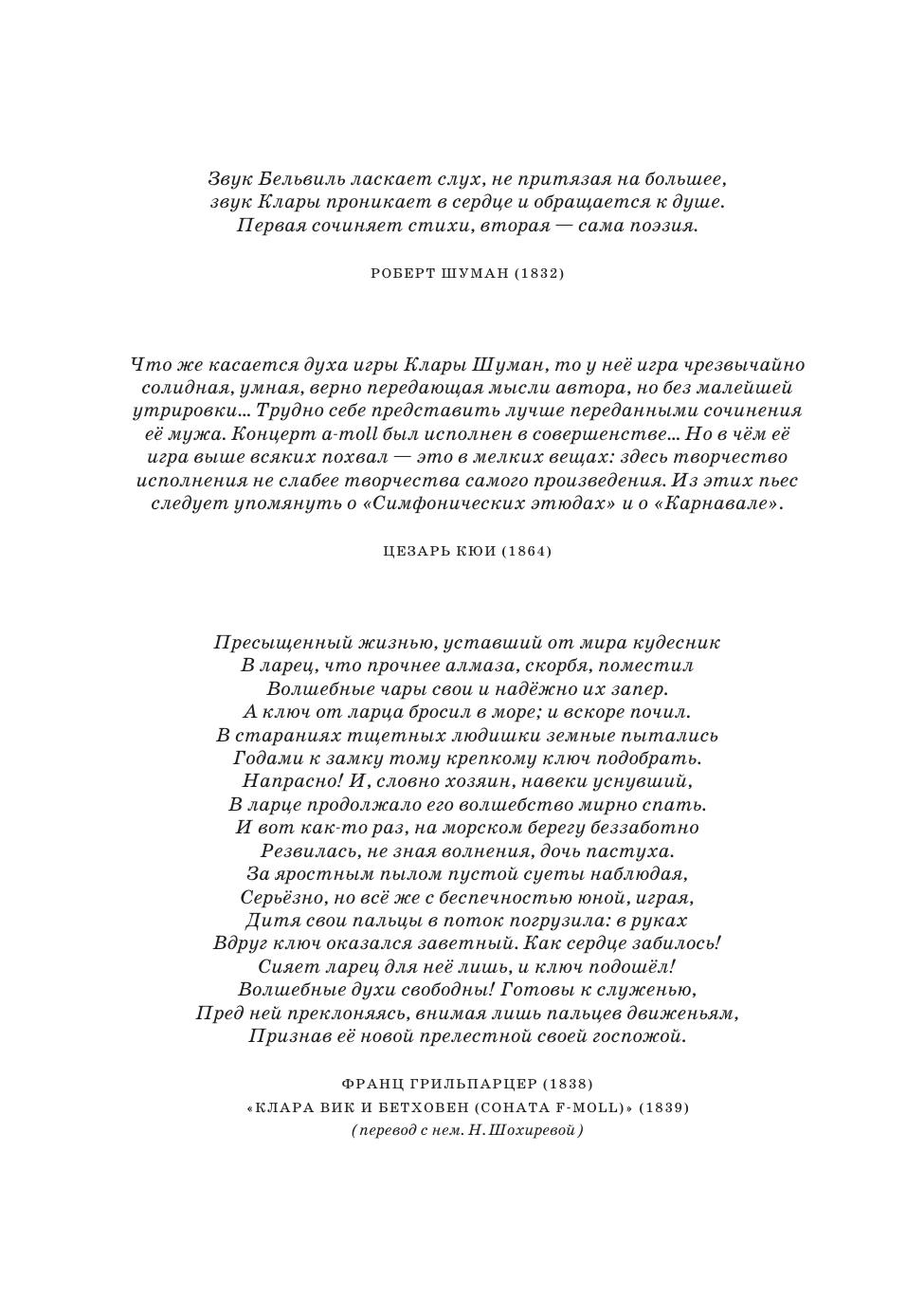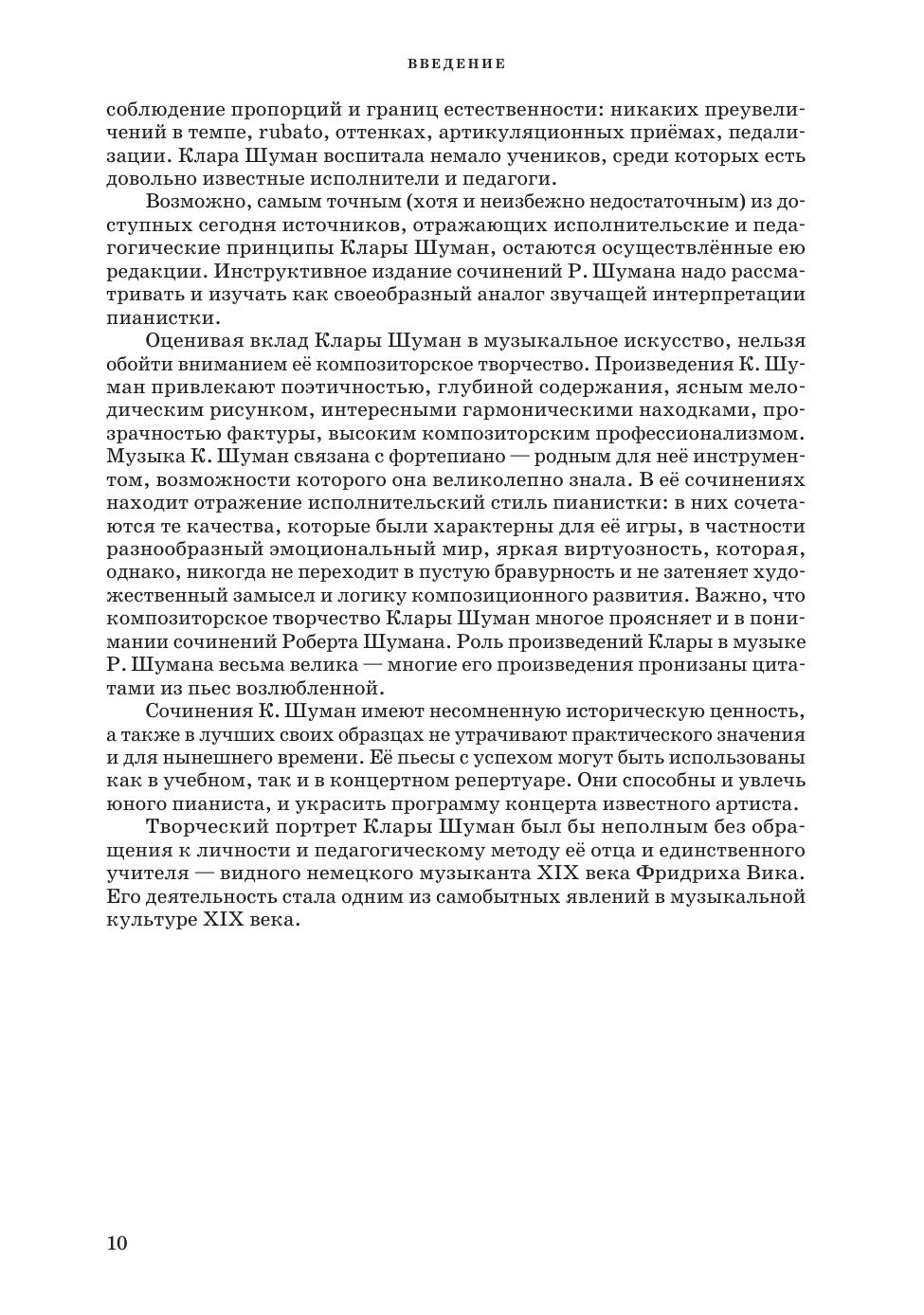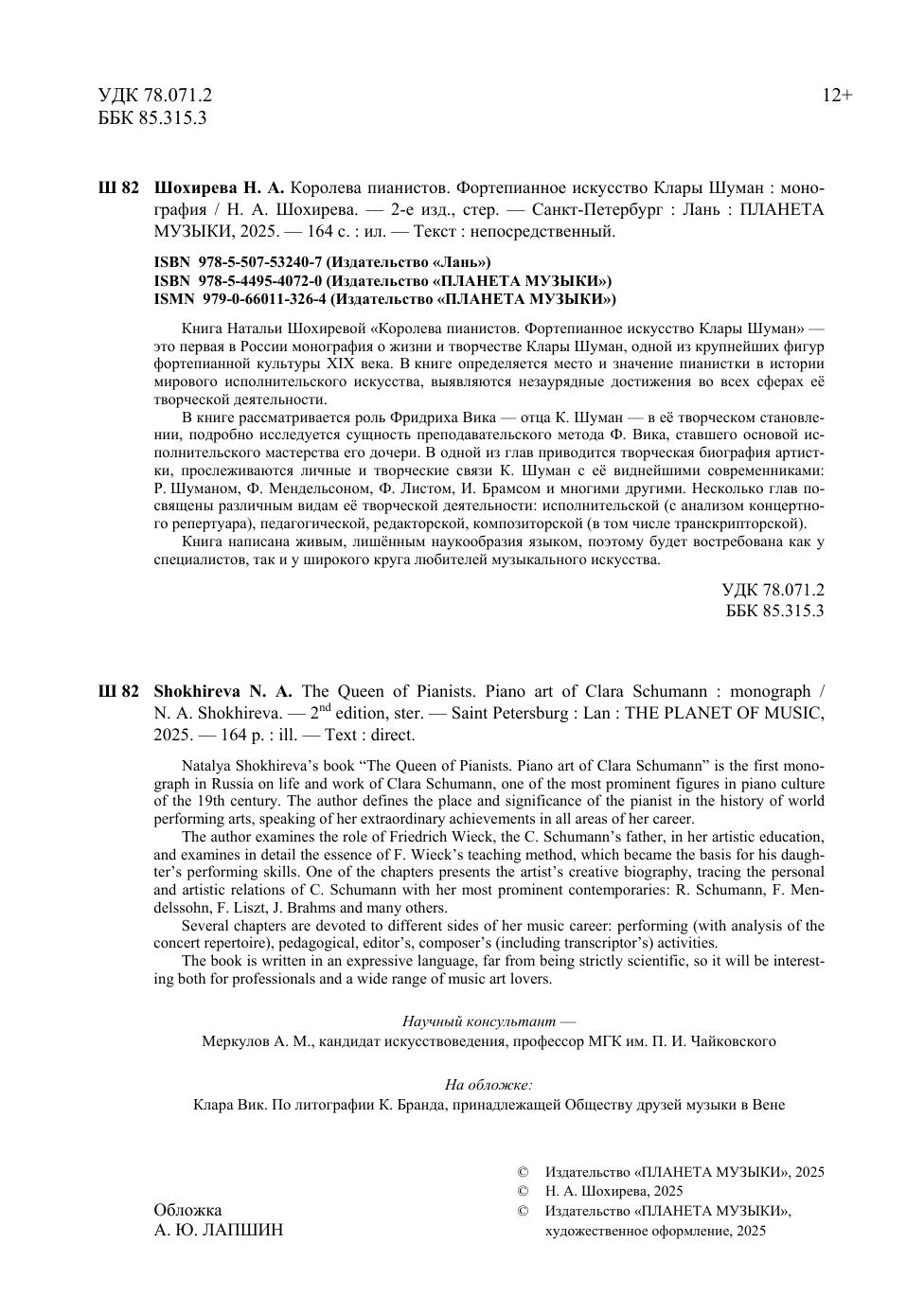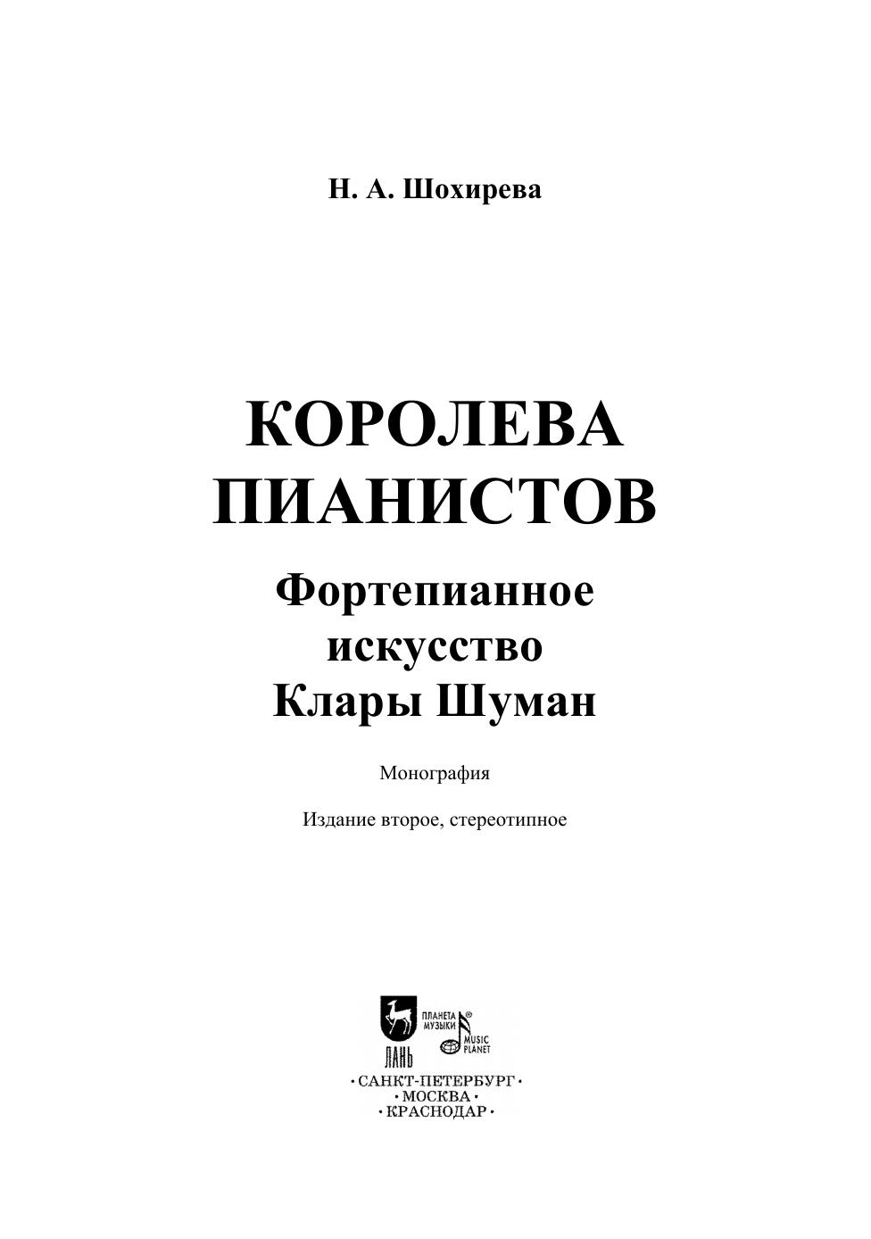 Книга Натальи Шохиревой «Королева пианистов» – это первая в России монография о жизни и творчестве Клары Шуман, одной из крупнейших фигур фортепианной культуры XIX века. В книге определяется место и значение пианистки в истории мирового исполнительского искусства, выявляются незаурядные достижения во всех сферах её творческой деятельности. В книге рассматривается роль Фридриха Вика – отца К. Шуман – в её творческом становлении, подробно исследуется сущность преподавательского метода Ф. Вика, ставшего основой исполнительского мастерства его дочери. В одной из глав приводится творческая биография артистки, прослеживаются личные и творческие связи К. Шуман с её виднейшими современниками: Р. Шуманом, Ф. Мендельсоном, Ф. Листом, И. Брамсом и многими другими. Несколько глав посвящены различным видам её творческой деятельности: исполнительской (с анализом концертного репертуара), педагогической, редакторской, композиторской (в том числе, транскрипторской). Книга написана живым, лишённым наукообразия языком, поэтому будет востребована как у специалистов, так и у широкого круга любителей музыкального искусства. Natalya Shokhireva’s book “The Queen of Pianists. Piano art of Clara Schumann” is the first monograph in Russia on life and work of Clara Schumann, one of the most prominent figures in piano culture of the 19th century. The author defines the place and significance of the pianist in the history of world performing arts, speaking of her extraordinary achievements in all areas of her career. The author examines the role of Friedrich Wieck, the C. Schumann’s father, in her artistic education, and examines in detail the essence of F. Wieck’s teaching method, which became the basis for his daughter’s performing skills. One of the chapters presents the artist’s creative biography, tracing the personal and artistic relations of C. Schumann with her most prominent contemporaries: R. Schumann, F. Mendelssohn, F. Liszt, J. Brahms and many others. Several chapters are devoted to different sides of her music career: performing (with analysis of the concert repertoire), pedagogical, editor’s, composer’s (including transcriptor’s) activities. The book is written in an expressive language, far from being strictly scientific, so it will be interesting both for professionals and a wide range of music art lovers.