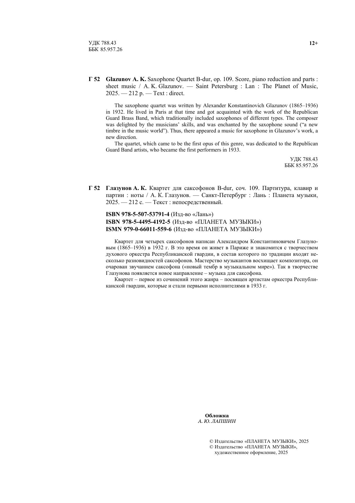 Квартет для четырех саксофонов написан Александром Константиновичем Глазуновым (1865–1936) в 1932 г. В это время он живет в Париже и знакомится с творчеством духового оркестра Республиканской гвардии, в состав которого по традиции входят не-сколько разновидностей саксофонов. Мастерство музыкантов восхищает композитора, он очарован звучанием саксофона («новый тембр в музыкальном мире»). Так в творчестве Глазунова появляется новое направление – музыка для саксофона. Квартет – первое из сочинений этого жанра – посвящен артистам оркестра Республи-канской гвардии, которые и стали первыми исполнителями в 1933 г. The saxophone quartet was written by Alexander Konstantinovich Glazunov (1865–1936) in 1932. He lived in Paris at that time and got acquainted with the work of the Republican Guard Brass Band, which traditionally included saxophones of different types. The composer was delighted by the musicians’ skills, and was enchanted by the saxophone sound (“a new timbre in the music world”). Thus, there appeared a music for saxophone in Glazunov’s work, a new direction. The quartet, which came to be the first opus of this genre, was dedicated to the Republican Guard Band artists, who became the first performers in 1933.