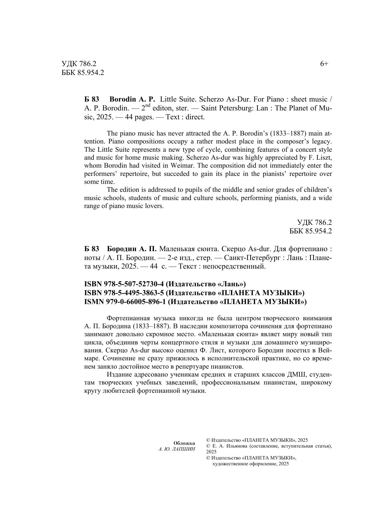 Фортепианная музыка никогда не была центром творческого внимания А. П. Бородина (1833-1887). В наследии композитора сочинения для фортепиано занимают довольно скромное место. «Маленькая сюита» являет миру новый тип цикла, объединив черты концертного стиля и музыки для домашнего музицирования. Скерцо As-dur высоко оценил Ф. Лист, которого Бородин посетил в Веймаре. Сочинение не сразу прижилось в исполнительской практике, но со временем заняло достойное место в репертуаре пианистов. Издание адресовано ученикам средних и старших классов ДМШ, студентам творческих учебных заведений, профессиональным пианистам, широкому кругу любителей фортепианной музыки. The piano music has never attracted the A. P. Borodin’s (1833–1887) main attention. Piano compositions occupy a rather modest place in the composer’s legacy. The “Little Suite” represents a new type of cycle, combining features of a concert style and music for home music making. Scherzo As-dur was highly appreciated by F. Liszt, whom Borodin had visited in Weimar. The composition did not immediately enter the performers’ repertoire, but succeded to gain its place in the pianists’ repertoire over some time. The edition is addressed to pupils of the middle and senior grades of children’s music schools, students of music and culture schools, performing pianists, and a wide range of piano music lovers.