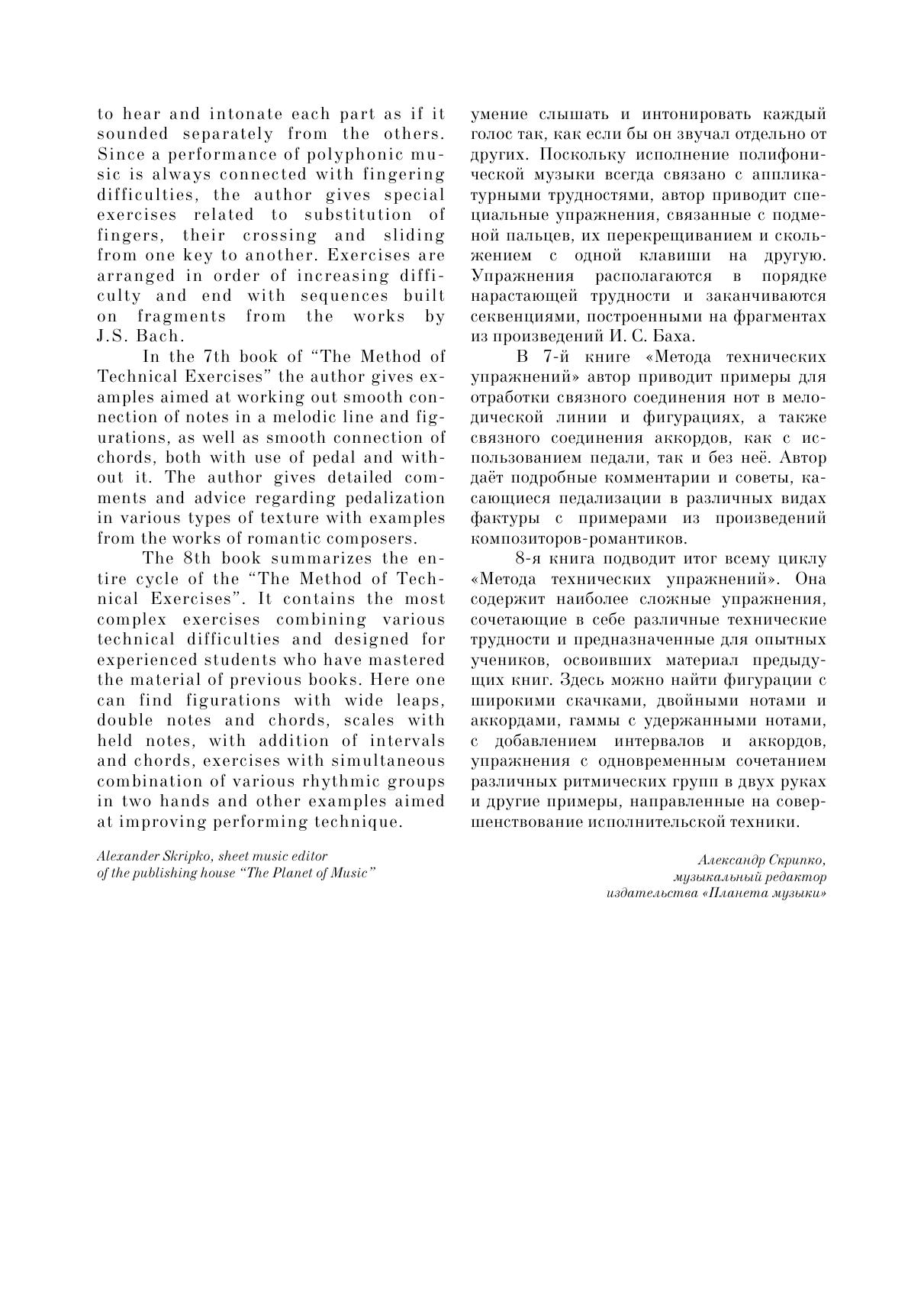Бруно Муджеллини (1871–1912) – итальянский пианист, композитор и музыкальный педагог, автор учебного пособия по игре на фортепиано «Метод технических упражнений». Этот масштабный труд, состоящий из восьми книг и представленный в данном издании полностью, охватывает самые разные аспекты фортепианной техники, начиная с элементарных упражнений для начинающих и заканчивая сложными примерами на двойные ноты, движение аккордами и арпеджио. Соответствует современным требованиям Федерального государственного образовательного стандарта среднего профессионального образования и профессиональным квалификационным требованиям. Адресовано студентам средних специальных учебных заведений. Bruno Mugellini (1871–1912) was an Italian pianist, composer and music teacher, the author of the manual "The Method of Technical Exercises for Piano". This large work, consisting of eight books included in current edition, covers a wide range of aspects of piano technique, starting with elementary exercises for beginners and ending with complex examples of double notes, chord progressions and arpeggios. Corresponds to the modern requirements of the Federal State Educational Standard of Secondary Vocational Education and professional qualification requirements. The textbook is intended for the students of colleges.