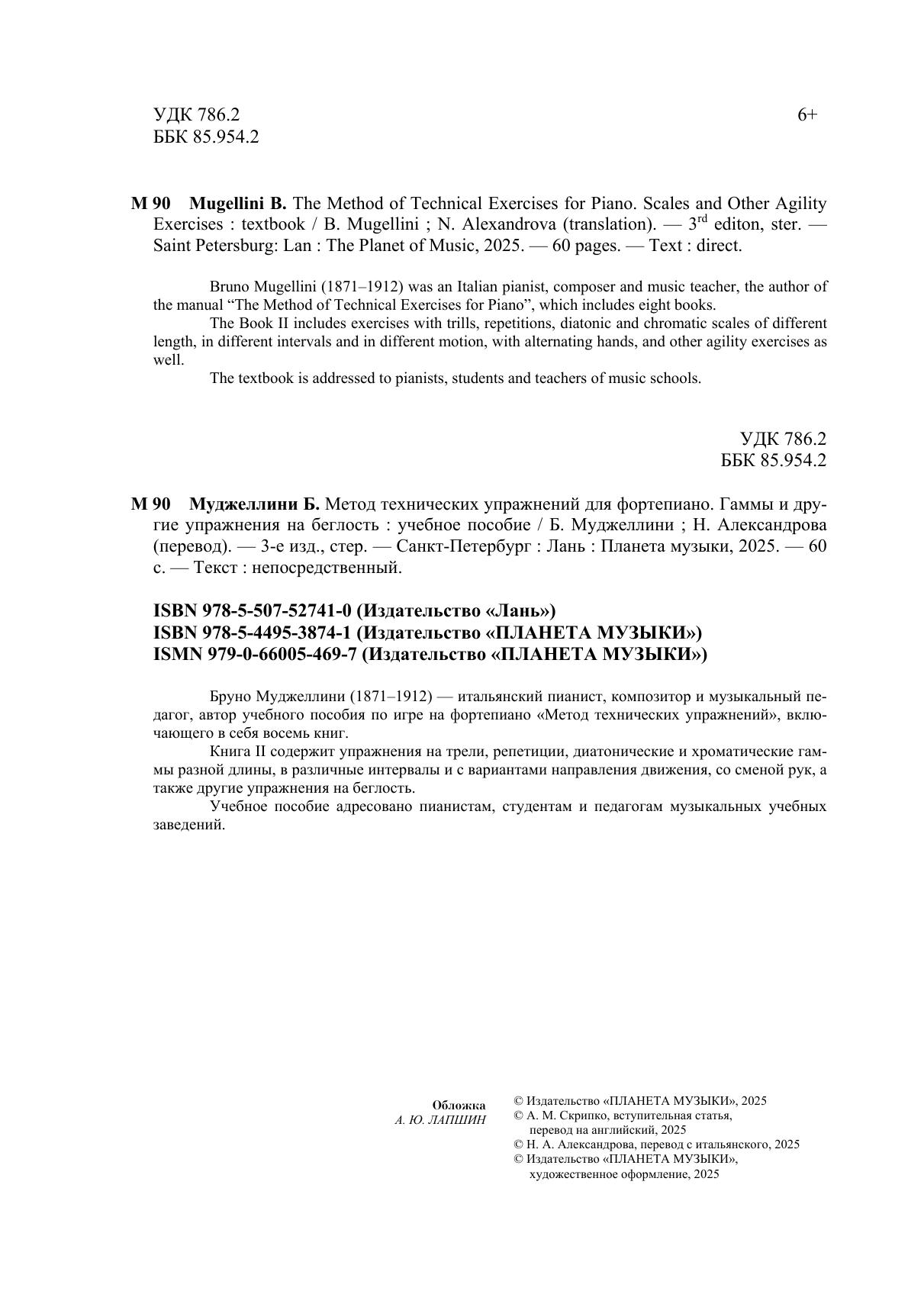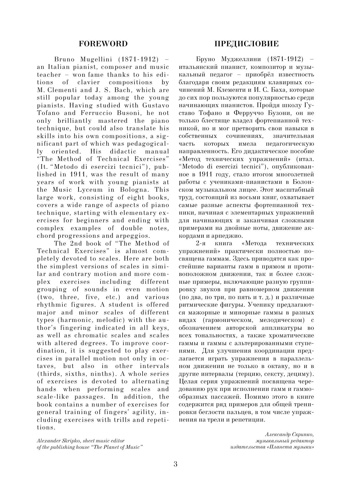 Бруно Муджеллини (1871–1912) – итальянский пианист, композитор и музыкальный педагог, автор учебного пособия по игре на фортепиано «Метод технических упражнений», включающего в себя восемь книг. Книга II содержит упражнения на трели, репетиции, диатонические и хроматические гаммы разной длины, в различные интервалы и с вариантами направления движения, со сменой рук, а также другие упражнения на беглость. Учебное пособие адресовано пианистам, студентам и педагогам музыкальных учебных заведений.