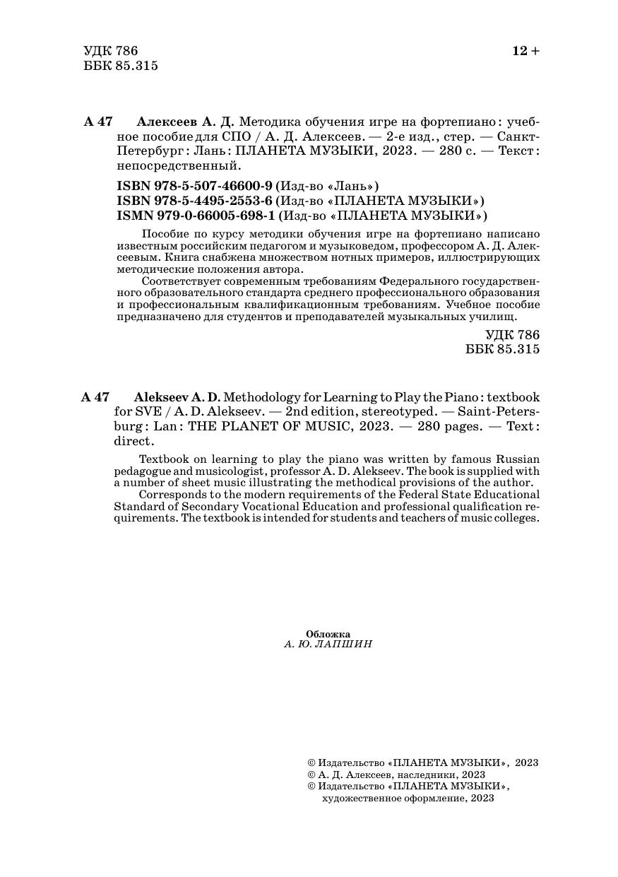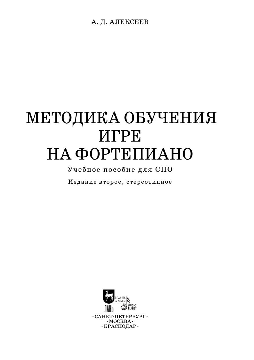 Пособие по курсу методики обучения игре на фортепиано написано известным российским педагогом и музыковедом, профессором А. Д. Алексеевым. Книга снабжена множеством нотных примеров, иллюстрирующих методические положения автора. Соответствует современным требованиям Федерального государственного образовательного стандарта среднего профессионального образования и профессиональным квалификационным требованиям. Учебное пособие предназначено для студентов и преподавателей музыкальных училищ. Textbook on learning to play the piano was written by famous Russian pedagogue and musicologist, professor A. D. Alekseev. The book is supplied with a number of sheet music illustrating the methodical provisions of the author. Corresponds to the modern requirements of the Federal State Educational Standard of Secondary Vocational Education and professional qualification requirements. The textbook is intended for students and teachers of music colleges.