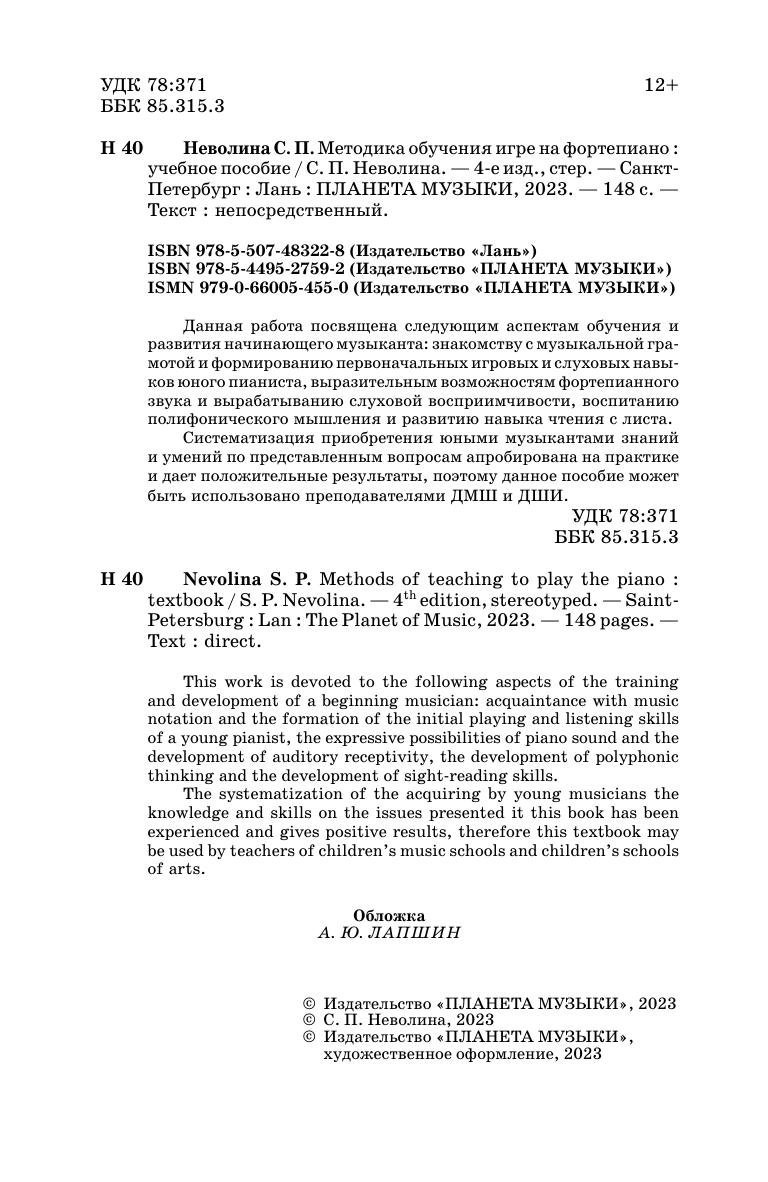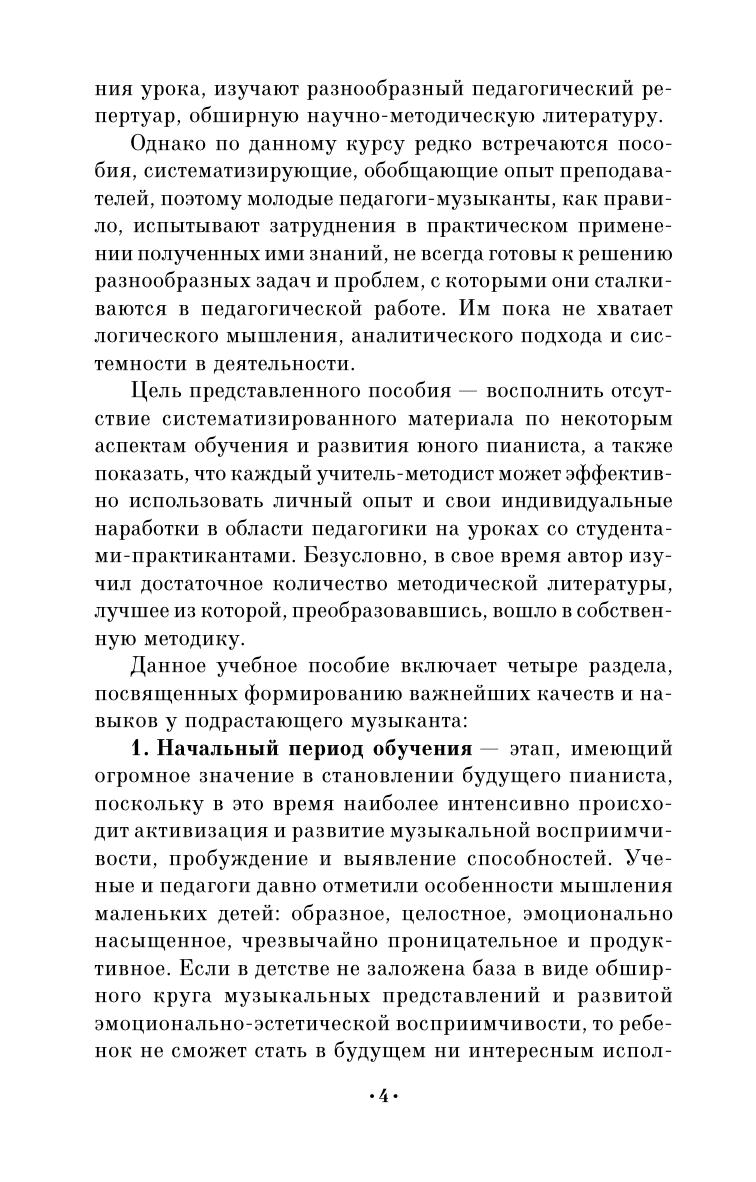 Данная работа посвящена следующим аспектам обучения и развития начинающего музыканта: знакомству с музыкальной грамотой и формированию первоначальных игровых и слуховых навыков юного пианиста, выразительным возможностям фортепианного звука и вырабатыванию слуховой восприимчивости, воспитанию полифонического мышления и развитию навыка чтения с листа. Систематизация приобретения юными музыкантами знаний и умений по представленным вопросам апробирована на практике и дает положительные результаты, поэтому данное пособие может быть использовано преподавателями ДМШ и ДШИ.