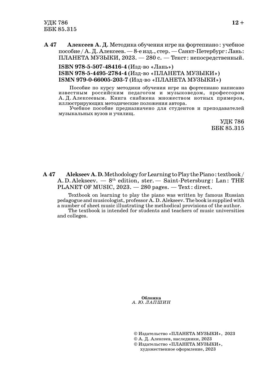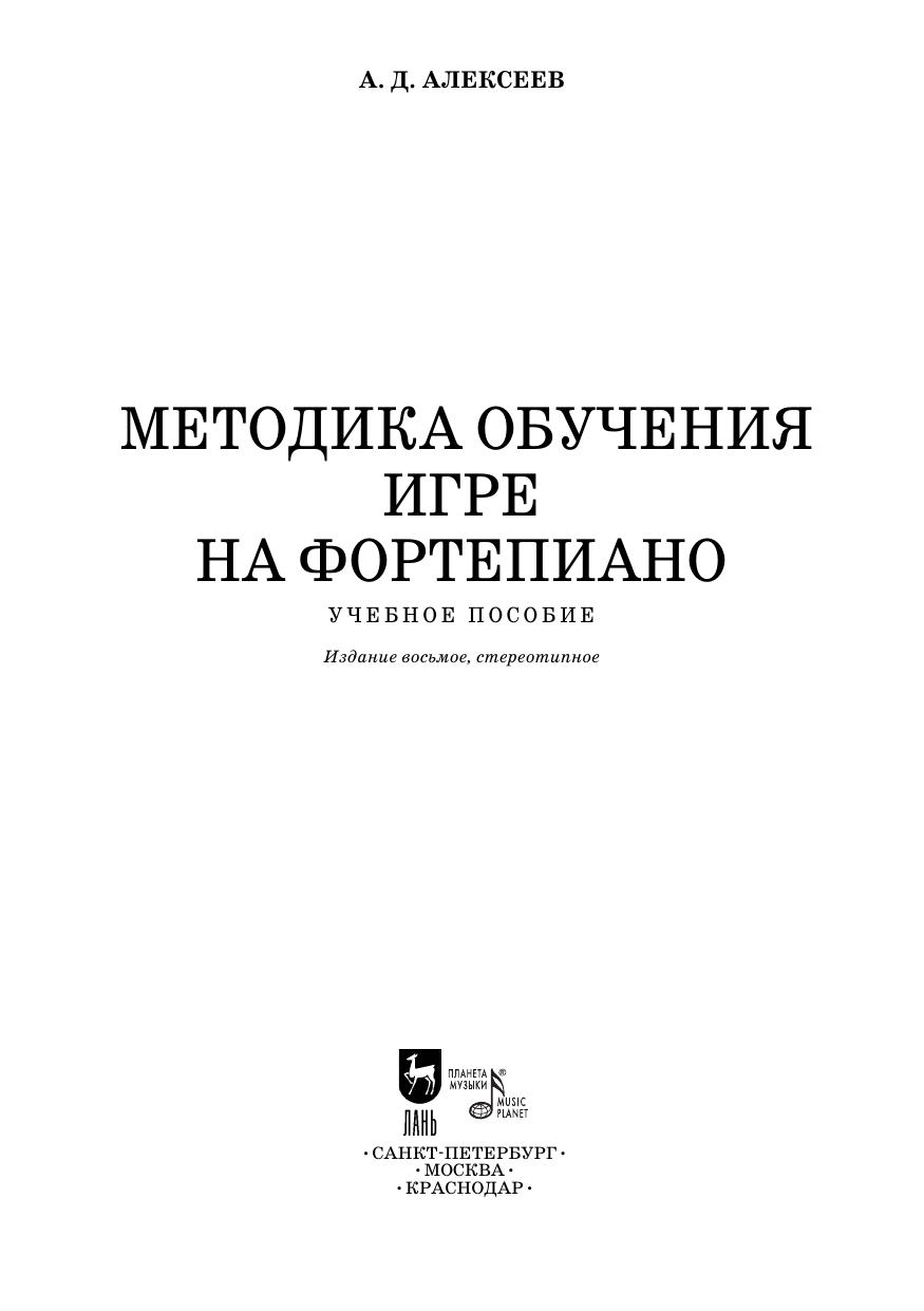 Пособие по курсу методики обучения игре на фортепиано написано известным российским педагогом и музыковедом, профессором А. Д. Алексеевым. Книга снабжена множеством нотных примеров, иллюстрирующих методические положения автора. Учебное пособие предназначено для студентов и преподавателей музыкальных вузов и училищ. Textbook on learning to play the piano was written by famous Russian pedagogue and musicologist, professor A. D. Alekseev. The book is supplied with a number of sheet music illustrating the methodical provisions of the author. The textbook is intended for students and teachers of music universities and colleges