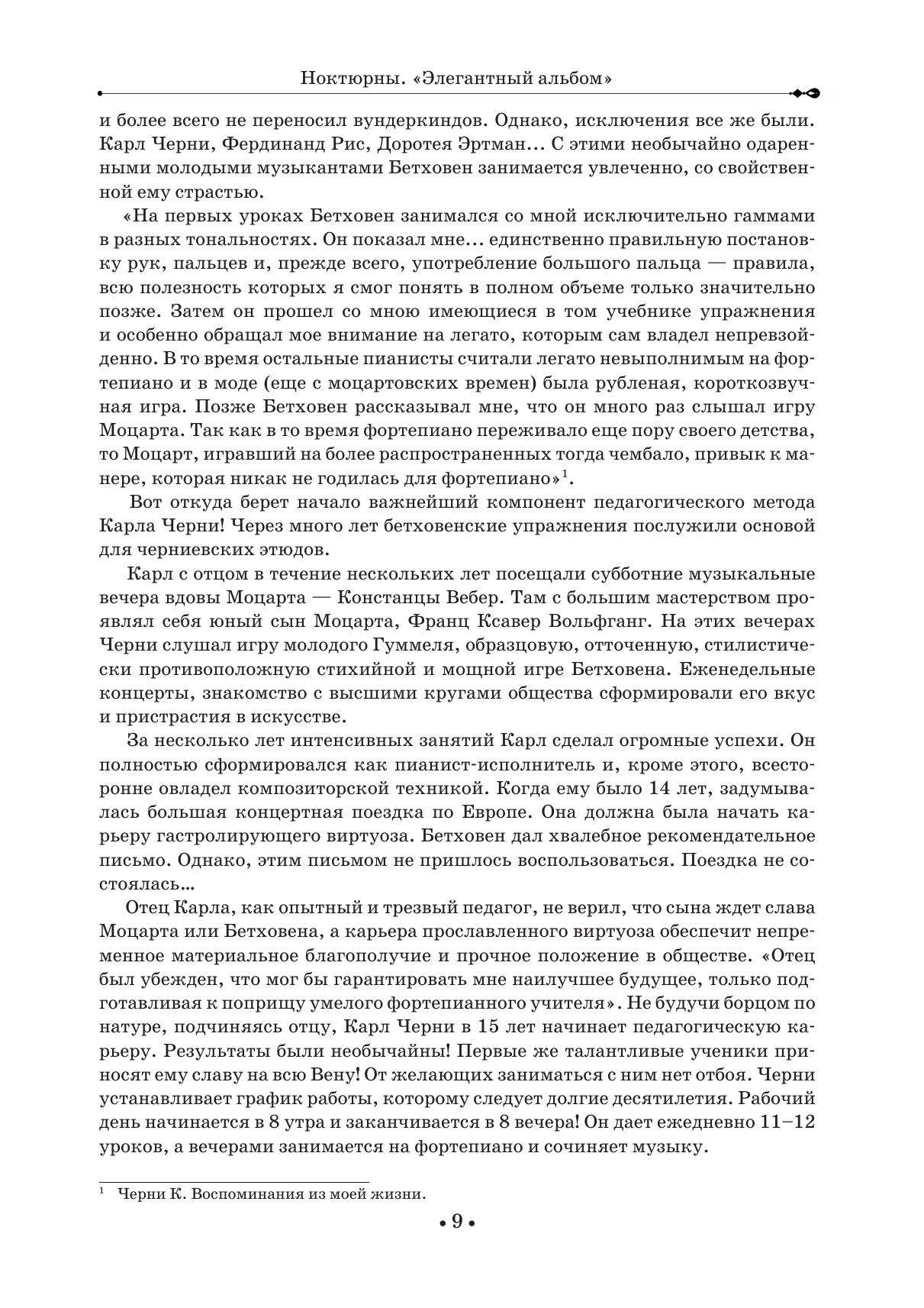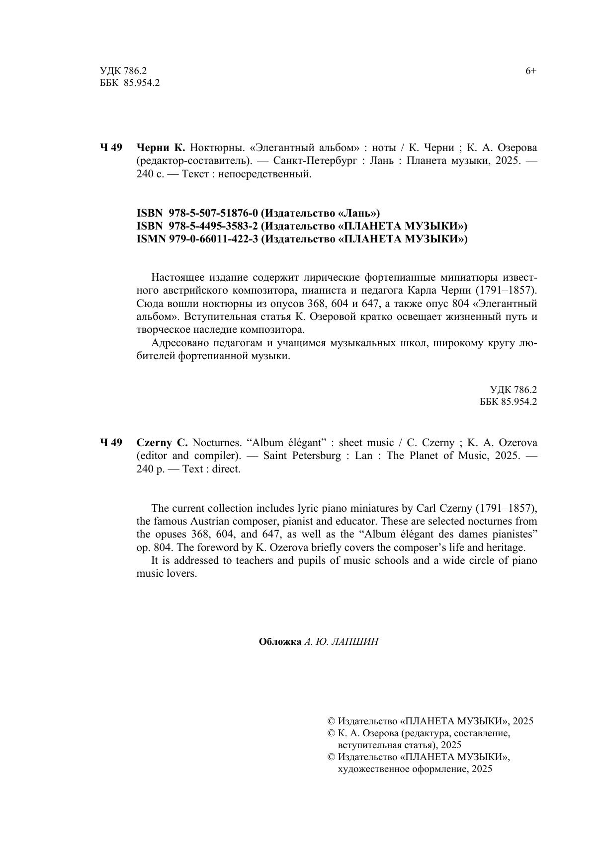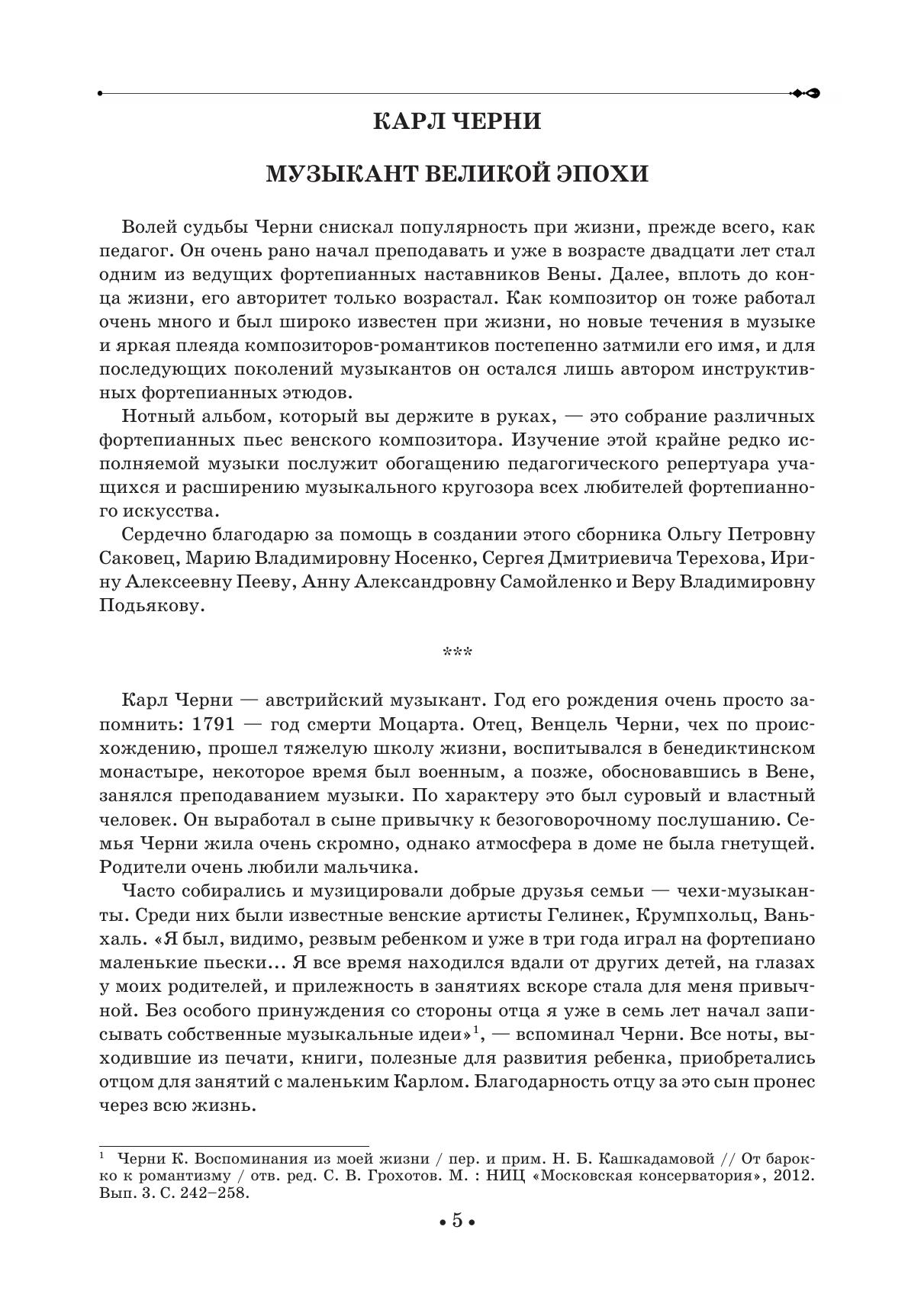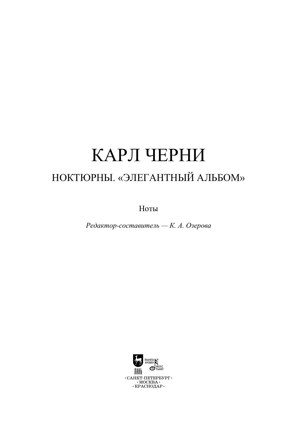 Настоящее издание содержит лирические фортепианные миниатюры известного австрийского композитора, пианиста и педагога Карла Черни (1791–1857). Сюда вошли ноктюрны из опусов 368, 604 и 647, а также опус 804 «Элегантный альбом». Вступительная статья К. Озеровой кратко освещает жизненный путь и творческое наследие композитора. Адресовано педагогам и учащимся музыкальных школ, широкому кругу любителей фортепианной музыки. The current collection includes lyric piano miniatures by Carl Czerny (1791–1857), the famous Austrian composer, pianist and educator. These are selected nocturnes from the opuses 368, 604, and 647, as well as the “Album élégant des dames pianistes” op. 804. The foreword by K. Ozerova briefly covers the composer’s life and heritage. It is addressed to teachers and pupils of music schools and a wide circle of piano music lovers.