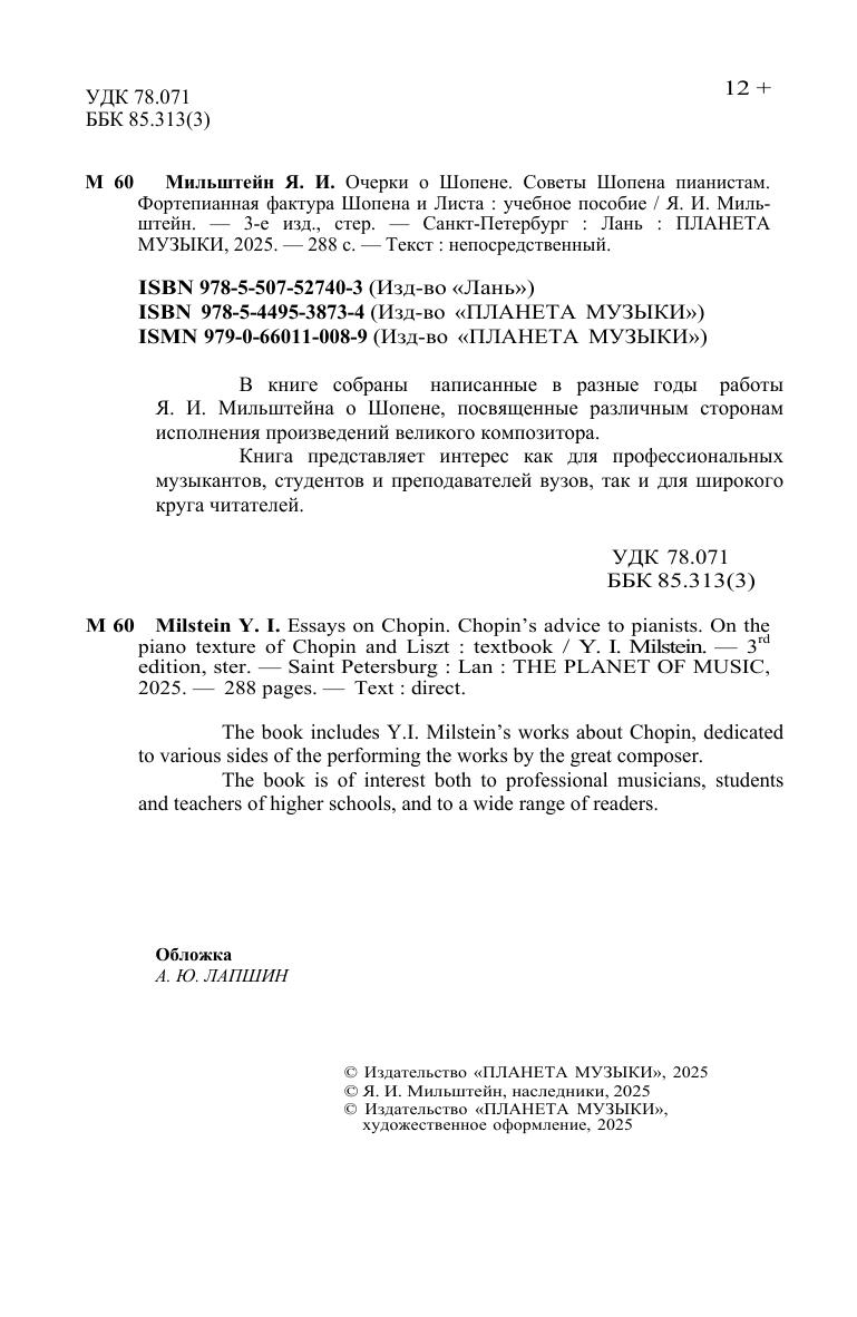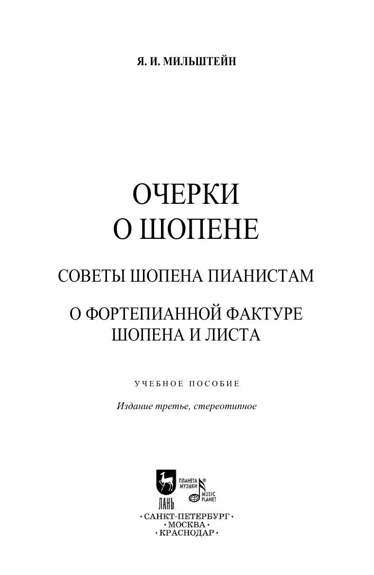 В книге собраны написанные в разные годы работы Я.И. Мильштейна о Шопене, посвященные различным сторонам исполнения произведений великого композитора. Книга представляет интерес как для профессиональных музыкантов, студентов и предодавателей ВУЗов и средне-специальных учебных заведений, так и для широкого круга читателей.