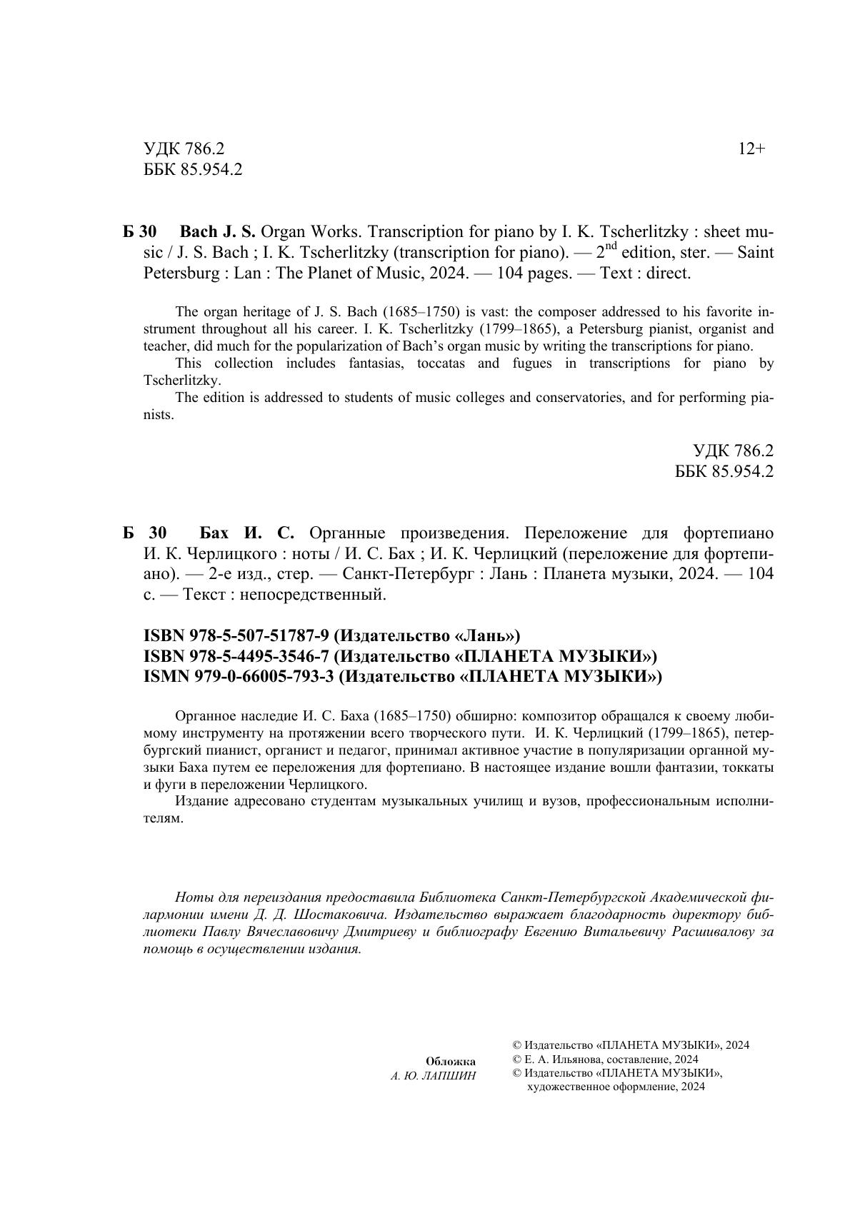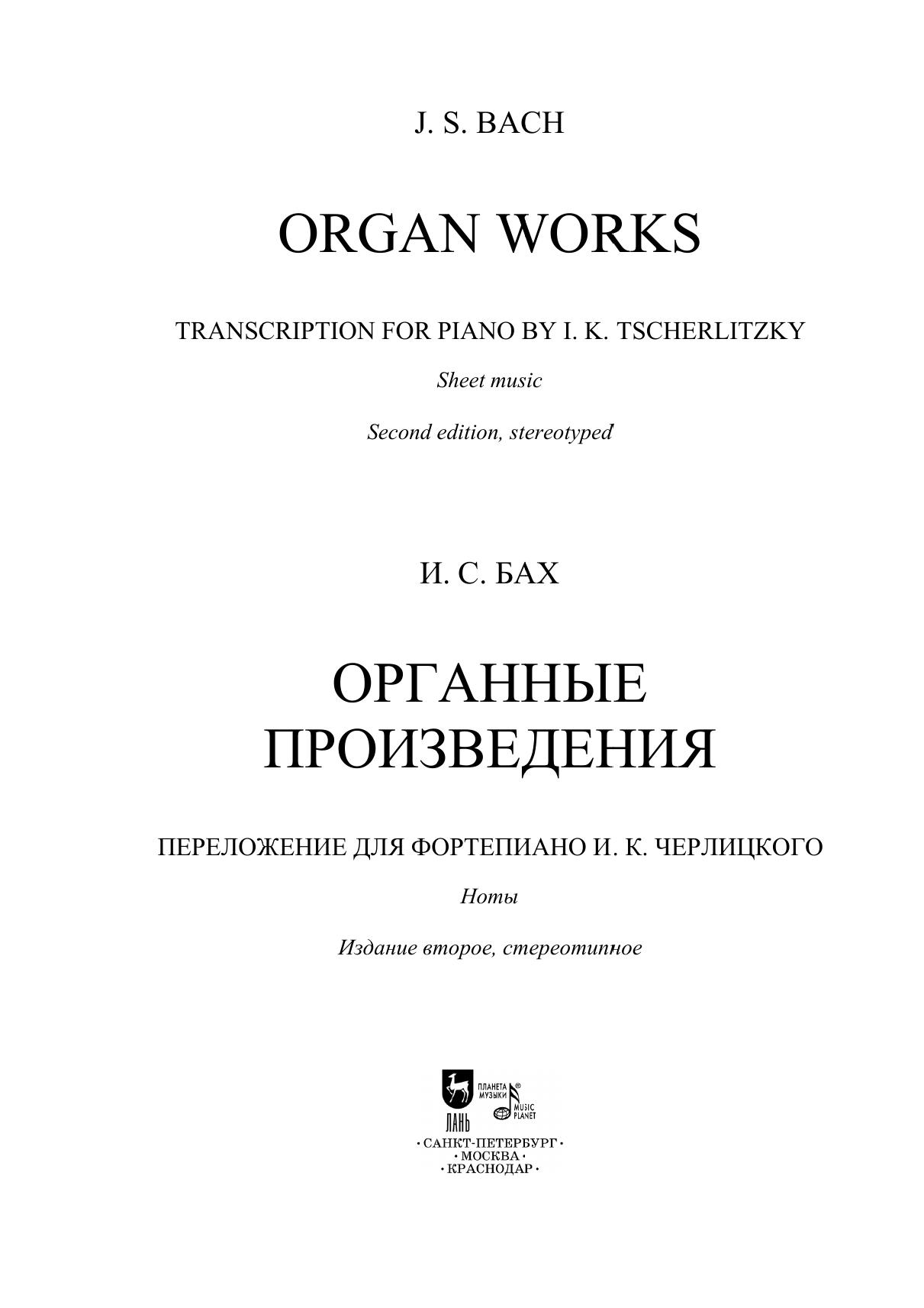 Органное наследие И. С. Баха, 1685-1750 обширно: композитор обращался к своему любимому инструменту на протяжении всего творческого пути. И. К. Черлицкий, 1799-1865, петербургский пианист, органист и педагог, принимал активное участие в популяризации органной музыки Баха путем ее переложения для фортепиано. В настоящее издание вошли прелюдии и фуги в переложении Черлицкого. Адресовано студентам музыкальных училищ и ВУЗов, профессиональным исполнителям.