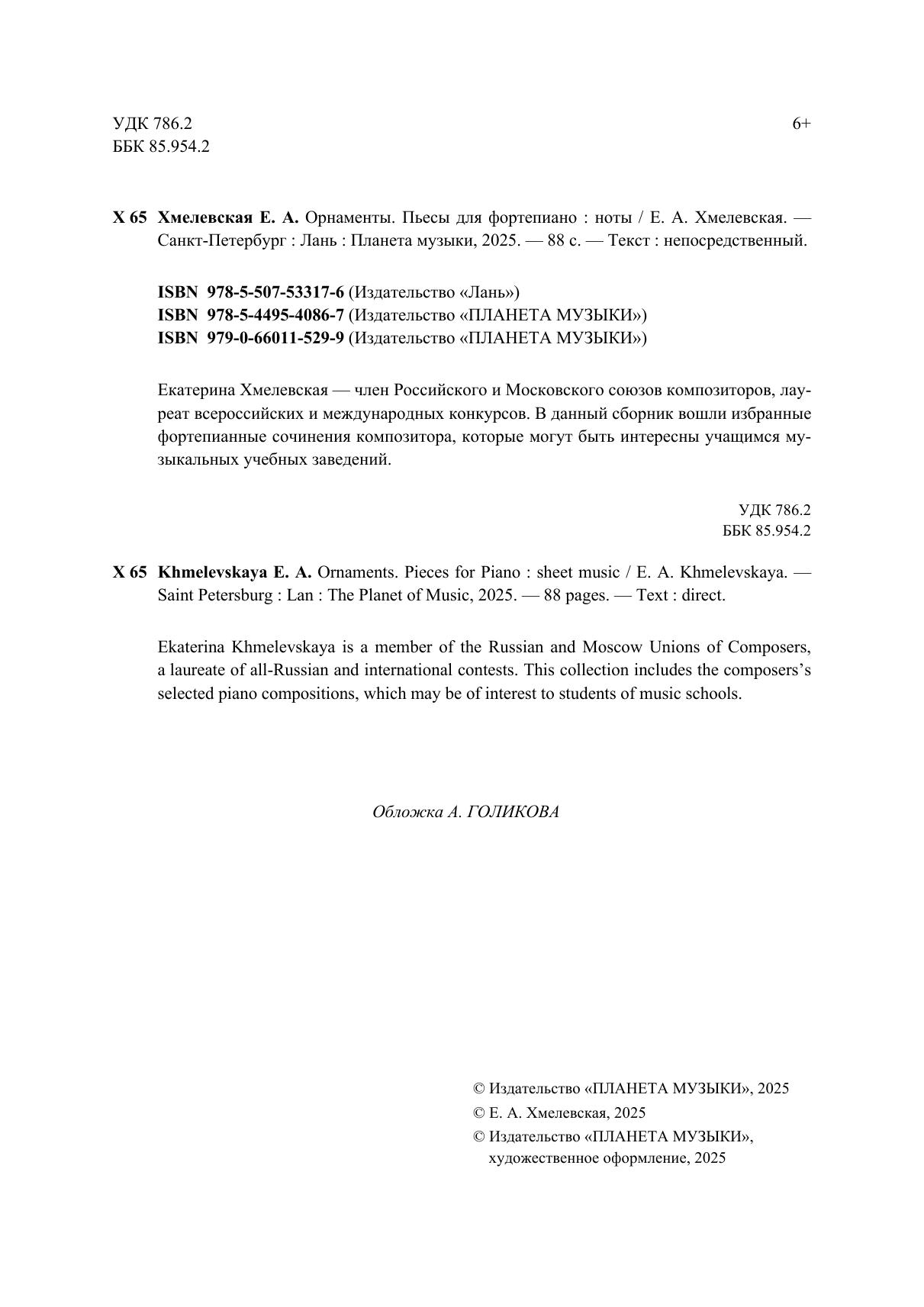 Екатерина Хмелевская - член Российского и Московского союзов композиторов, лауреат всероссийских и международных конкурсов. В данные сборник вошли избранные фортепианные сочинения композитора, которые могут быть интересны учащимся музыкальных учебных заведений. Ekaterina Khmelevskaya is a member of the Russian and Moscow Unions of Composers, a laureate of all-Russian and international contests. This collection includes the composers’s selected piano compositions, which may be of interest to students of music schools.