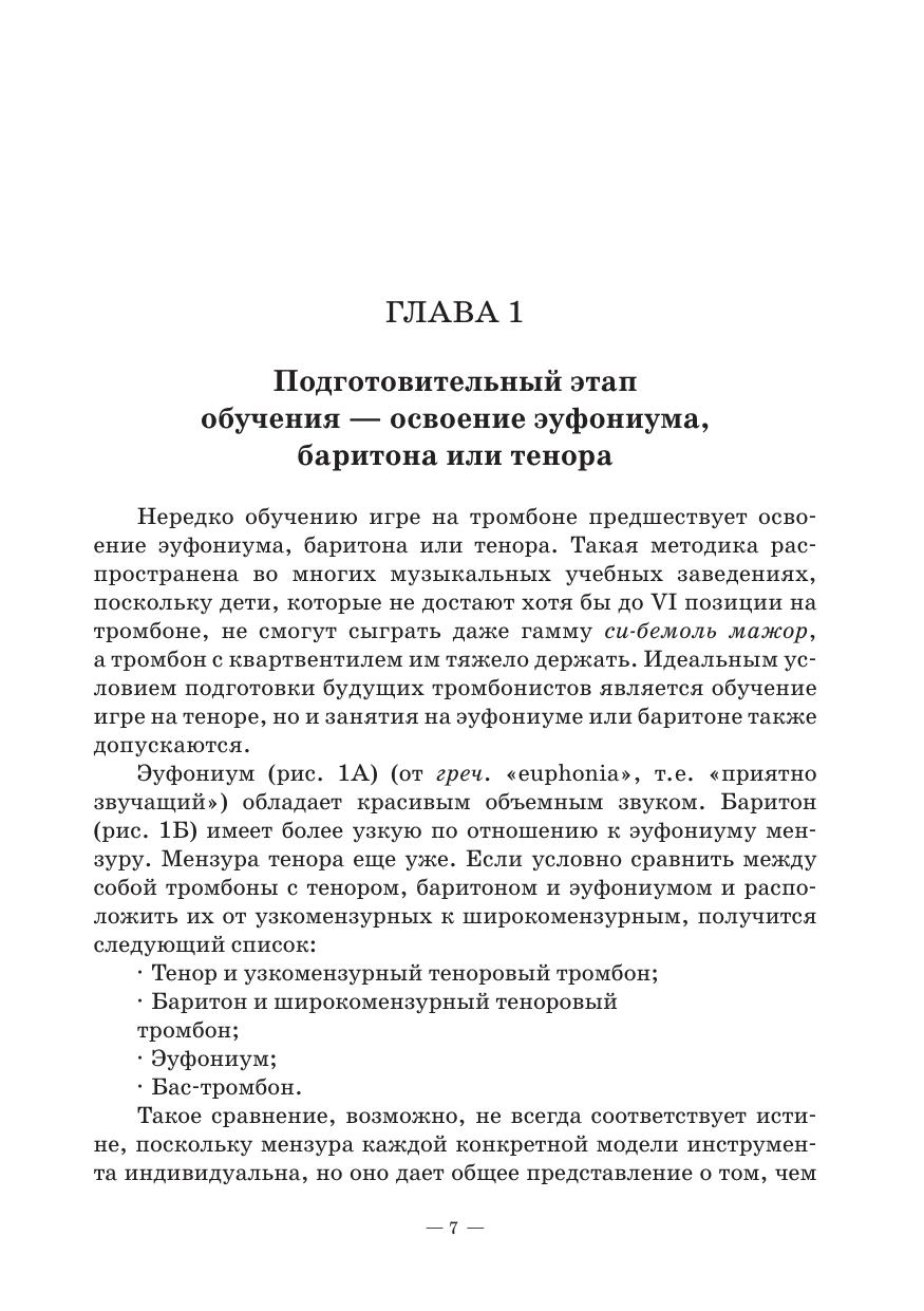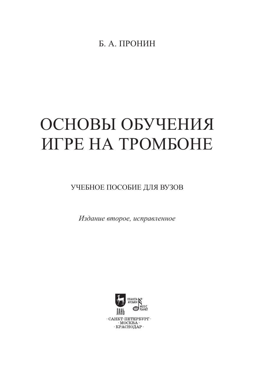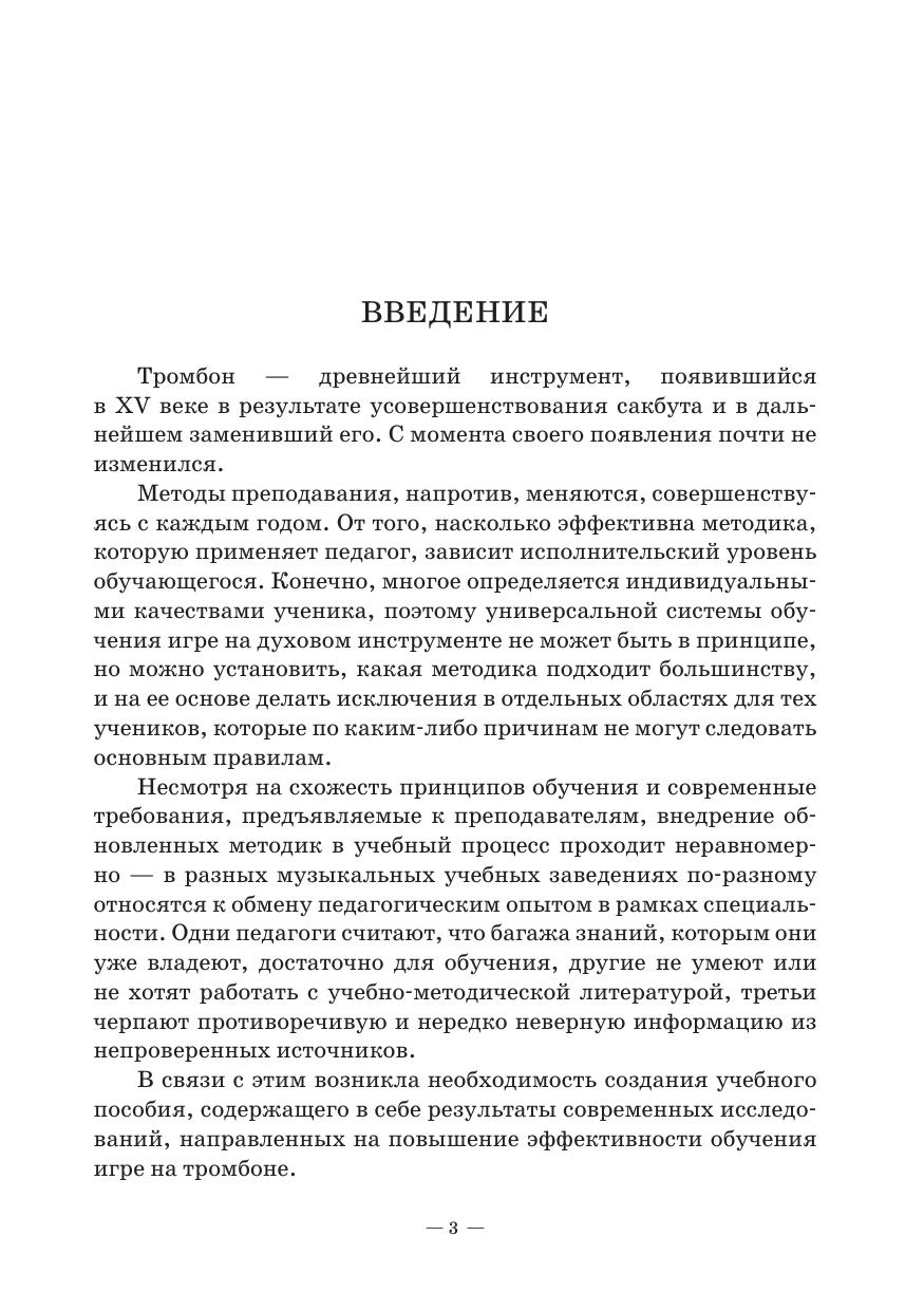 Настоящее учебное пособие включает в себя описание основных этапов освоения тромбона, в том числе подготовительного (обучение игре на эуфониуме, баритоне или теноре). Также в книге рассмотрены способы предотвращения и решения специфических проблем духовиков, представлены основные особенности работы в ансамблях и оркестрах, подробно описаны критерии выбора инструмента и мундштука, а также даны рекомендации по уходу за инструментом. Данная работа подойдет как в качестве учебно-методической базы для начинающих и профессиональных тромбонистов, так и для преподавателей по классу тромбона.