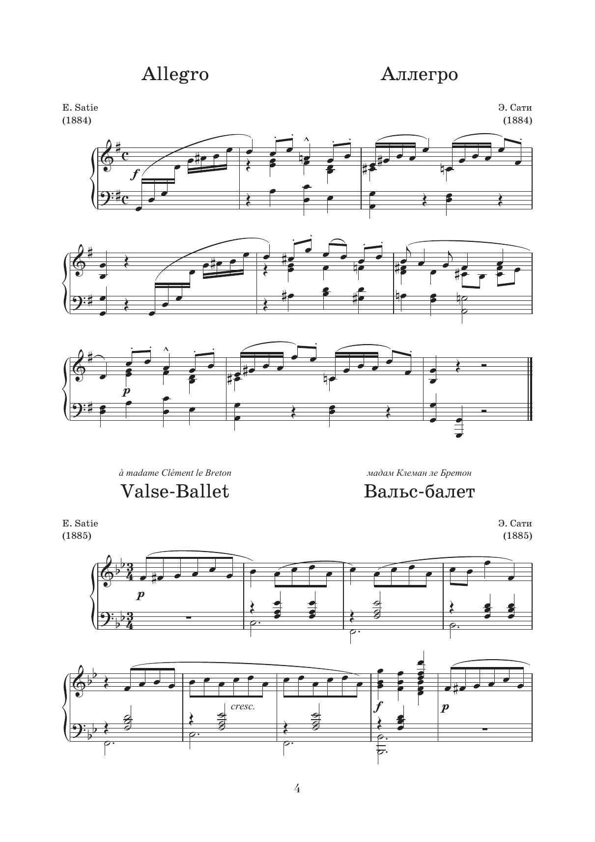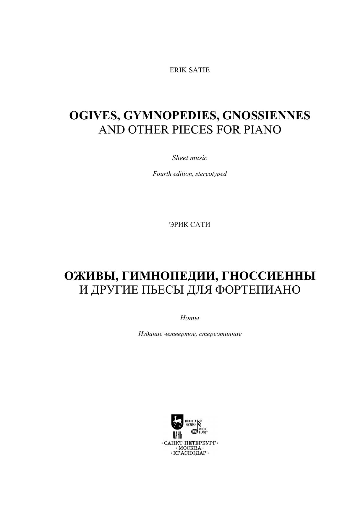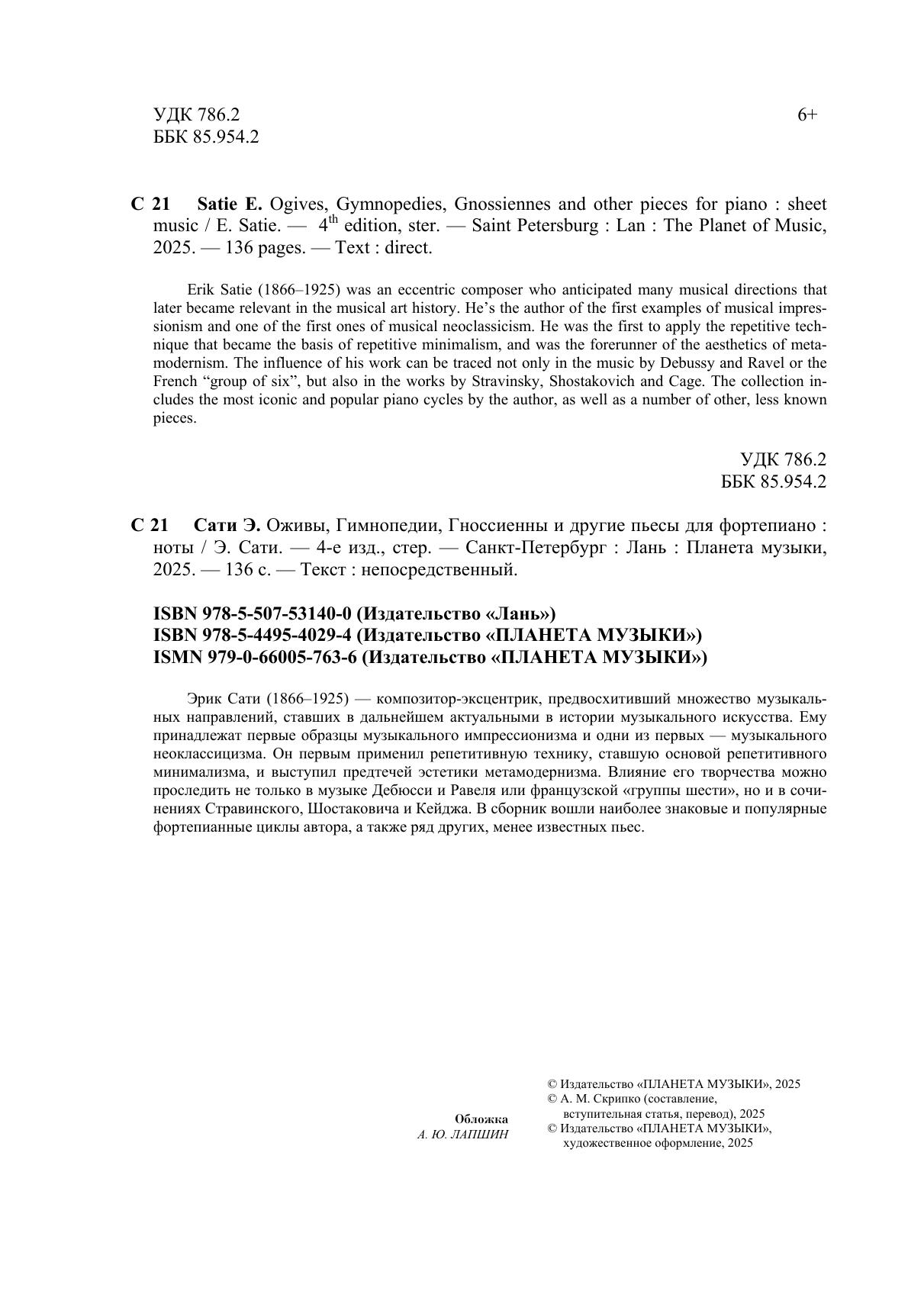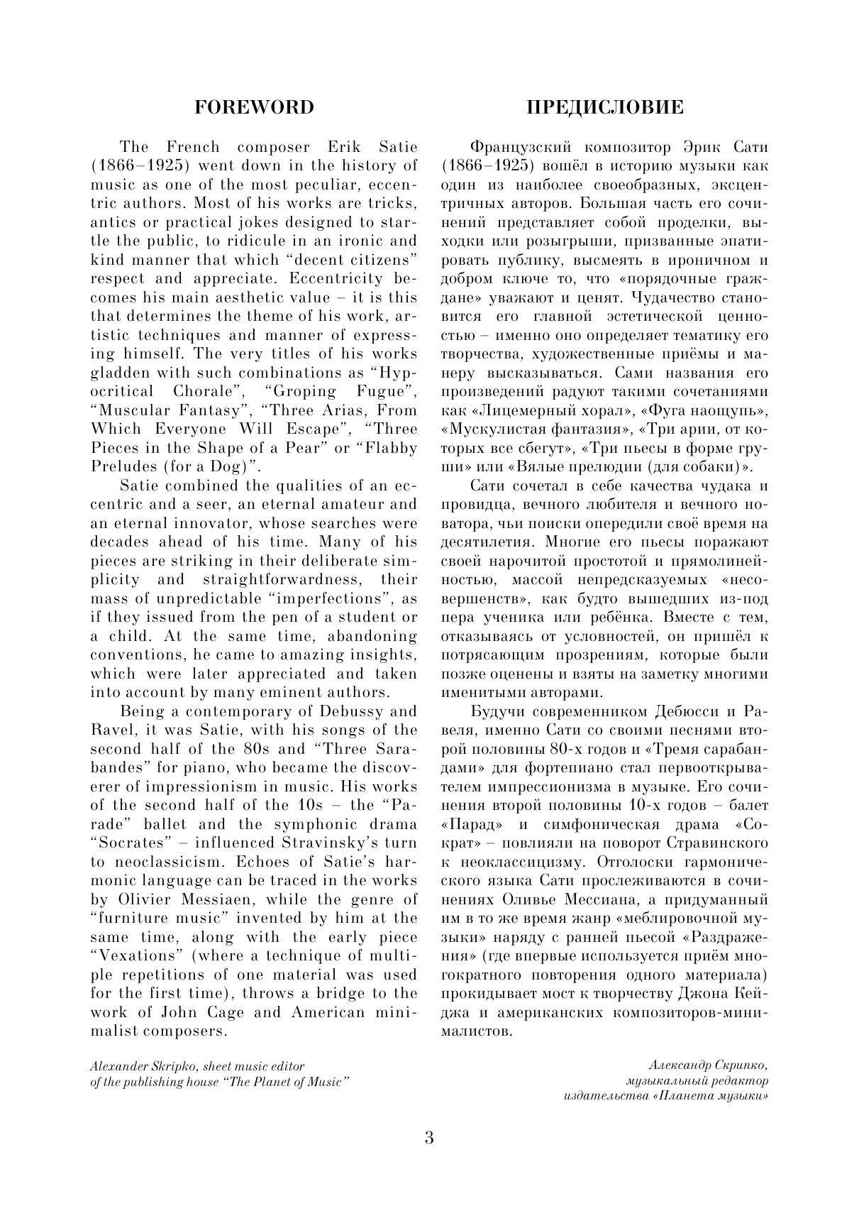Эрик Сати (1866–1925) – композитор-эксцентрик, предвосхитивший множество музыкальных направлений, ставших в дальнейшем актуальными в истории музыкального искусства. Ему принадлежат первые образцы музыкального импрессионизма и одни из первых – музыкального неоклассицизма. Он первым применил репетитивную технику, ставшую основой репетитивного минимализма, и выступил предтечей эстетики метамодернизма. Влияние его творчества можно проследить не только в музыке Дебюсси и Равеля или французской «группы шести», но и в сочинениях Стравинского, Шостаковича и Кейджа. В сборник вошли наиболее знаковые и популярные фортепианные циклы автора, а также ряд других, менее известных пьес. Erik Satie (1866–1925) was an eccentric composer who anticipated many musical directions that later became relevant in the musical art history. He’s the author of the first examples of musical impressionism and one of the first ones of musical neoclassicism. He was the first to apply the repetitive technique that became the basis of repetitive minimalism, and was the forerunner of the aesthetics of metamodernism. The influence of his work can be traced not only in the music by Debussy and Ravel or the French “group of six”, but also in the works by Stravinsky, Shostakovich and Cage. The collection includes the most iconic and popular piano cycles by the author, as well as a number of other, less known pieces.