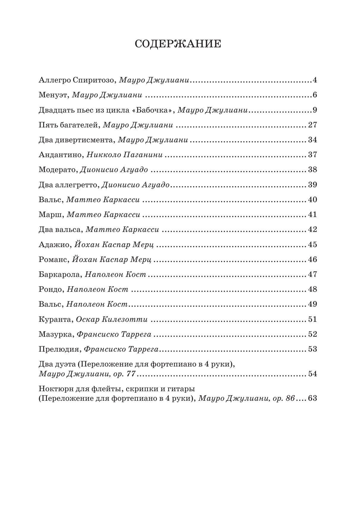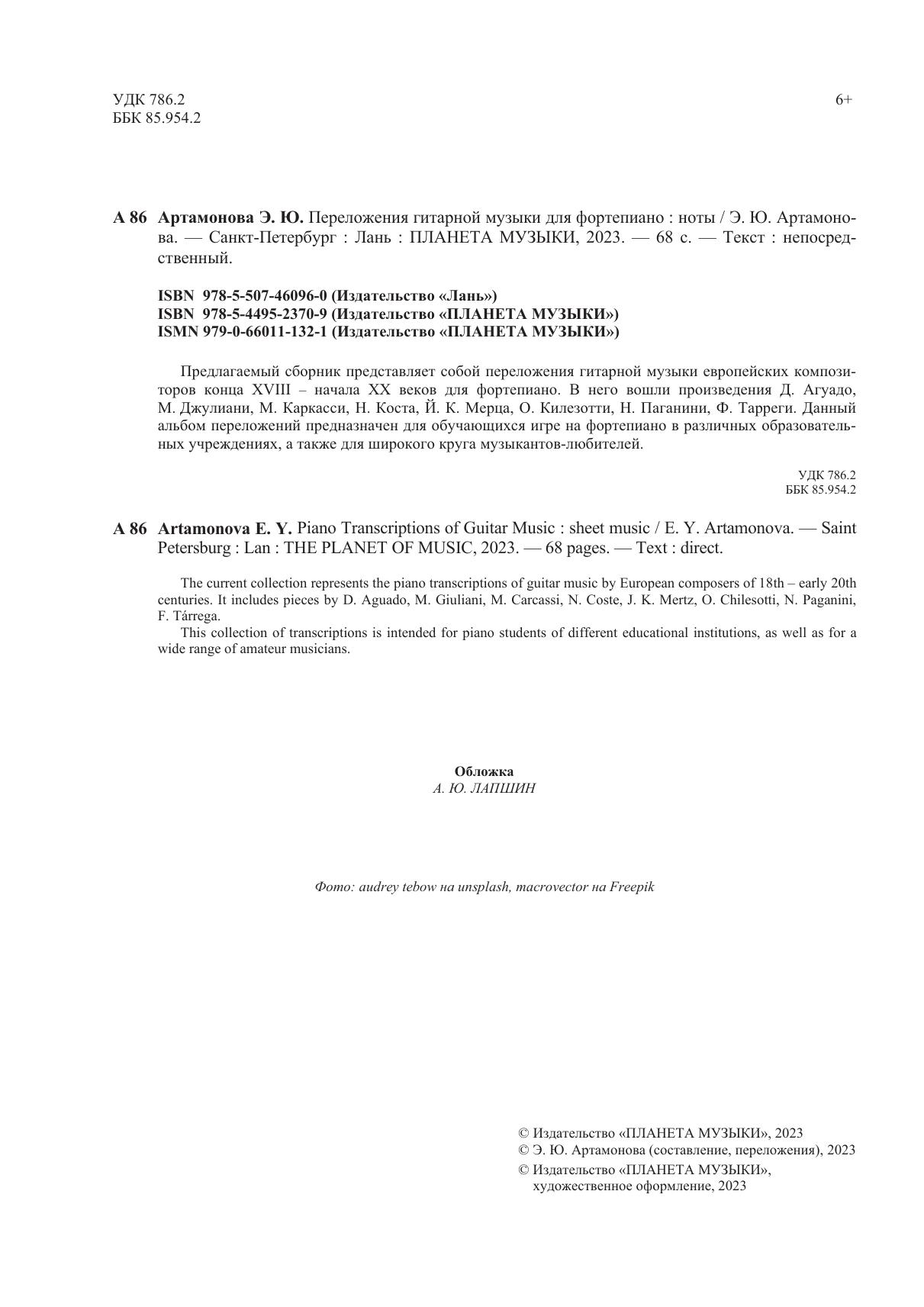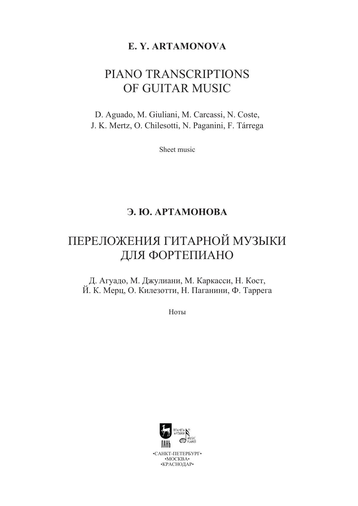 Предлагаемый сборник представляет собой переложения гитарной музыки европейских компози-торов конца XVIII – начала XX веков для фортепиано. В него вошли произведения Д. Агуадо, М. Джулиани, М. Каркасси, Н. Коста, Й. К. Мерца, О. Килезотти, Н. Паганини, Ф. Тарреги. Данный альбом переложений предназначен для обучающихся игре на фортепиано в различных образовательных учреждениях, а также для широкого круга музыкантов-любителей. The current collection represents the piano transcriptions of guitar music by European composers of 18th – early 20th centuries. It includes pieces by D. Aguado, M. Giuliani, M. Carcassi, N. Coste, J. K. Mertz, O. Chilesotti, N. Paganini, F. Tárrega. This collection of transcriptions is intended for piano students of different educational institutions, as well as for a wide range of amateur musicians.
