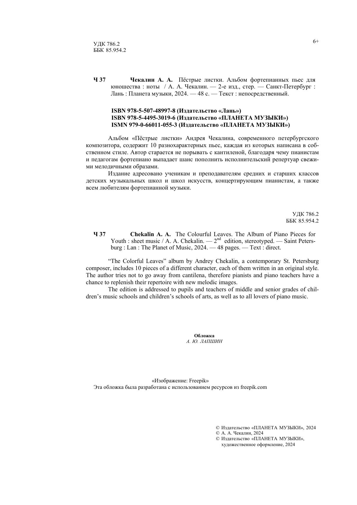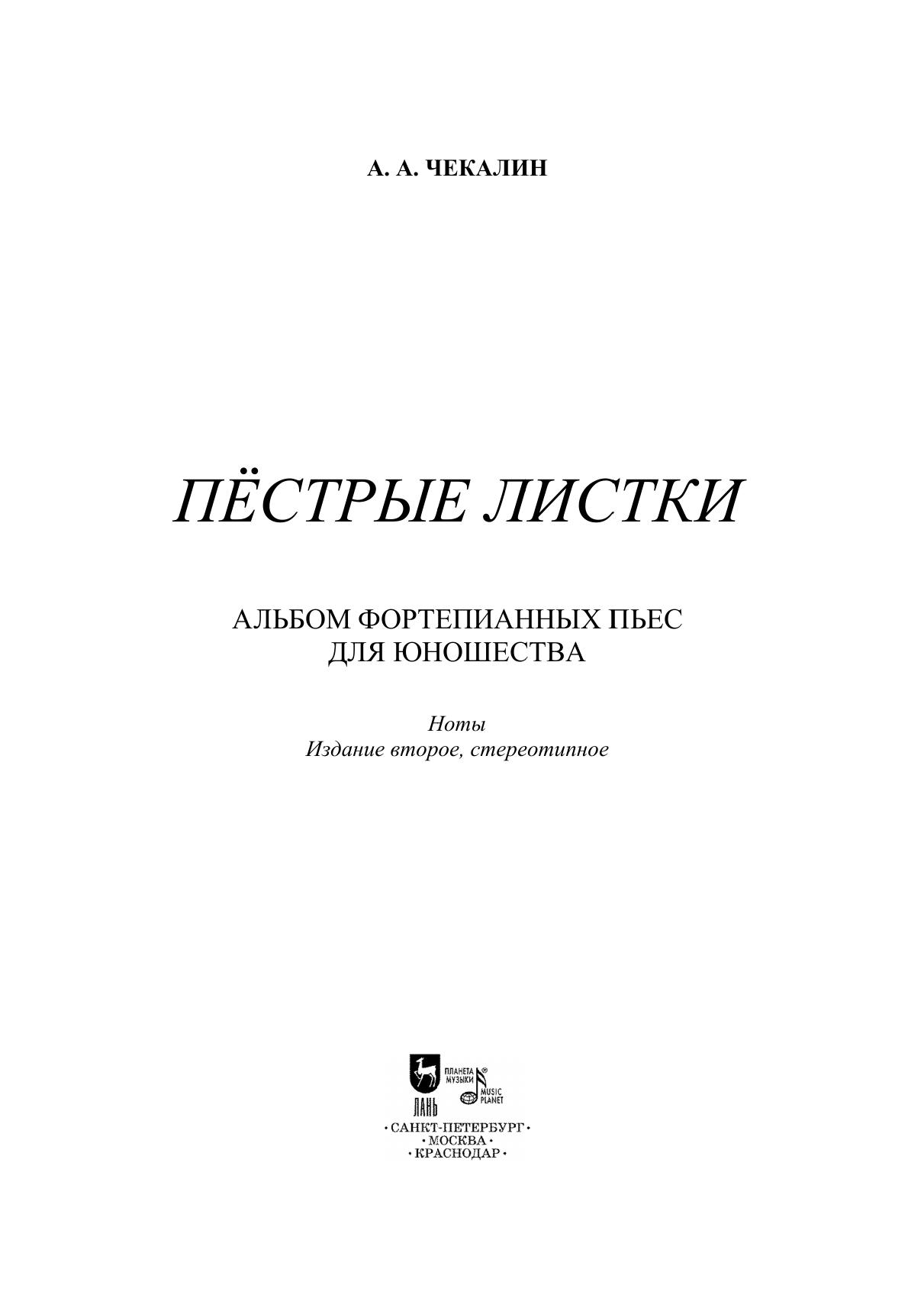 Альбом «Пёстрые листки» Андрея Чекалина, современного петербургского композитора, содержит 10 разнохарактерных пьес, каждая из которых написана в собственном стиле. Автор старается не порывать с кантиленой, благодаря чему пианистам и педагогам фортепиано выпадает шанс пополнить исполнительский репертуар свежими мелодичными образами. Издание адресовано ученикам и преподавателям средних и старших классов детских музыкальных школ и школ искусств, концертирующим пианистам, а также всем любителям фортепианной музыки.