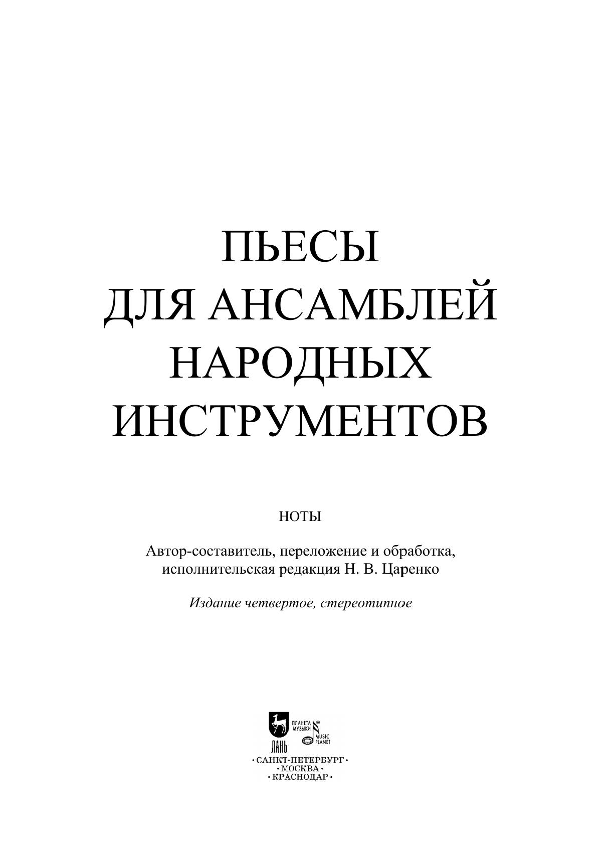 Данный сборник представляет собой переложение русских народных песен, а также другие произведения русских композиторов для ансамблей народных инструментов. Переложения выполнены Н. В. Царенко, преподавателем балалайки и дирижером оркестра русских народных инструментов ДШИ города Архангельска. Издание предназначено для преподавателей и учащихся детских музыкальных школ, детских школ искусств, дворцов и домов культуры, клубов, педагогических учебных заведений и других учреждений, где дети и взрослые обучаются коллективному музицированию. This collection represents the arrangements of Russian folk songs, as well as other works of Russian composers for ensembles of folk instruments. The arrangements were done by N. V. Tsarenko, the balalaika teacher and conductor of the orchestra of Russian folk instruments of children's art school of Arkhangelsk city. The publication is intended for teachers and students of children's music schools, children's art schools, palaces and houses of culture, clubs, pedagogical educational institutions and other institutions where children and adults are trained in collective music making.