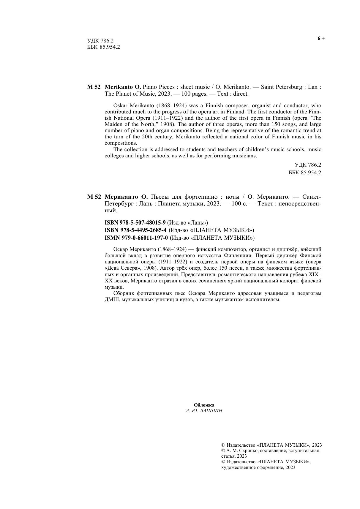 Оскар Мериканто (1868–1924) — финский композитор, органист и дирижёр, внёсший большой вклад в развитие оперного искусства Финляндии. Первый дирижёр Финской национальной оперы (1911–1922) и создатель первой оперы на финском языке (опера «Дева Севера», 1908). Автор трёх опер, более 150 песен, а также множества фортепианных и органных произведений. Представитель романтического направления рубежа XIX–XX веков, Мериканто отразил в своих сочинениях яркий национальный колорит финской музыки. Сборник фортепианных пьес Оскара Мериканто адресован учащимся и педагогам ДМШ, музыкальных училищ и вузов, а также музыкантам-исполнителям. Oskar Merikanto (1868–1924) was a Finnish composer, organist and conductor, who contributed much to the progress of the opera art in Finland. The first conductor of the Finnish National Opera (1911–1922) and the author of the first opera in Finnish (opera “The Maiden of the North,” 1908). The author of three operas, more than 150 songs, and large number of piano and organ compositions. Being the representative of the romantic trend at the turn of the 20th century, Merikanto reflected a national color of Finnish music in his compositions. The collection is addressed to students and teachers of children’s music schools, music colleges and higher schools, as well as for performing musicians.