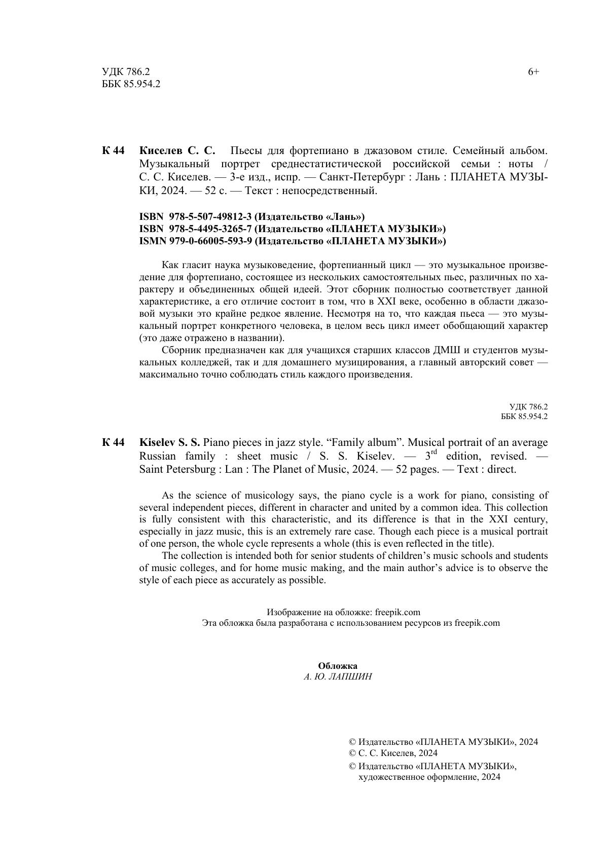 Как гласит наука музыковедение, фортепианный цикл – это музыкальное произведение для фортепиано, состоящее из нескольких самостоятельных пьес, различных по характеру и объединенных общей идеей. Этот сборник полностью соответствует данной характеристике, а его отличие состоит в том, что в XXI веке, особенно в области джазовой музыки это крайне редкое явление. Несмотря на то, что каждая пьеса – это музыкальный портрет конкретного человека, в целом весь цикл имеет обобщающий характер (это даже отражено в названии). Сборник предназначен как для учащихся старших классов ДМШ и студентов музыкальных колледжей, так и для домашнего музицирования, а главный авторский совет – максимально точно соблюдать стиль каждого произведения. As the science of musicology says, the piano cycle is a work for piano, consisting of several independent pieces, different in character and united by a common idea. This collection is fully consistent with this characteristic, and its difference is that in the XXI century, especially in jazz music, this is an extremely rare case. Though each piece is a musical portrait of one person, the whole cycle represents a whole (this is even reflected in the title). The collection is intended both for senior students of children’s music schools and students of music colleges, and for home music making, and the main author’s advice is to observe the style of each piece as accurately as possible.