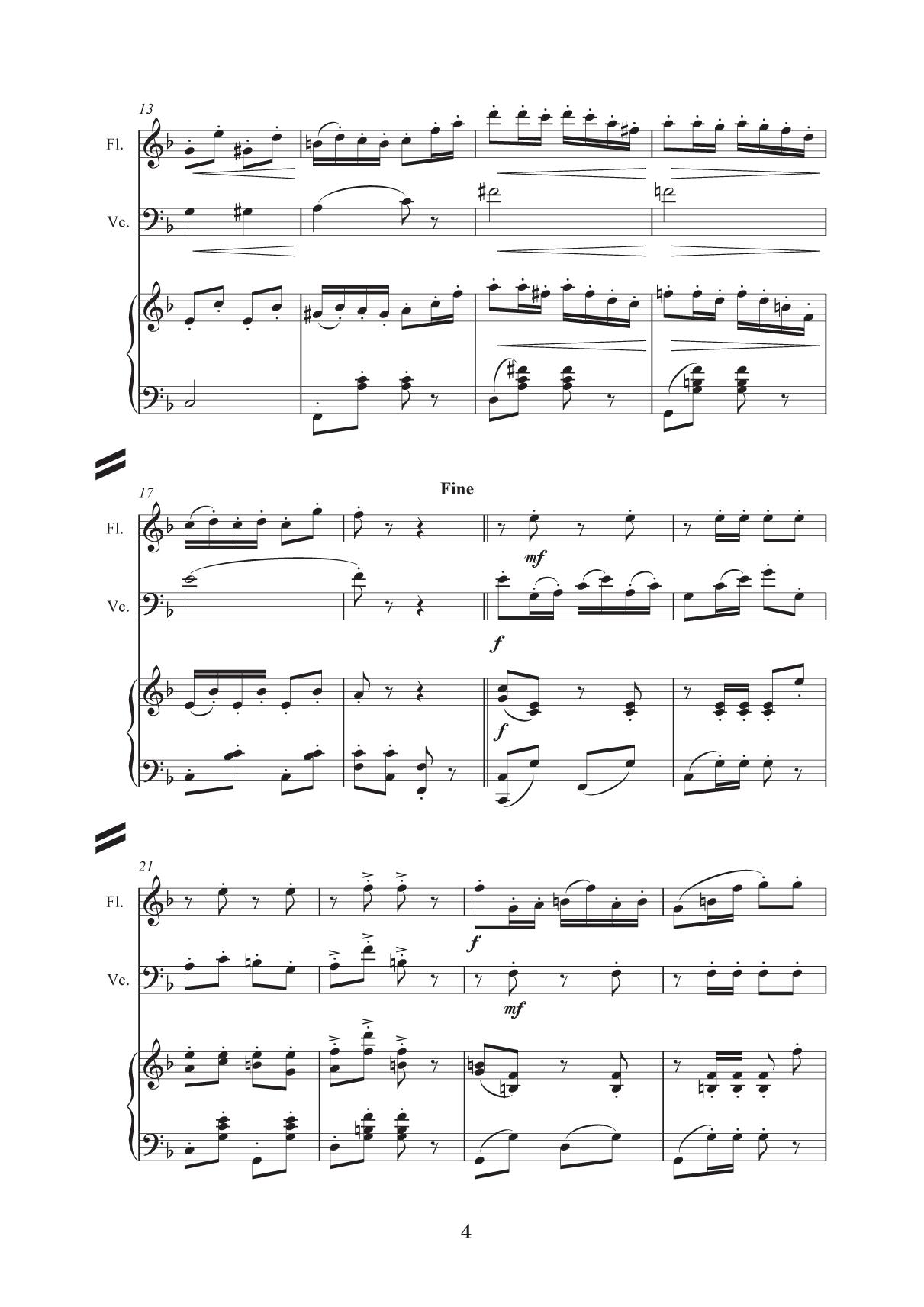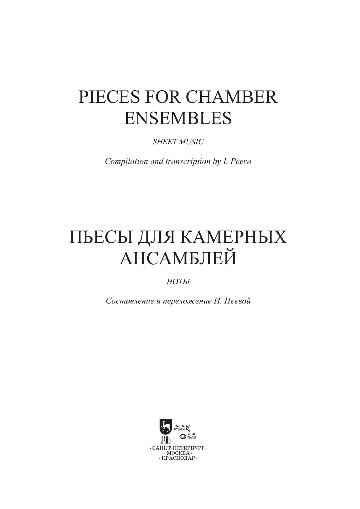 Данный сборник предназначен для учащихся детских музыкальных школ и детских школ искусств, а также для учащихся музыкальных колледжей и вузов. Сборник состоит из тринадцати пьес, которые вошли в репертуар камерных ансамблей СПб ГБУ ДО «Царскосельская гимназия искусств имени Анны Андреевны Ахматовой». Аранжировки сделаны с учётом технических возможностей учащихся средних и старших классов. Исключительно все пьесы впервые аранжированы для данных составов. Целью сборника является расширение репертуара камерных ансамблей в разных составах в сопровождении фортепиано: флейта (скрипка) и виолончель, скрипка и виолончель, флейта, скрипка и виолончель, три скрипки и виолончель. Особо хочется отметить, что в сборник, наряду с известными и популярными пьесами В. Бибергана, А. Петрова, вошла обработка «Танца козлоногих» из балета-пантомимы для оркестра русского композитора Ильи Саца «Козлоногие» (1912 г.). Этот танец неоднократно упоминался поэтами Серебряного века, в том числе А. Ахматовой в «Поэме без героя», и приводил в восторг завсегдатаев «Бродячей собаки» в исполнении блистательной танцовщицы Ольги Глебовой-Судейкиной. Первое и единственное издание партитуры хранится в Музыкальной библиотеке Санкт-Петербургской академической филармонии им. Д. Д. Шостаковича. Об исполнении этой музыки практически ничего не известно. This collection is intended for chamber ensembles of children’s music schools and children’s schools of arts, as well as for students of music colleges and higher schools. The collection consists of thirteen pieces that were included in the repertoire of the chamebr ensembles of St. Petersburg State BEI “Tsarskoye Selo Anna Andreevna Akhmatova Gymnasium of Arts”. Arrangements and transcriptions are made taking in view the technical capabilities of middle and high school pupils. All the pieces were arranged for these chamber ensembles for the first time. The collection's aim is to expand a repertoire of different chamber ensembles including piano: flute (violin) and cello, violin and cello, flute, violin and cello, three violins and cello. It should be mentioned that the collection, along with the well-known and popular pieces by V. Bibergan, A. Petrov includes the arrangement of the “Dance of the Goat-Legged” from the pantomime ballet for the orchestra “The Goat-Legged” (1912) by the Russian composer Ilya Sats. This dance was repeatedly mentioned by poets of the Silver Age, including A. Akhmatova in “A Poem without a Hero”, and delighted the habitues of the “Stray Dog” café, performed by the brilliant dancer Olga Glebova-Sudeikina. The first and only edition of the score is stored in the Musical Library of the St. Petersburg D. D. Shostakovich Academic Philharmonic. Almost nothing is known about the performance of this music.