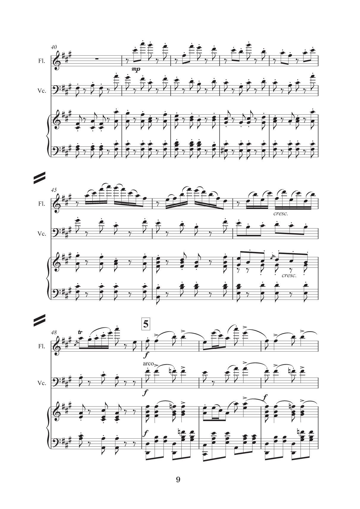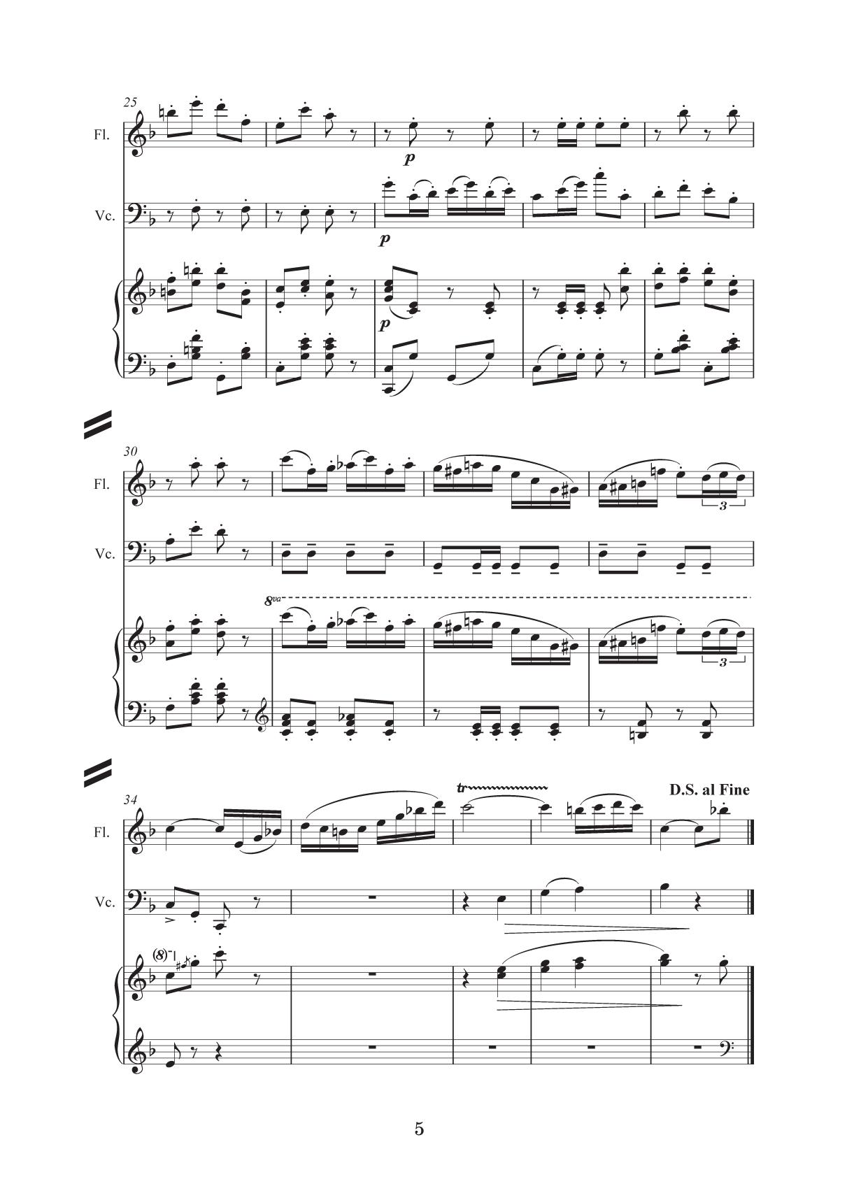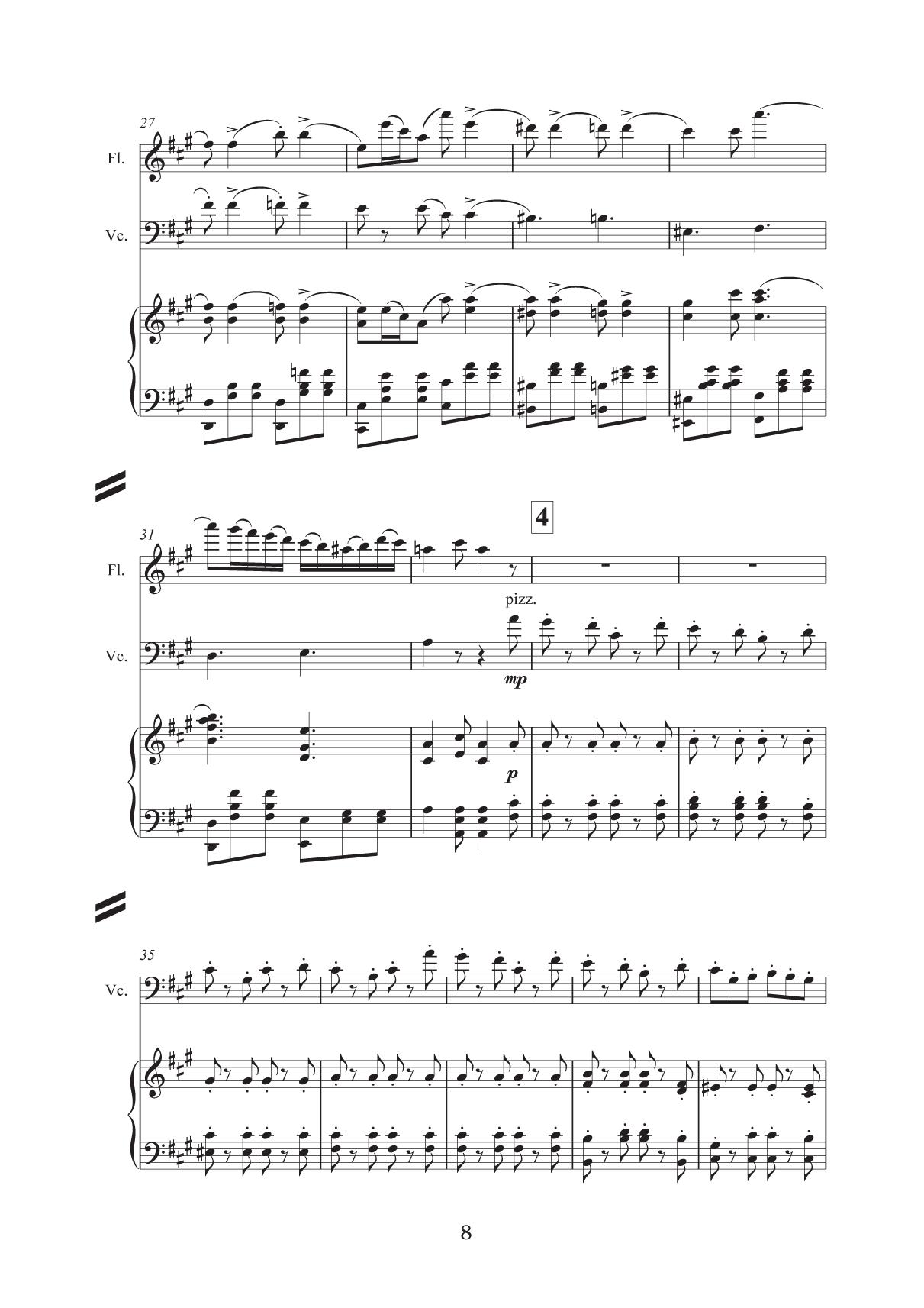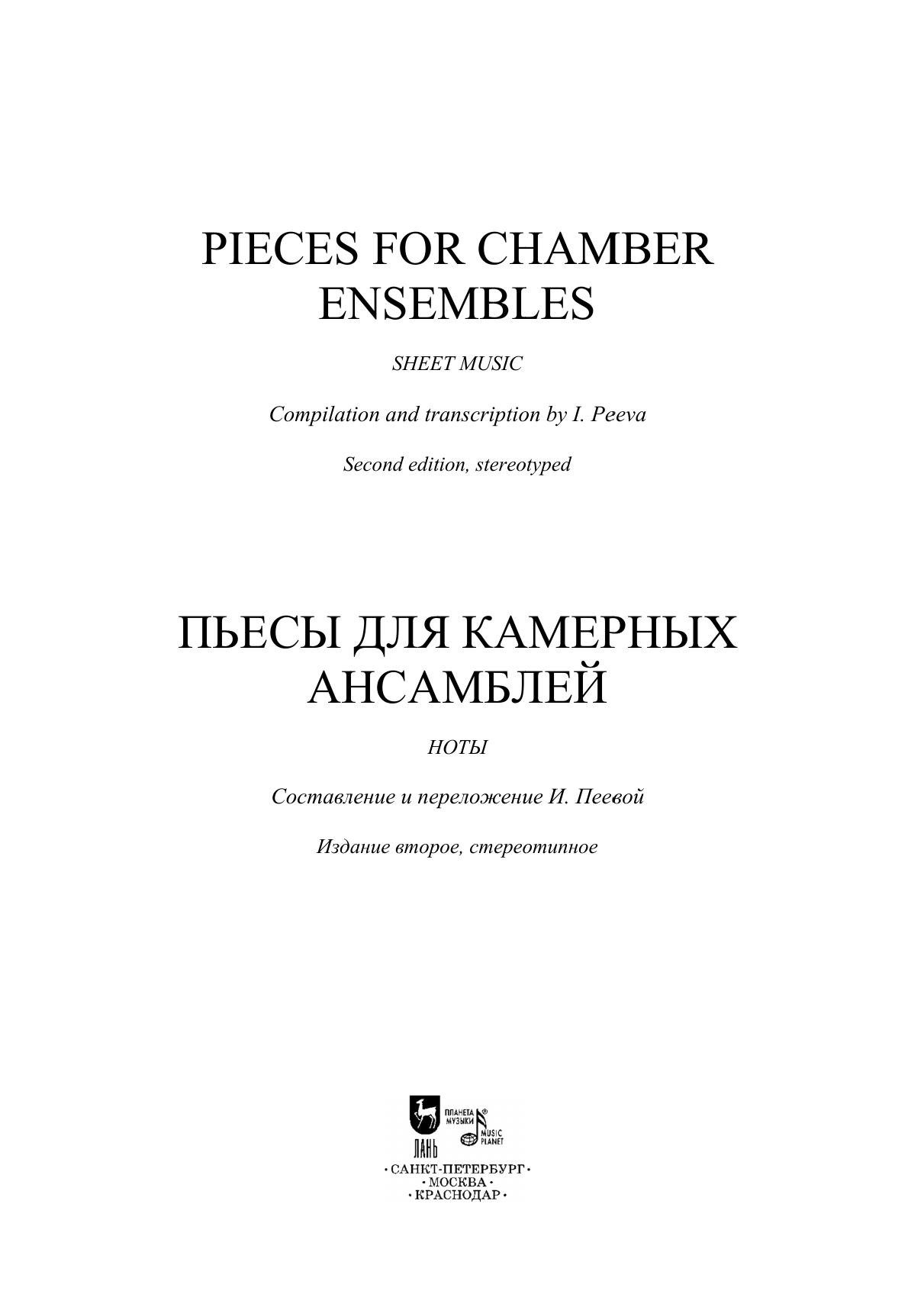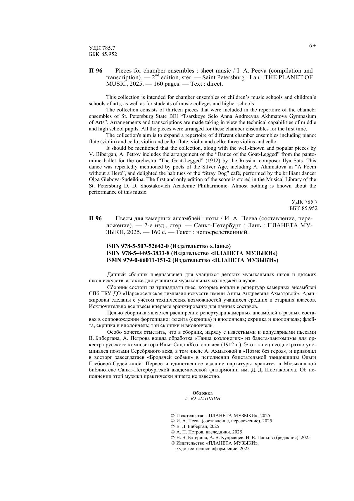 Данный сборник предназначен для учащихся детских музыкальных школ и детских школ искусств, а также для учащихся музыкальных колледжей и вузов. Сборник состоит из тринадцати пьес, которые вошли в репертуар камерных ансамблей СПб ГБУ ДО «Царскосельская гимназия искусств имени Анны Андреевны Ахматовой». Аранжировки сделаны с учётом технических возможностей учащихся средних и старших классов. Исключительно все пьесы впервые аранжированы для данных составов. Целью сборника является расширение репертуара камерных ансамблей в разных составах в сопровождении фортепиано: флейта (скрипка) и виолончель, скрипка и виолончель, флейта, скрипка и виолончель, три скрипки и виолончель. Особо хочется отметить, что в сборник, наряду с известными и популярными пьесами В. Бибергана, А. Петрова, вошла обработка «Танца козлоногих» из балета-пантомимы для оркестра русского композитора Ильи Саца «Козлоногие» (1912 г.). Этот танец неоднократно упоминался поэтами Серебряного века, в том числе А. Ахматовой в «Поэме без героя», и приводил в восторг завсегдатаев «Бродячей собаки» в исполнении блистательной танцовщицы Ольги Глебовой-Судейкиной. Первое и единственное издание партитуры хранится в Музыкальной библиотеке Санкт-Петербургской академической филармонии им. Д. Д. Шостаковича. Об исполнении этой музыки практически ничего не известно. This collection is intended for chamber ensembles of children’s music schools and children’s schools of arts, as well as for students of music colleges and higher schools. The collection consists of thirteen pieces that were included in the repertoire of the chamebr ensembles of St. Petersburg State BEI “Tsarskoye Selo Anna Andreevna Akhmatova Gymnasium of Arts”. Arrangements and transcriptions are made taking in view the technical capabilities of middle and high school pupils. All the pieces were arranged for these chamber ensembles for the first time. The collection's aim is to expand a repertoire of different chamber ensembles including piano: flute (violin) and cello, violin and cello, flute, violin and cello, three violins and cello. It should be mentioned that the collection, along with the well-known and popular pieces by V. Bibergan, A. Petrov includes the arrangement of the “Dance of the Goat-Legged” from the pantomime ballet for the orchestra “The Goat-Legged” (1912) by the Russian composer Ilya Sats. This dance was repeatedly mentioned by poets of the Silver Age, including A. Akhmatova in “A Poem without a Hero”, and delighted the habitues of the “Stray Dog” café, performed by the brilliant dancer Olga Glebova-Sudeikina. The first and only edition of the score is stored in the Musical Library of the St. Petersburg D. D. Shostakovich Academic Philharmonic. Almost nothing is known about the performance of this music.