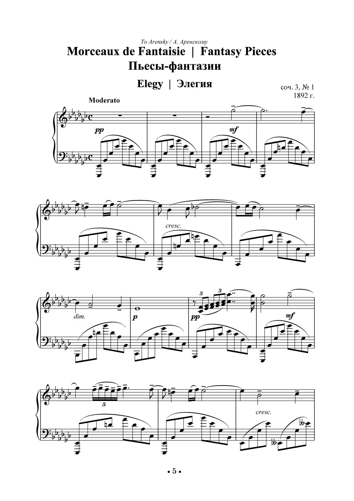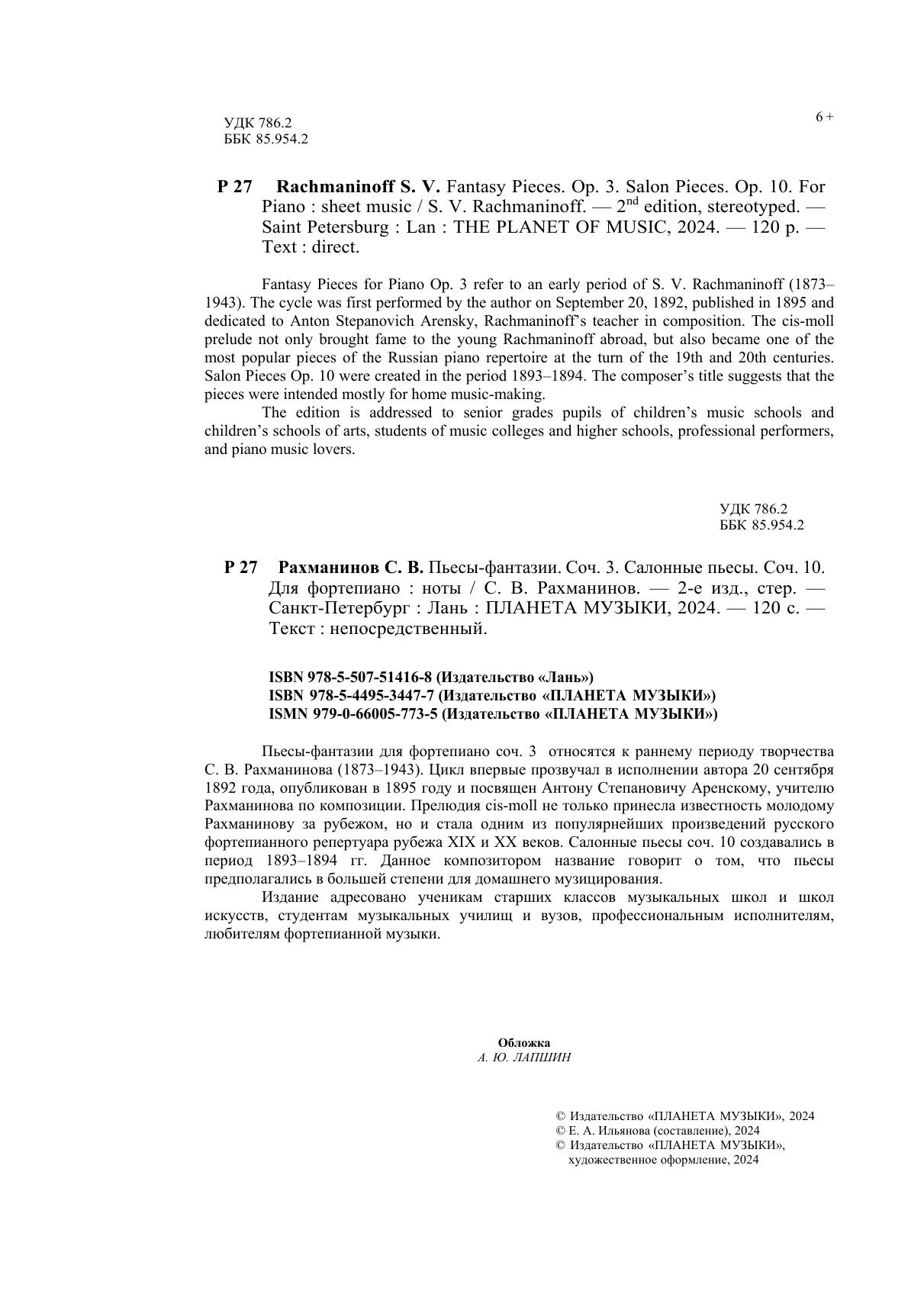 Пьесы-фантазии для фортепиано соч. 3 относятся к раннему периоду творчества С. В. Рахманинова (1873-1943). Цикл впервые прозвучал в исполнении автора 20 сентября 1892 года, опубликован в 1895 году и посвящен Антону Степановичу Аренскому, учителю Рахманинова по композиции. Прелюдия cis-moll не только принесла известность молодому Рахманинову за рубежом, но и стала одним из популярнейших произведений русского фортепианного репертуара рубежа XIX и XX веков. Салонные пьесы соч. 10 создавались в период 1893-1894 гг. Данное композитором название говорит о том, что пьесы предполагались в большей степени для домашнего музицирования. Издание адресовано ученикам старших классов музыкальных школ и школ искусств, студентам музыкальных училищ и вузов, профессиональным исполнителям, любителям фортепианной музыки. Fantasy Pieces for Piano Op. 3 refer to an early period of S. V. Rachmaninoff (1873–1943). The cycle was first performed by the author on September 20, 1892, published in 1895 and dedicated to Anton Stepanovich Arensky, Rachmaninoff’s teacher in composition. The cis-moll prelude not only brought fame to the young Rachmaninoff abroad, but also became one of the most popular pieces of the Russian piano repertoire at the turn of the 19th and 20th centuries. Salon Pieces Op. 10 were created in the period 1893–1894. The composer’s title suggests that the pieces were intended mostly for home music-making. The edition is addressed to senior grades pupils of children’s music schools and children’s schools of arts, students of music colleges and higher schools, professional performers, and piano music lovers.
