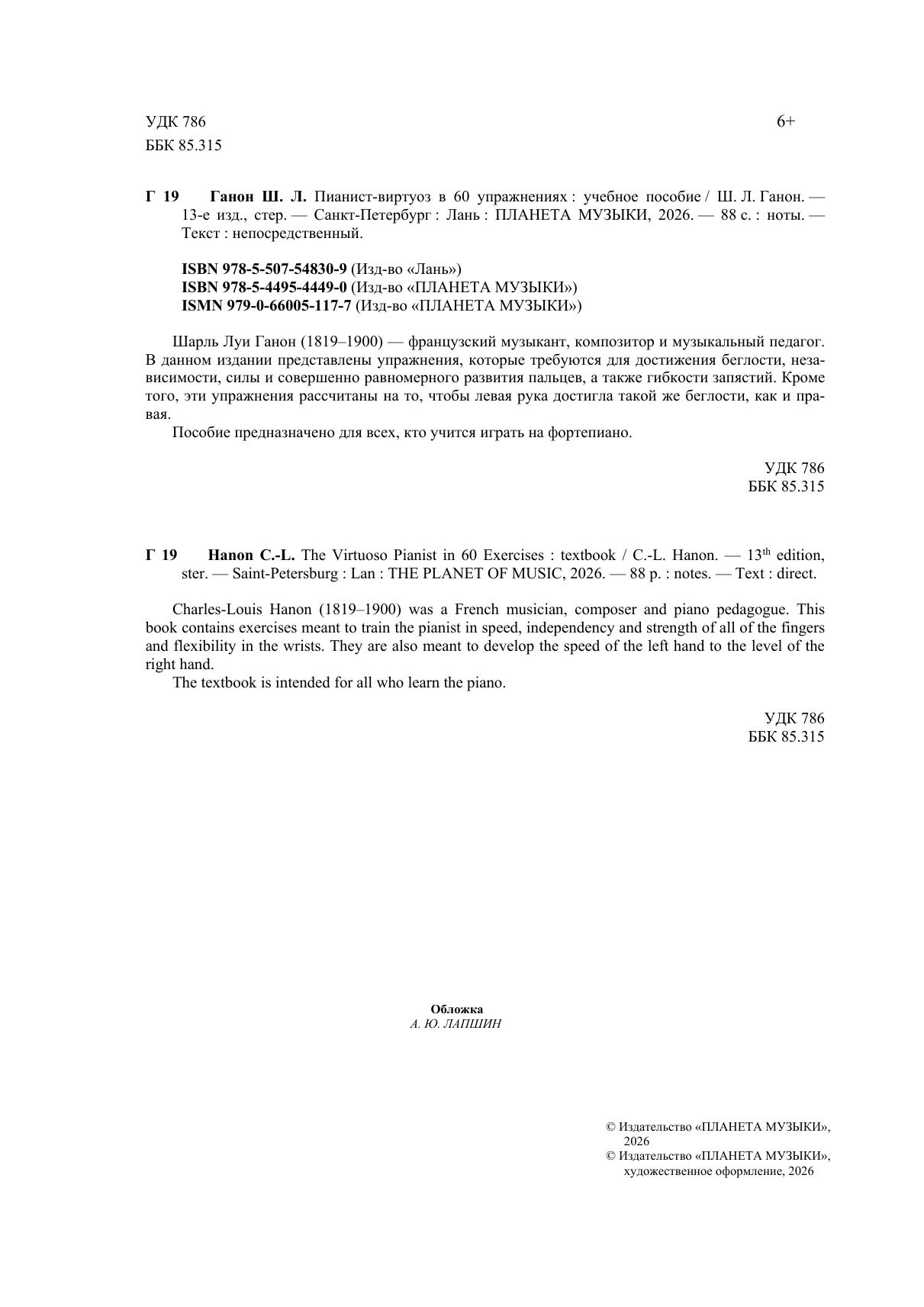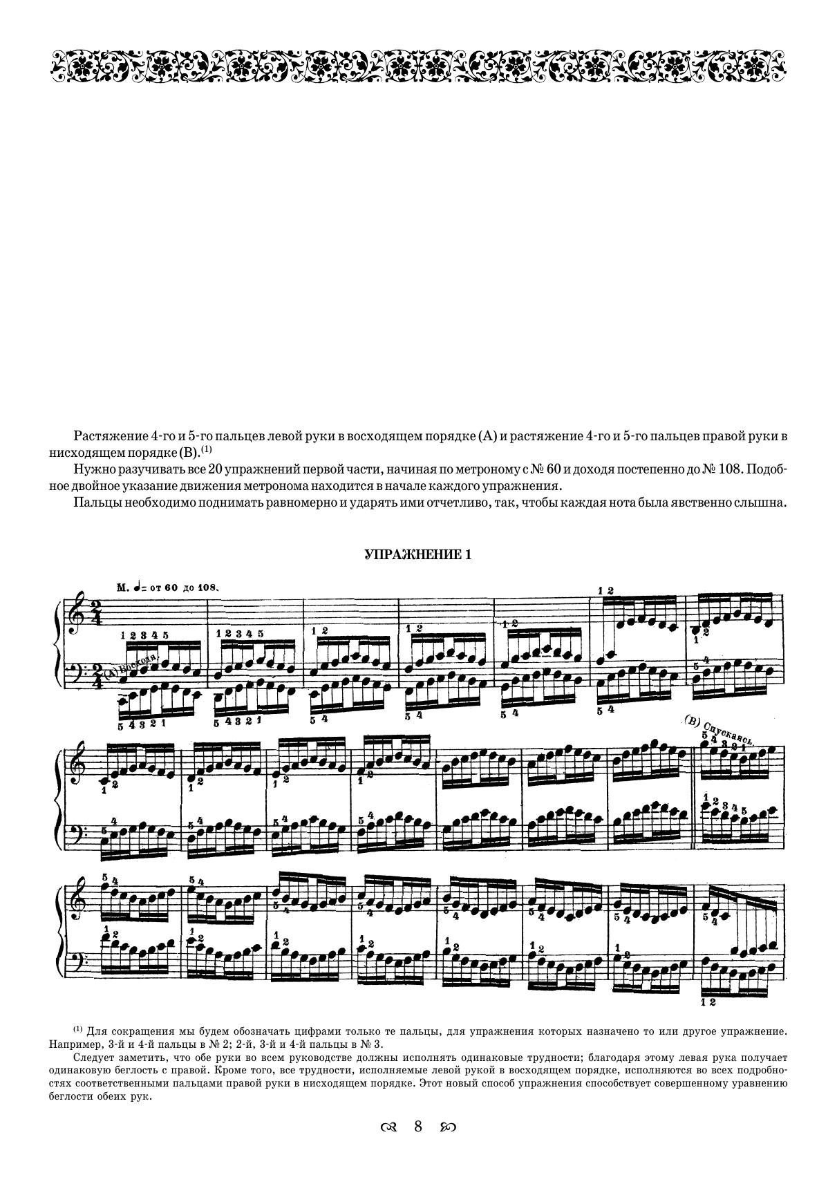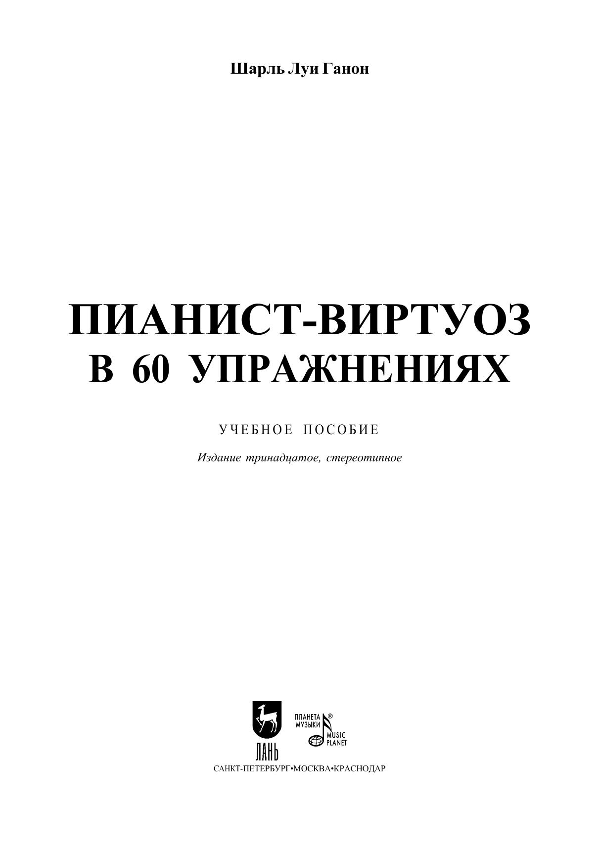Шарль Луи Ганон (1819-1900) — французский музыкант, композитор и музыкальный педагог. В данном издании представлены упражнения, которые требуются для достижения беглости, независимости, силы и совершенно равномерного развития пальцев, а также гибкости запястьев. Кроме того, эти упражнения рассчитаны на то, чтобы левая рука достигла такой же беглости, как и правая. Предназначено для всех, кто учится играть на фортепиано. Charles-Louis Hanon (1819–1900) was a French musician, composer and piano pedagogue. This book contains exercises meant to train the pianist in speed, independency and strength of all of the fingers and flexibility in the wrists. They also meant to develop the speed of left hand to the level of right hand. The textbook is intended for all who learn the piano.