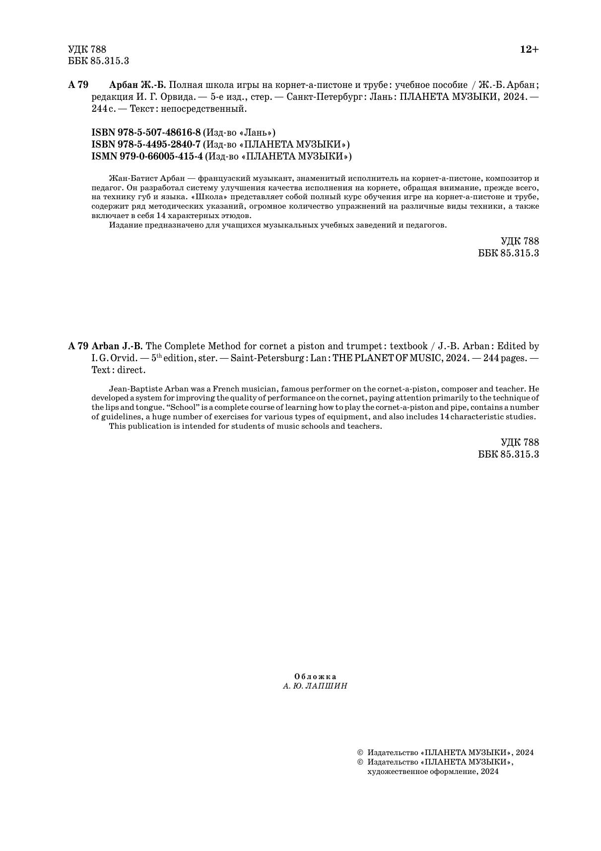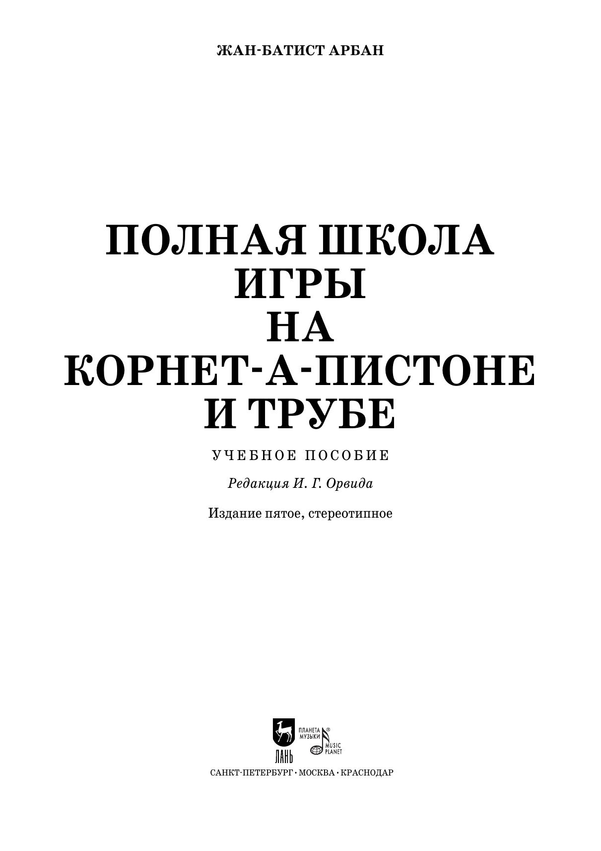 Жан-Батист Арбан — французский музыкант, знаменитый исполнитель на корнет-а-пистоне, композитор и педагог. Он разработал систему улучшения качества исполнения на корнете, обращая внимание, прежде всего, на технику губ и языка. «Школа» представляет собой полный курс обучения игре на корнет-а-пистоне и трубе, содержит ряд методических указаний, огромное количество упражнений на различные виды техники, а также включает в себя 14 характерных этюдов. Издание предназначено для учащихся музыкальных учебных заведений и педагогов.