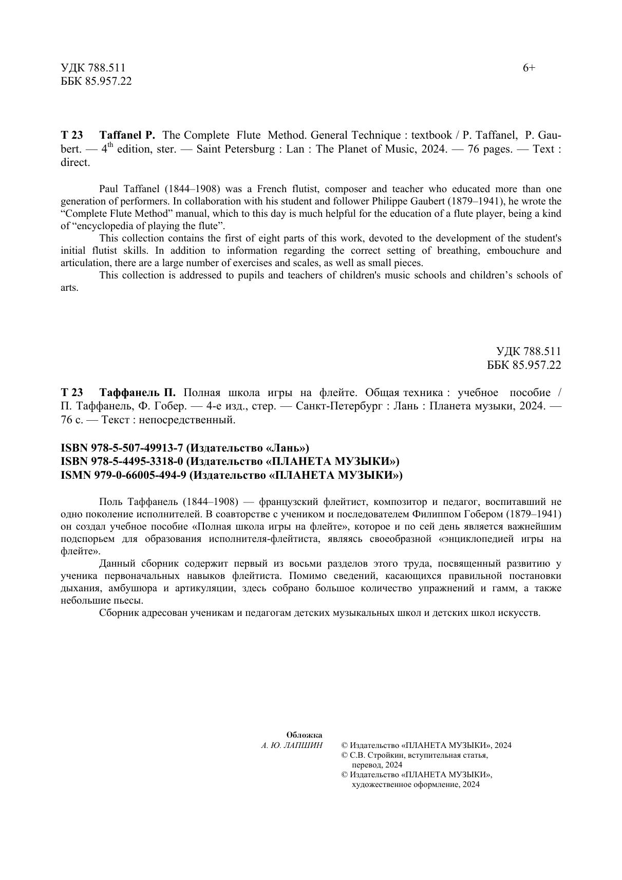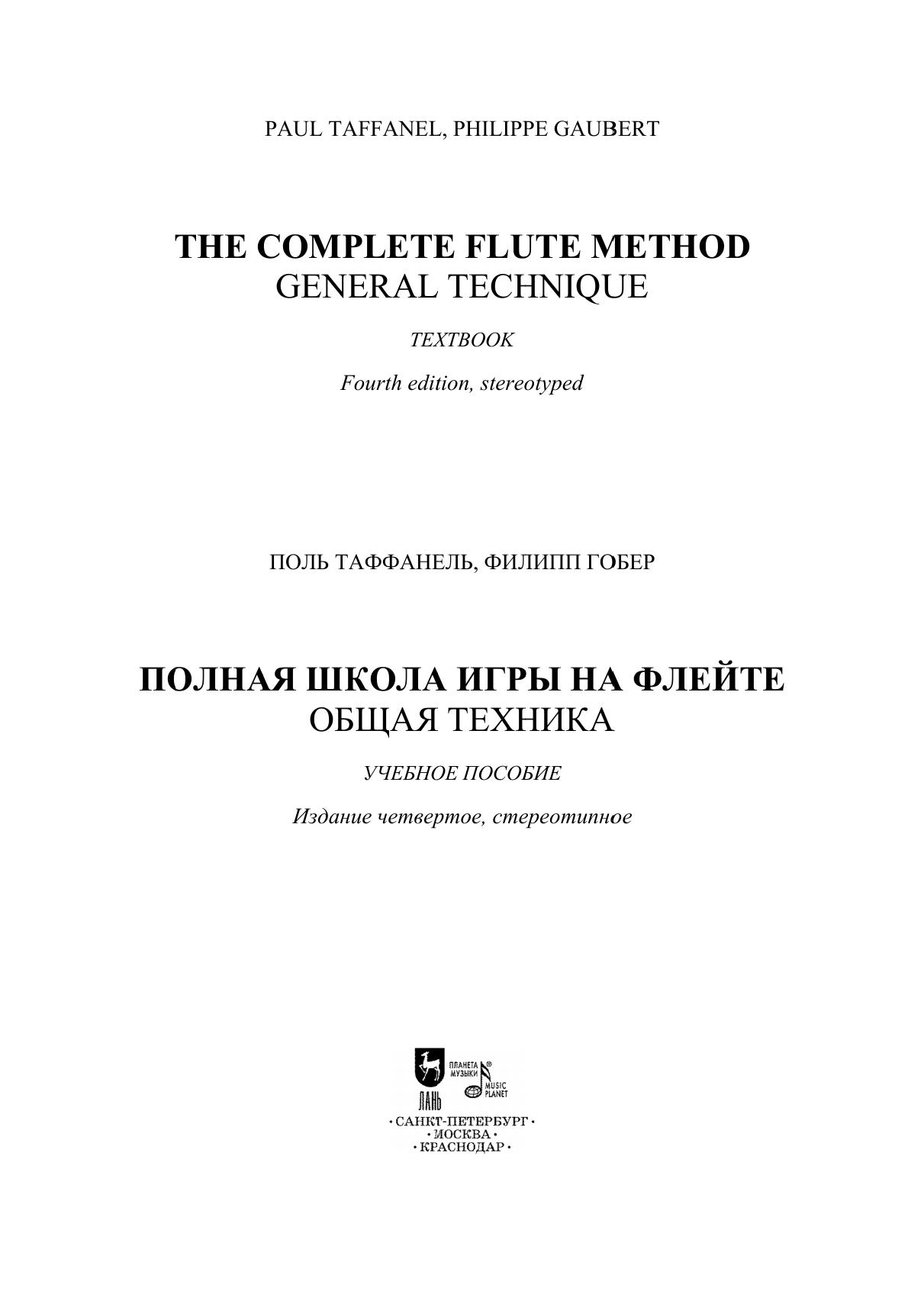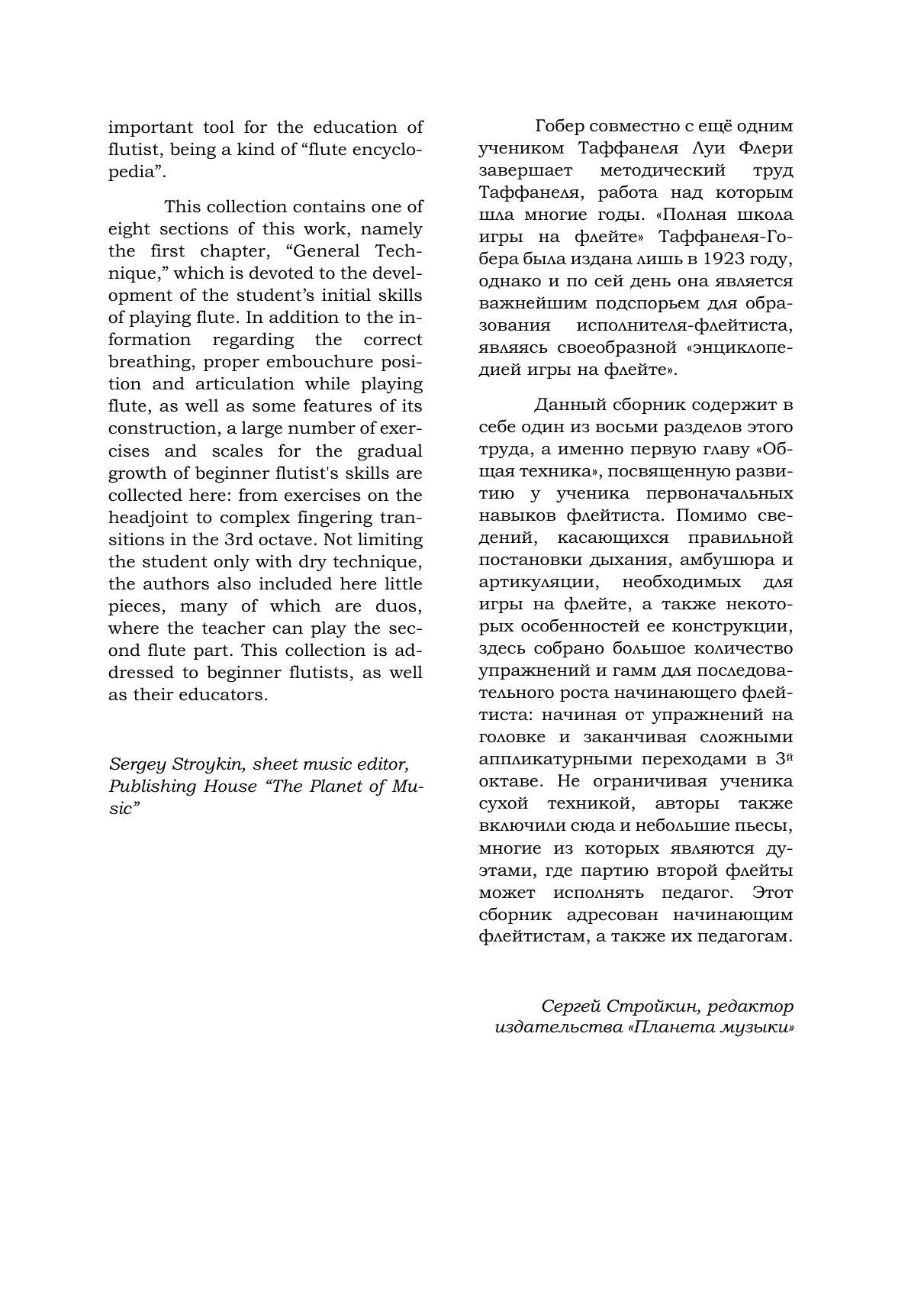 Поль Таффанель (1844–1908) — французский флейтист, композитор и педагог, воспитавший не одно поколение исполнителей. В соавторстве с учеником и последователем Филиппом Гобером (1879–1941) он создал учебное пособие «Полная школа игры на флейте», которая и по сей день является важнейшим подспорьем для образования исполнителя-флейтиста, являясь своеобразной «энциклопедией игры на флейте». Данный сборник содержит первый из восьми разделов этого труда, посвященный развитию у ученика первоначальных навыков флейтиста. Помимо сведений, касающихся правильной постановки дыхания, амбушюра и артикуляции, здесь собрано большое количество упражнений и гамм, а также небольшие пьесы. Сборник адресован ученикам и педагогам детских музыкальных школ и детских школ искусств. Paul Taffanel (1844–1908) was a French flutist, composer and teacher who educated more than one generation of performers. In collaboration with his student and follower Philippe Gaubert (1879–1941), he wrote the “Complete Flute Method” manual, which to this day is much helpful for the education of a flute player, being a kind of “encyclopedia of playing the flute”. This collection contains the first of eight parts of this work, devoted to the development of the student's initial flutist skills. In addition to information regarding the correct setting of breathing, embouchure and articulation, there are a large number of exercises and scales, as well as small pieces. This collection is addressed to pupils and teachers of children's music schools and children’s schools of arts.