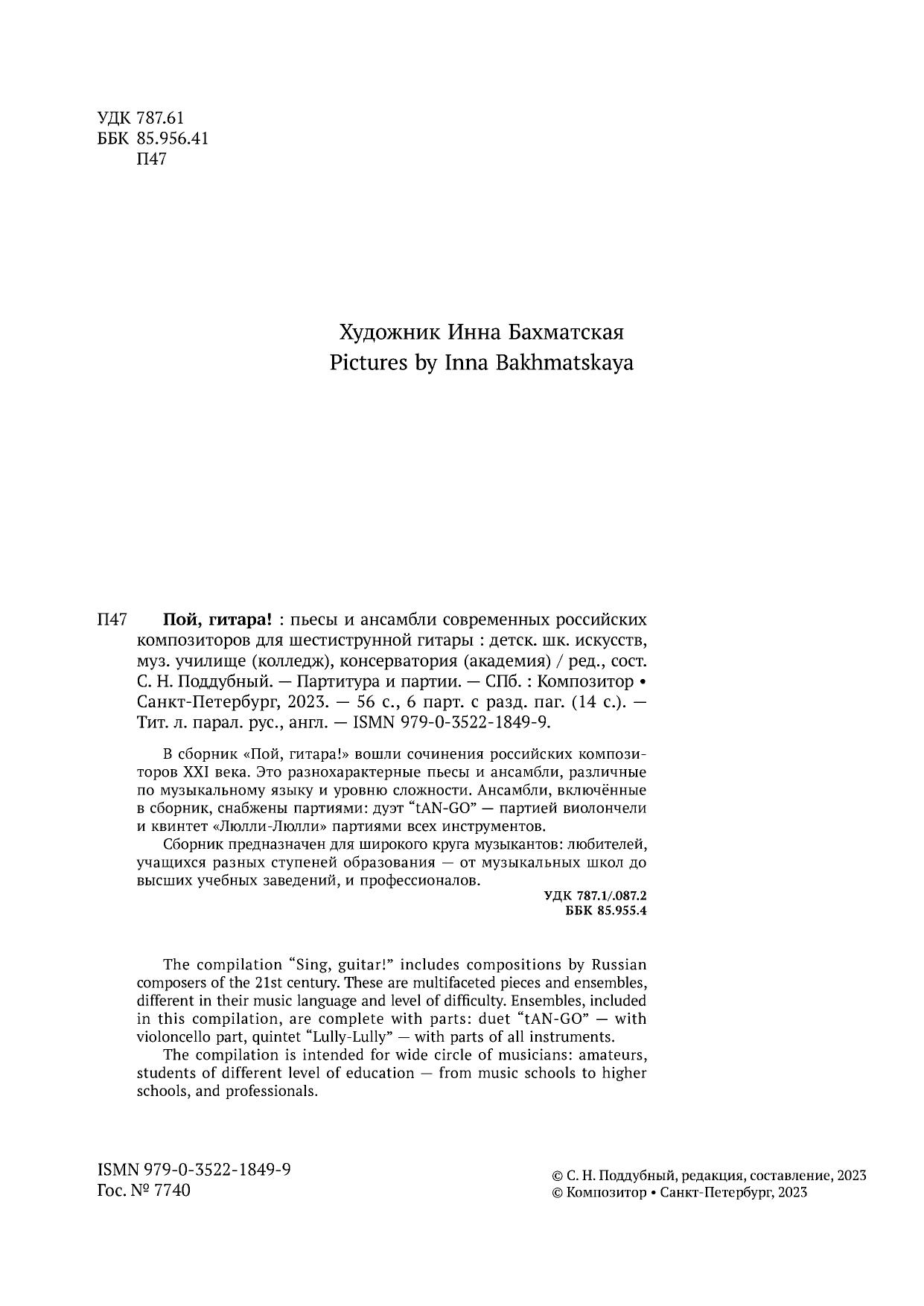 В сборник «Пой, гитара!» вошли сочинения российских композиторов XXI века. Это разнохарактерные пьесы и ансамбли, различные по музыкальному языку и уровню сложности. Ансамбли, включённые в сборник, снабжены партиями: дуэт “tAN-GO” — партией виолончели, а квинтет «Люлли-Люлли» — партиями всех инструментов.