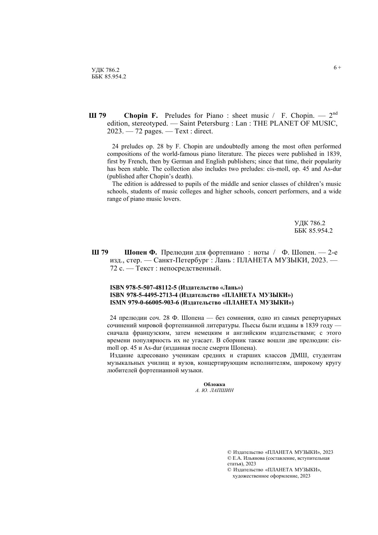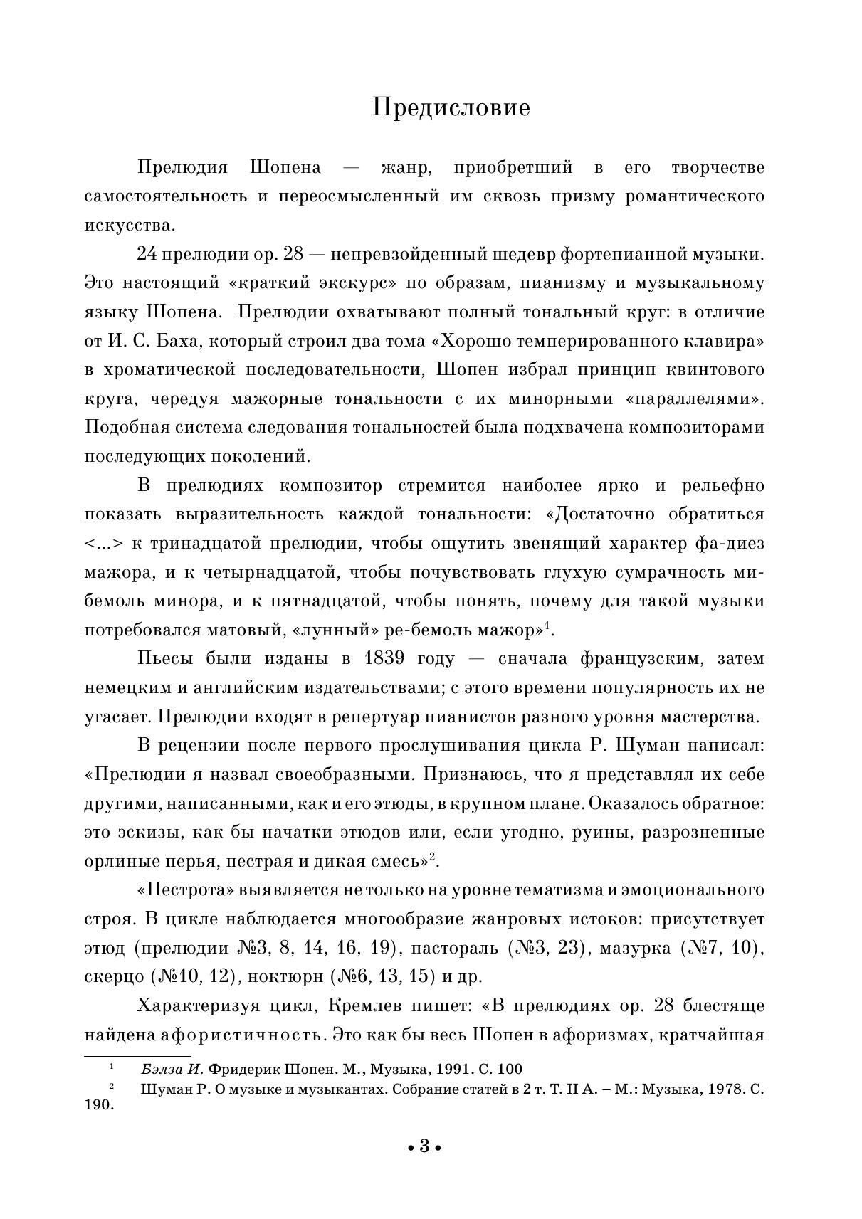 24 прелюдии соч. 28 Ф. Шопена — без сомнения, одно из самых репертуарных сочинений мировой фортепианной литературы. Пьесы были изданы в 1839 году — сначала французским, затем немецким и английским издательствами, с этого времени популярность их не угасает. В сборник также вошли две прелюдии: cis-moll ор. 45 и As-dur (изданная после смерти Шопена). Издание адресовано ученикам средних и старших классов ДМШ, студентам музыкальных училищ и вузов, концертирующим исполнителям, широкому кругу любителей фортепианной музыки. 24 preludes op. 28 by F. Chopin are undoubtedly among the most often perdormed compositions of the world-famous piano literature. The pieces were published in 1839, first by French, then by German and English publishers, since that time, their popularity is stable. The collection also includes two preludes: cis-moll, op. 45 and As-dur (published after Chopin's death). The edition is addressed to pupils of the middle and senior classes of children's music schools, students of music colleges and higher schools, concert performers, and a wide range of piano music lovers.