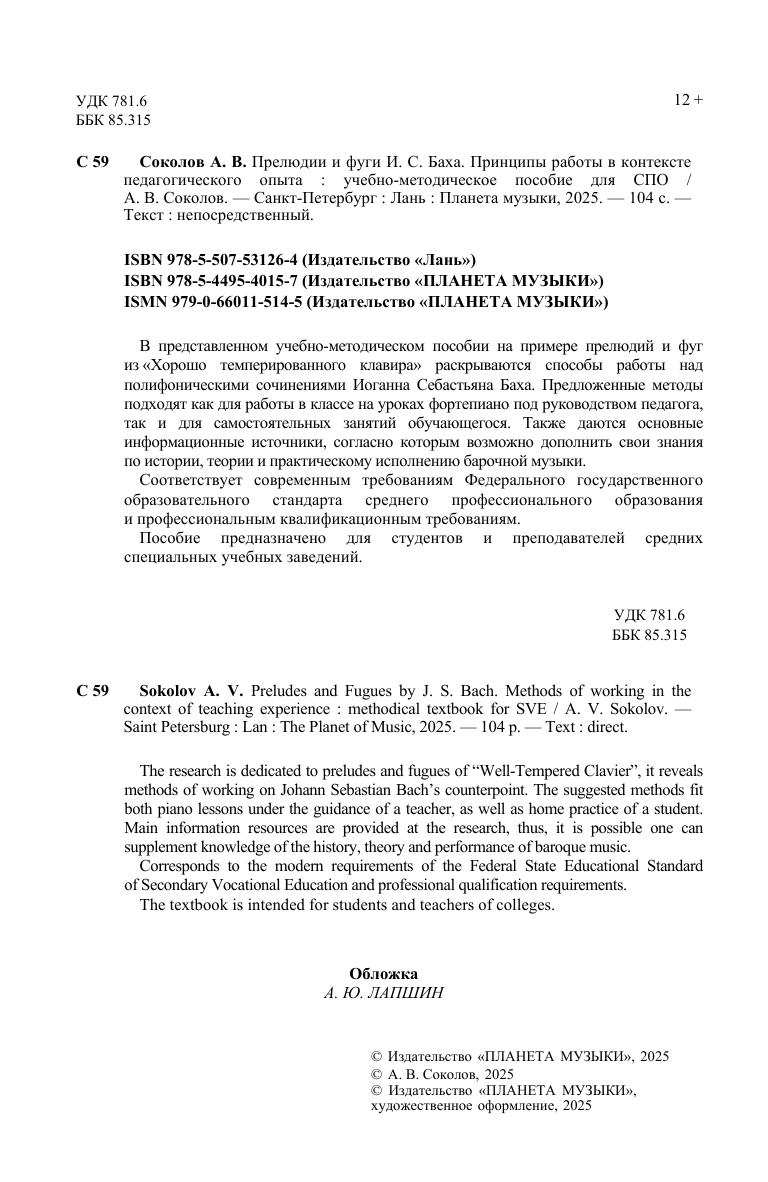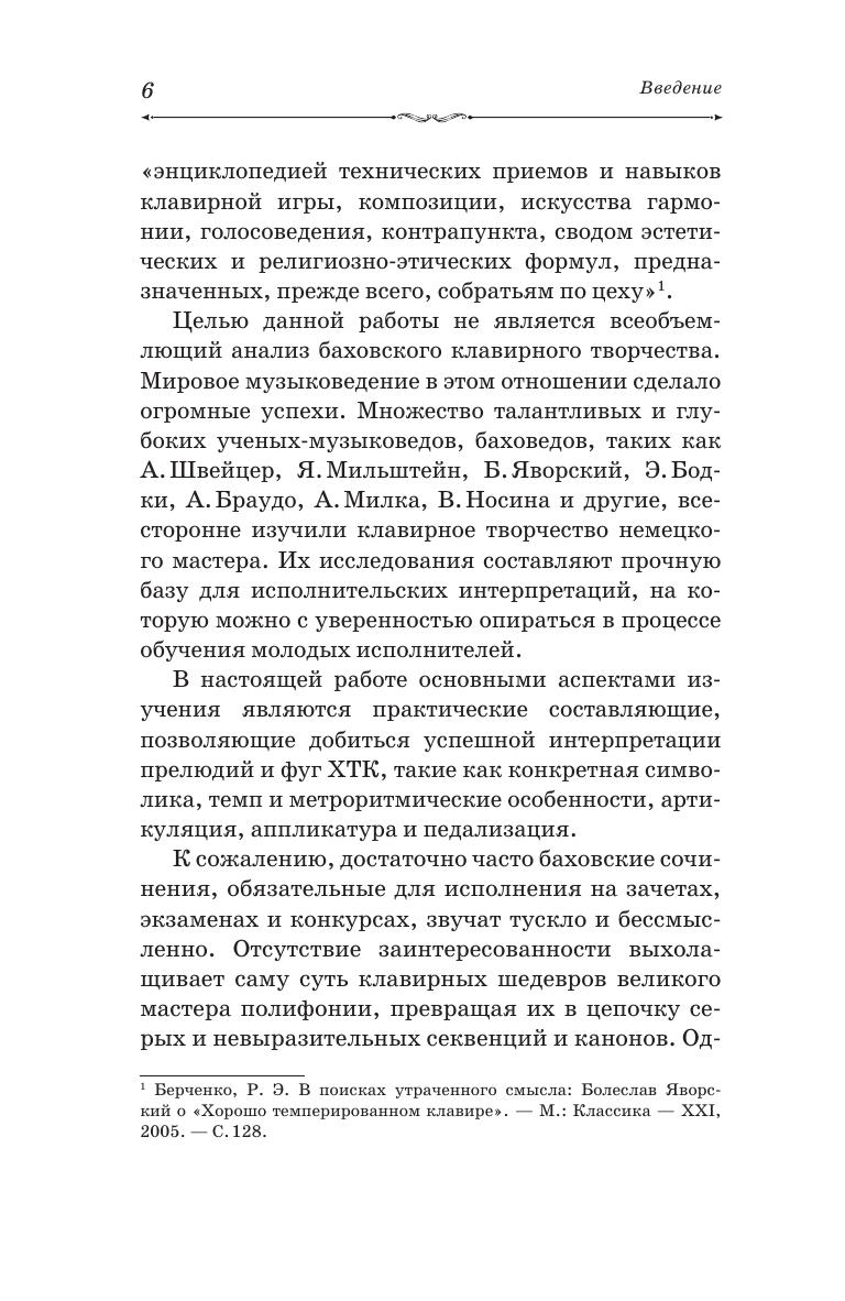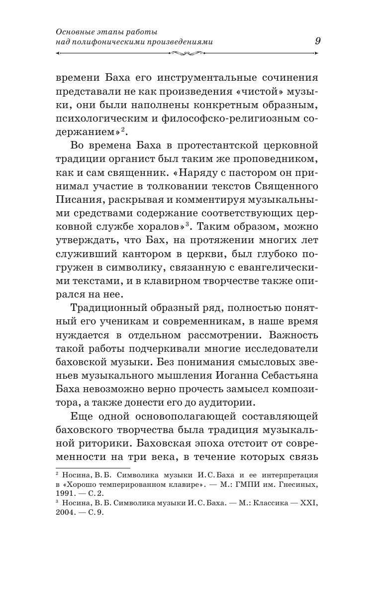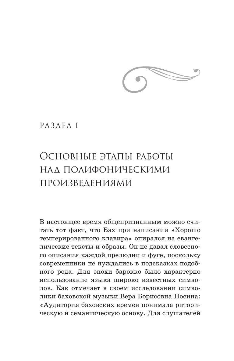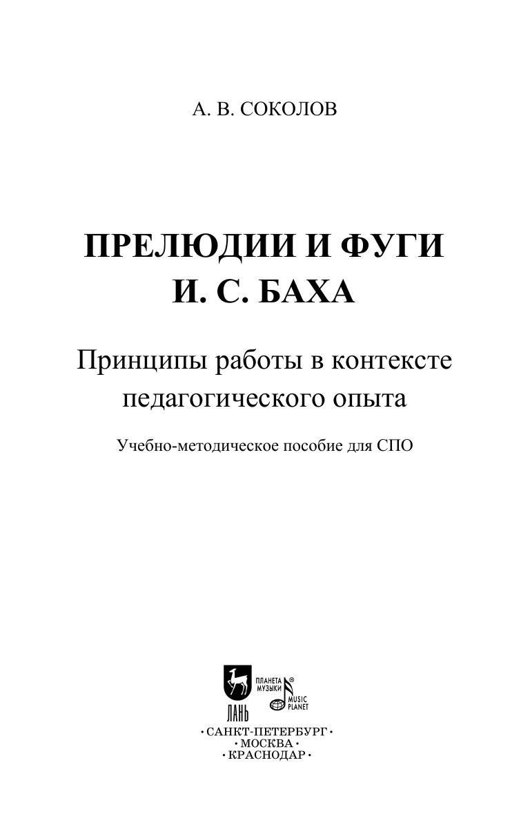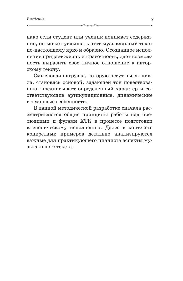 В представленном учебно-методическом пособии на примере прелюдий и фуг из «Хорошо темперированного клавира» раскрываются способы работы над полифоническими сочинениями Иоганна Себастьяна Баха. Предложенные методы подходят как для работы в классе на уроках фортепиано под руководством педагога, так и для самостоятельных занятий обучающегося. Также даются основные информационные источники, согласно которым возможно дополнить свои знания по истории, теории и практическому исполнению барочной музыки. Соответствует современным требованиям Федерального государственного образовательного стандарта среднего профессионального образования и профессиональным квалификационным требованиям. Пособие предназначено для студентов и преподавателей средних специальных учебных заведений. The research is dedicated to preludes and fugues of "Well-Tempered Clavier", it reveals methods of working on Johann Sebastian Bach’s counterpoint. The suggested methods fits both piano lessons under the guidance of a teacher, as well as home practice of a student. Main information resources are provided at the research, thus, it is possible one can supplement knowledge of the history, theory and performance of baroque music. Corresponds to the modern requirements of the Federal State Educational Standard of Secondary Vocational Education and professional qualification requirements. The textbook is intended for students and teachers of colleges.
