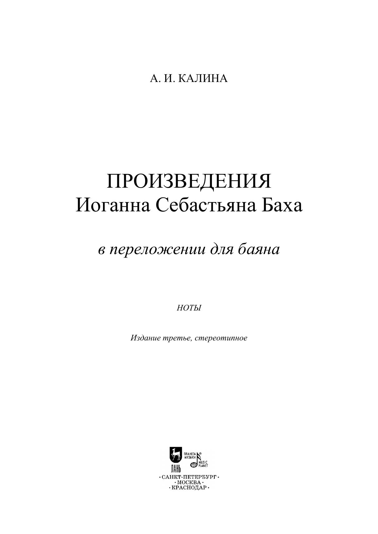В настоящее издание включены переложения одних из самых известных произведений Иоганна Себастьяна Баха (1685–1750). Возможности современного многотембрового многорядного выборного инструмента позволяют исполнять сложнейшие органные циклы с максимально приближенным характером звучания, создавать транскрипции клавирных и оркестровых сочинений. Освоив на классическом материале достоинства современного инструмента, исполнитель найдет путь к музыкальному Олимпу и сможет прикоснуться к вершине баянного мастерства в исполнении полифонической музыки. This edition includes transcriptions of some of most famous works by Johann Sebastian Bach (1685–1750). The capabilities of the modern multi-timbre multi-row unisonoric instrument make it possible to perform complex organ cycles with sound as close possible, to create transcriptions of clavier and orchestra compositions. Having mastered the modern instrument’s high capabilities on classical material, the performer will find a way to the musical Olympus and will be able to reach the peak of button accordion art while performing the polyphonic music.