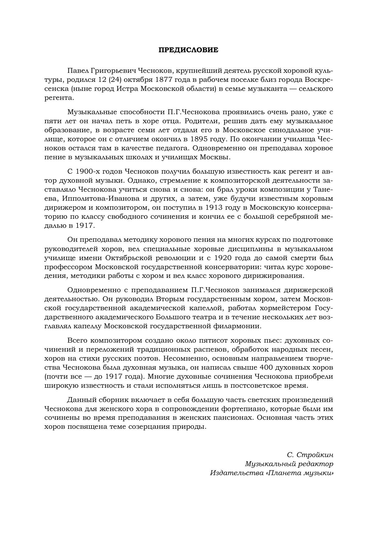 Чесноков Павел Григорьевич (1877-1944) — один из крупнейших мастеров русской хоровой культуры, способствовавший своей разносторонней музыкальной деятельностью поднятию ее на новый, высочайший уровень. Настоящий сборник представляет собой избранные произведения для женского (также подходит и для детского) хора в сопровождении фортепиано. Издание предназначено для учащихся и студентов музыкальных учебных заведений, изучающих хоровые дисциплины, а также для педагогов и хоровых дирижеров.