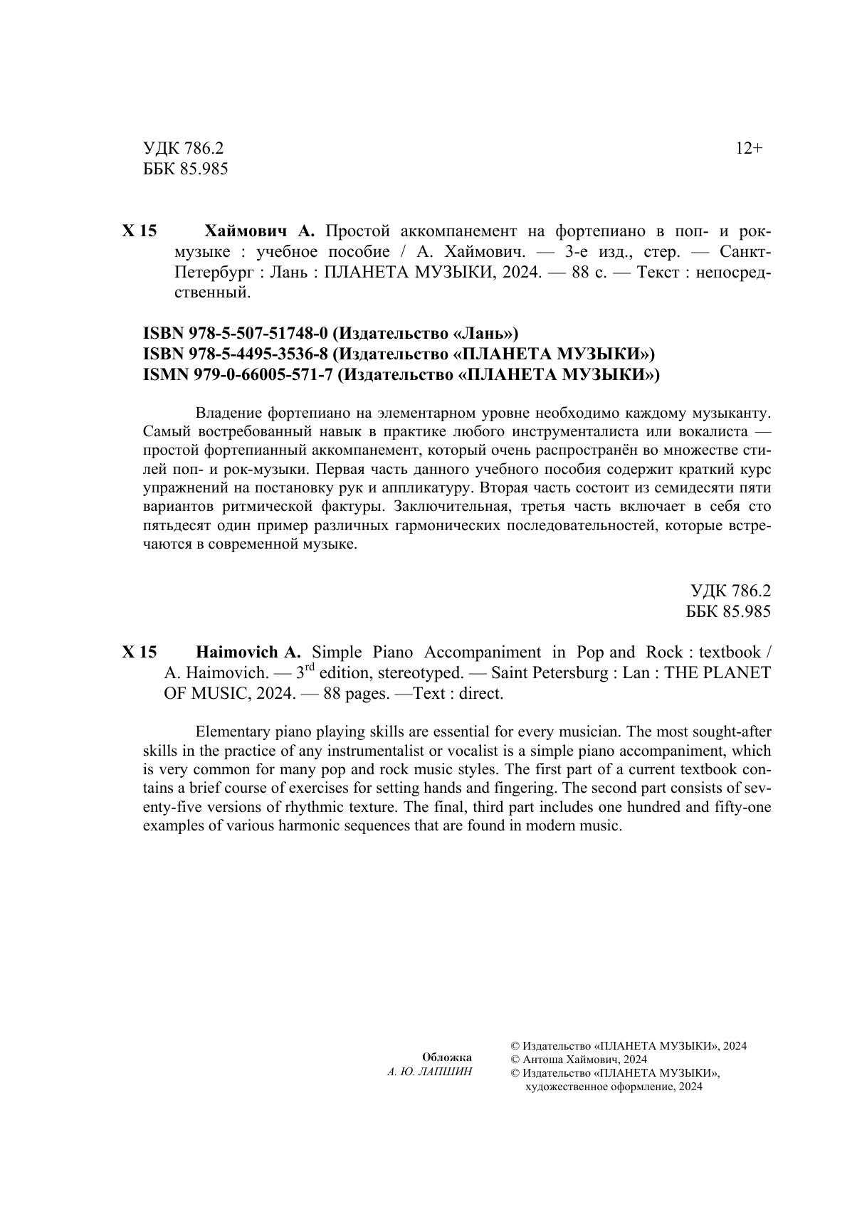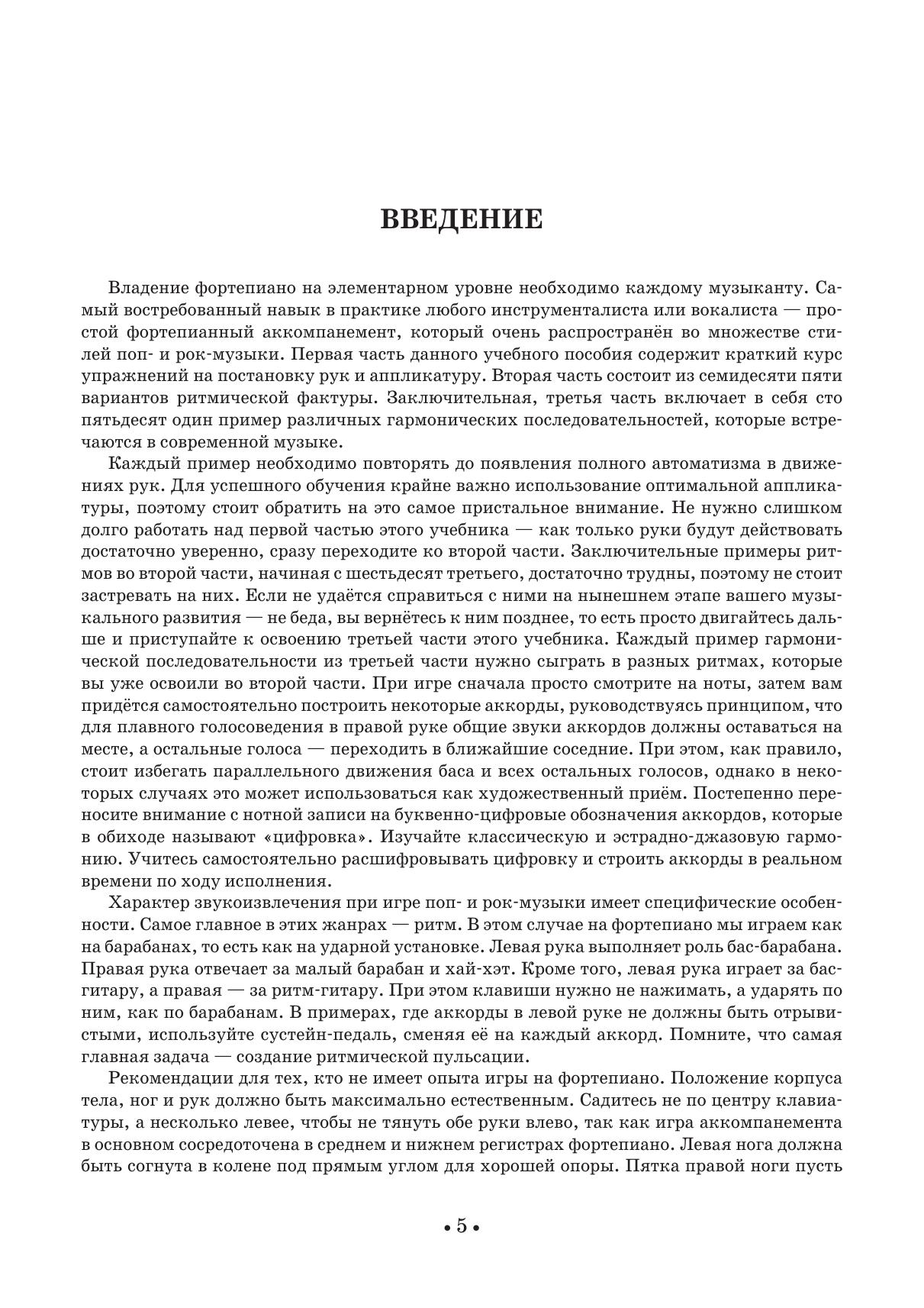 Владение фортепиано на элементарном уровне необходимо каждому музыканту. Самый востребованный навык в практике любого инструменталиста или вокалиста — простой фортепианный аккомпанемент, который очень распространён во множестве стилей поп- и рок–музыки. Первая часть данного учебного пособия содержит краткий курс упражнений на постановку рук и аппликатуру. Вторая часть состоит из семидесяти пяти вариантов ритмической фактуры. Заключительная, третья часть включает в себя сто пятьдесят один пример различных гармонических последовательностей, которые встречаются в современной музыке.