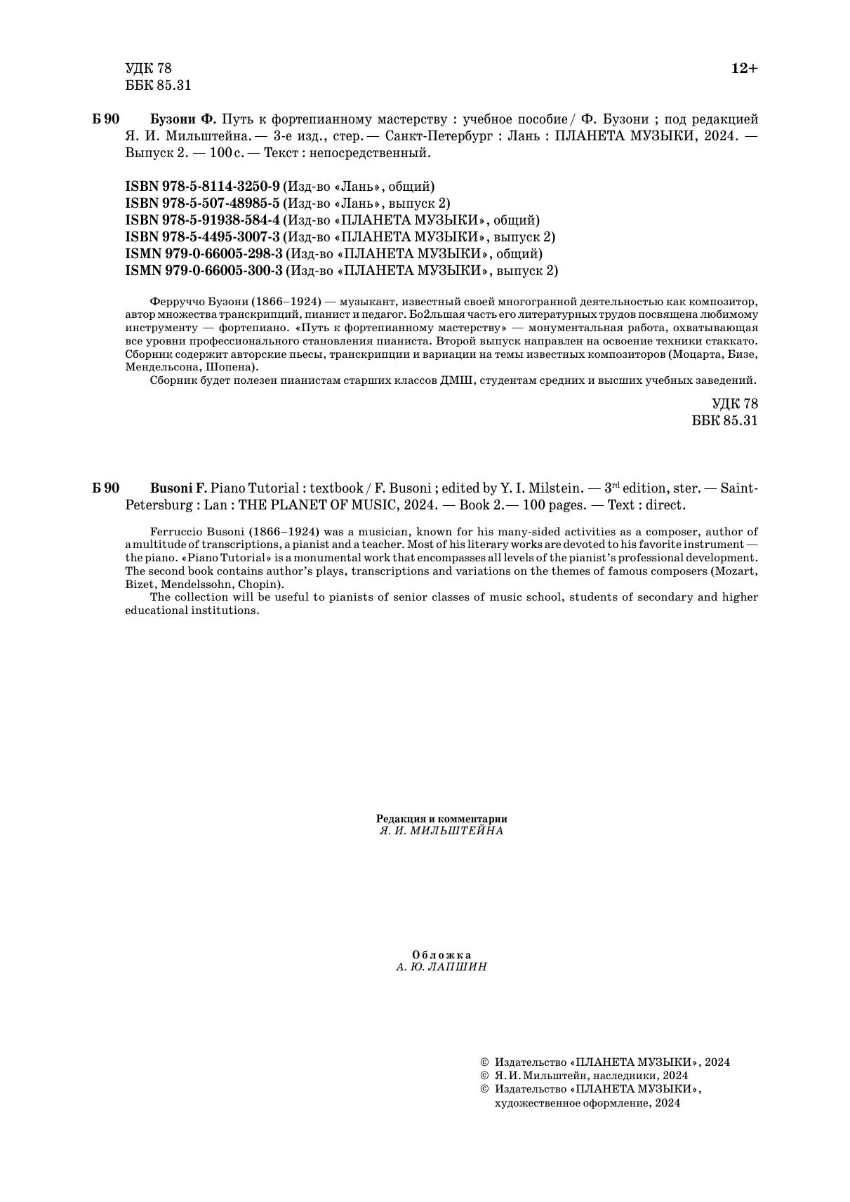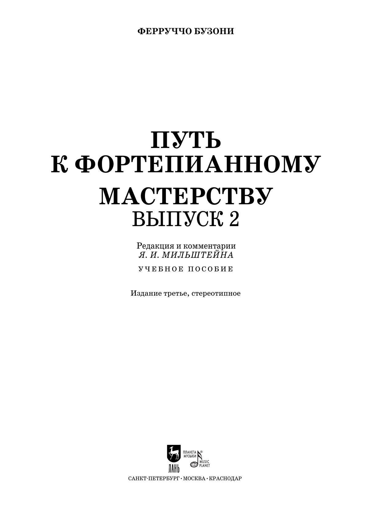 Ферруччо Бузони (1866–1924) — музыкант, известный своей многогранной деятельностью как композитор, автор множества транскрипций, пианист и педагог. Большая часть его литературных трудов посвящена любимому инструменту — фортепиано. «Путь к фортепианному мастерству» — монументальная работа, охватывающая все уровни профессионального становления пианиста. Второй выпуск направлен на освоение техники стаккато. Сборник содержит авторские пьесы, транскрипции и вариации на темы известных композиторов (Моцарт, Бизе, Мендельсон, Шопен). Сборник будет полезен пианистам старших классов ДМШ, студентам средних и высших учебных заведений.