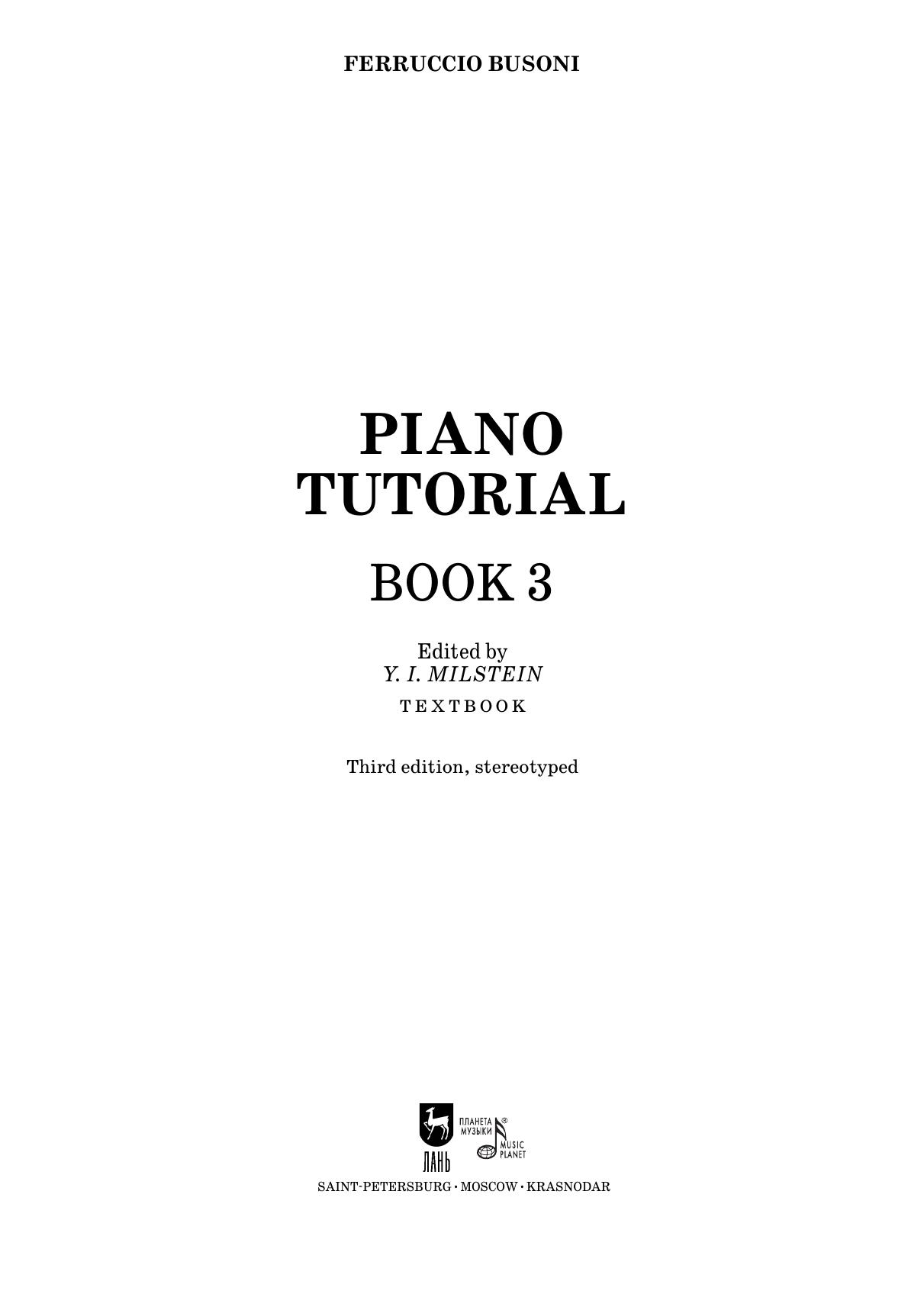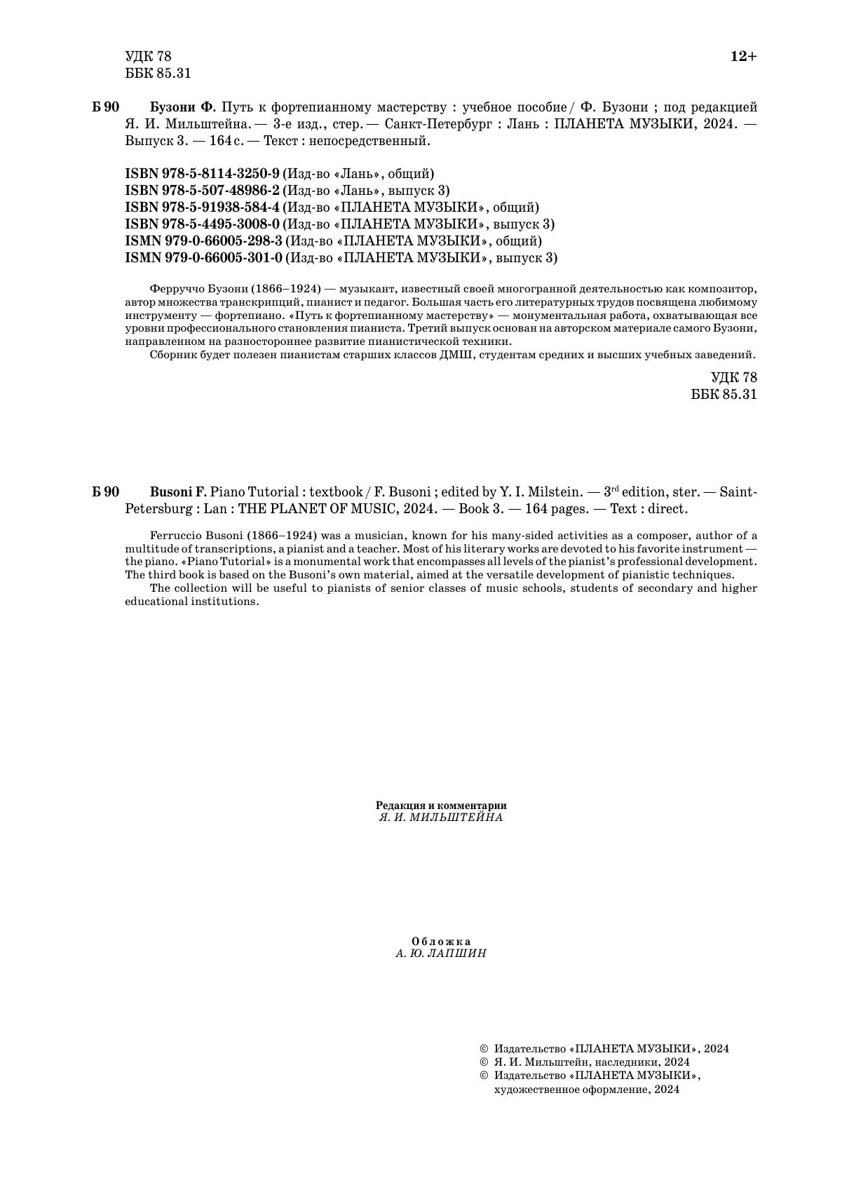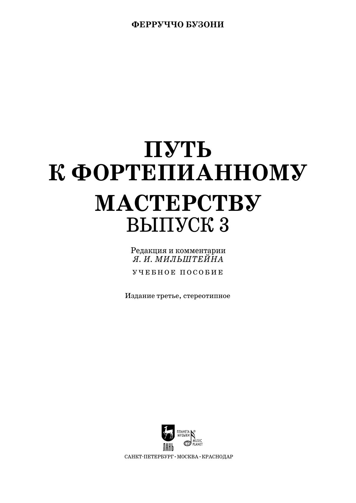 Ферруччо Бузони (1866–1924) — музыкант, известный своей многогранной деятельностью как композитор, автор множества транскрипций, пианист и педагог. Большая часть его литературных трудов посвящена любимому инструменту — фортепиано. «Путь к фортепианному мастерству» — монументальная работа, охватывающая все уровни профессионального становления пианиста. Третий выпуск основан на авторском материале самого Бузони, направленном на разностороннее развитие пианистической техники. Сборник будет полезен пианистам старших классов ДМШ, студентам средних и высших учебных заведений.