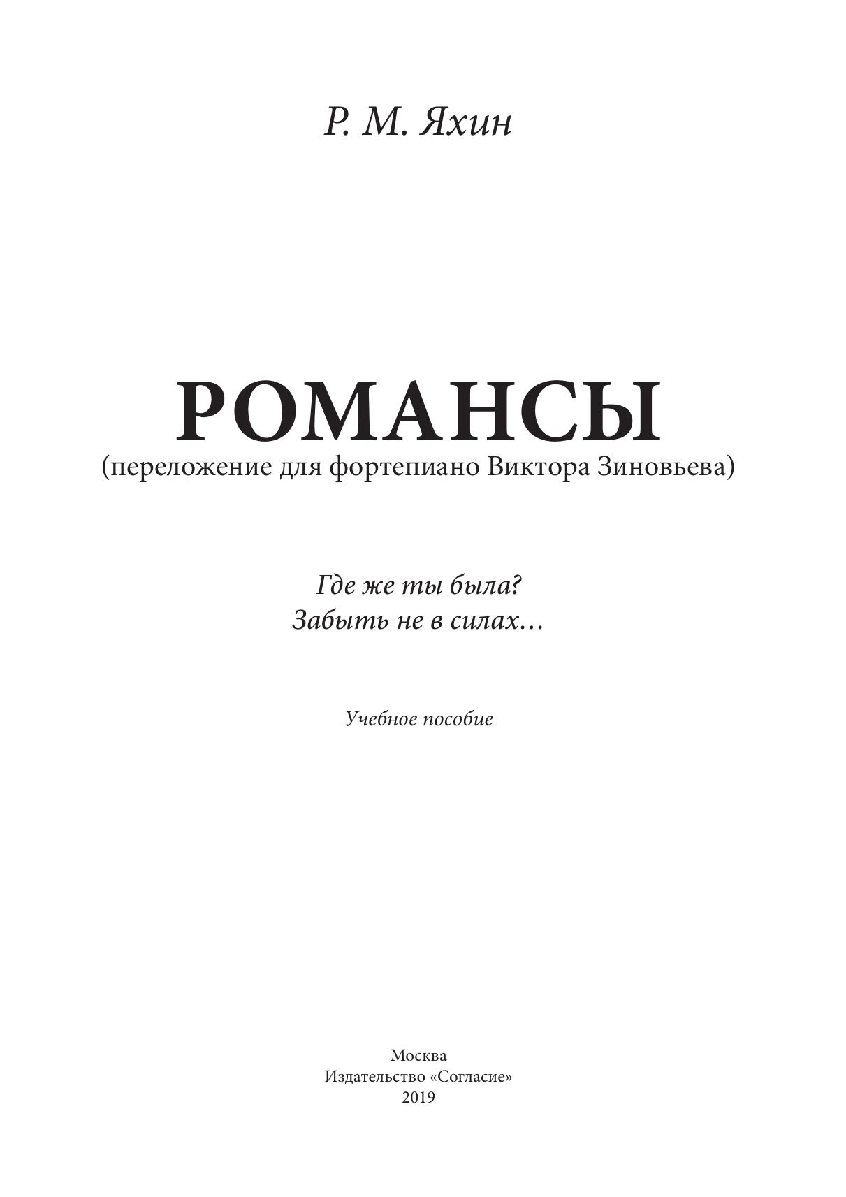 Настоящее издание включает в себя переложения для фортепиано двух романсов выдающегося татарского композитора Рустема Яхина (1923–1991). Популярность романсов Р. Яхина, их мелодическая и гармоническая красота, особая «яхинская» интонация послужили причиной появления обработок для фортепиано. Предлагаемые вниманию исполнителей переложения романсов Р. Яхина «Где же ты была?» и «Забыть не в силах» выполнены молодым перспективным композитором и пианистом Виктором Зиновьевым. Издание может быть использовано в процессе профессиональной подготовки пианистов, а также будет интересно всем поклонникам творчества композитора.