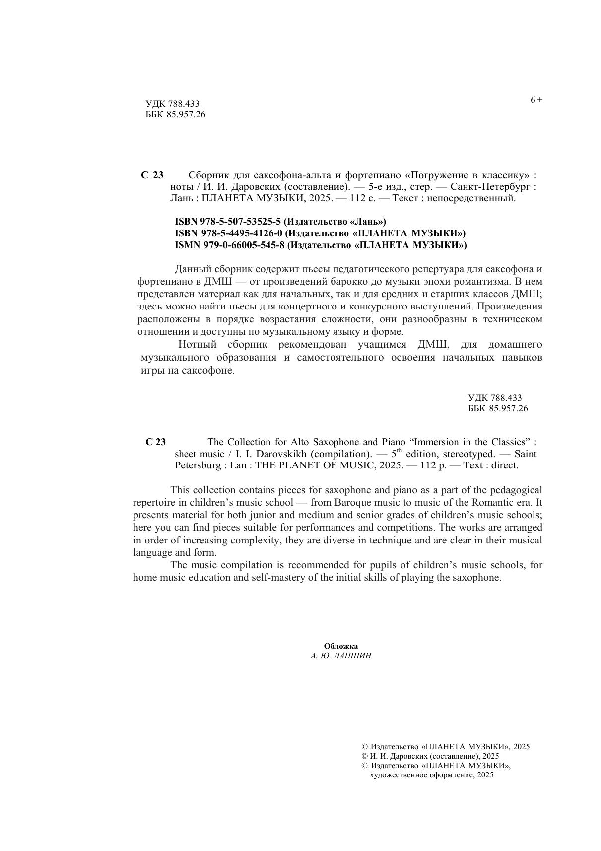 Данный сборник содержит пьесы педагогического репертуара для саксофона и фортепиано в ДМШ – от произведений барокко до музыки эпохи романтизма. В нем представлен материал как для начальных, так и для средних и старших классов ДМШ, здесь можно найти пьесы для концертного и конкурсного выступлений. Произведения расположены в порядке возрастания сложности, они разнообразны в техническом отношении и доступны по музыкальному языку и форме. Нотный сборник рекомендован учащимся ДМШ, для домашнего музыкального образования и самостоятельного освоения начальных навыков игры на саксофоне. This collection contains pieces for saxophone and piano as a part of the pedagogical repertoire in children’s music school — from Baroque music to music of the Romantic era. It presents material for both junior and medium and senior grades of children’s music schools, here you can find pieces suitable for performances and competitions. The works are arranged in order of increasing complexity, they are diverse in technique and are clear in their musical language and form. The music compilation is recommended for pupils of children’s music schools, for home music education and self-mastery of the initial skills of playing the saxophone.