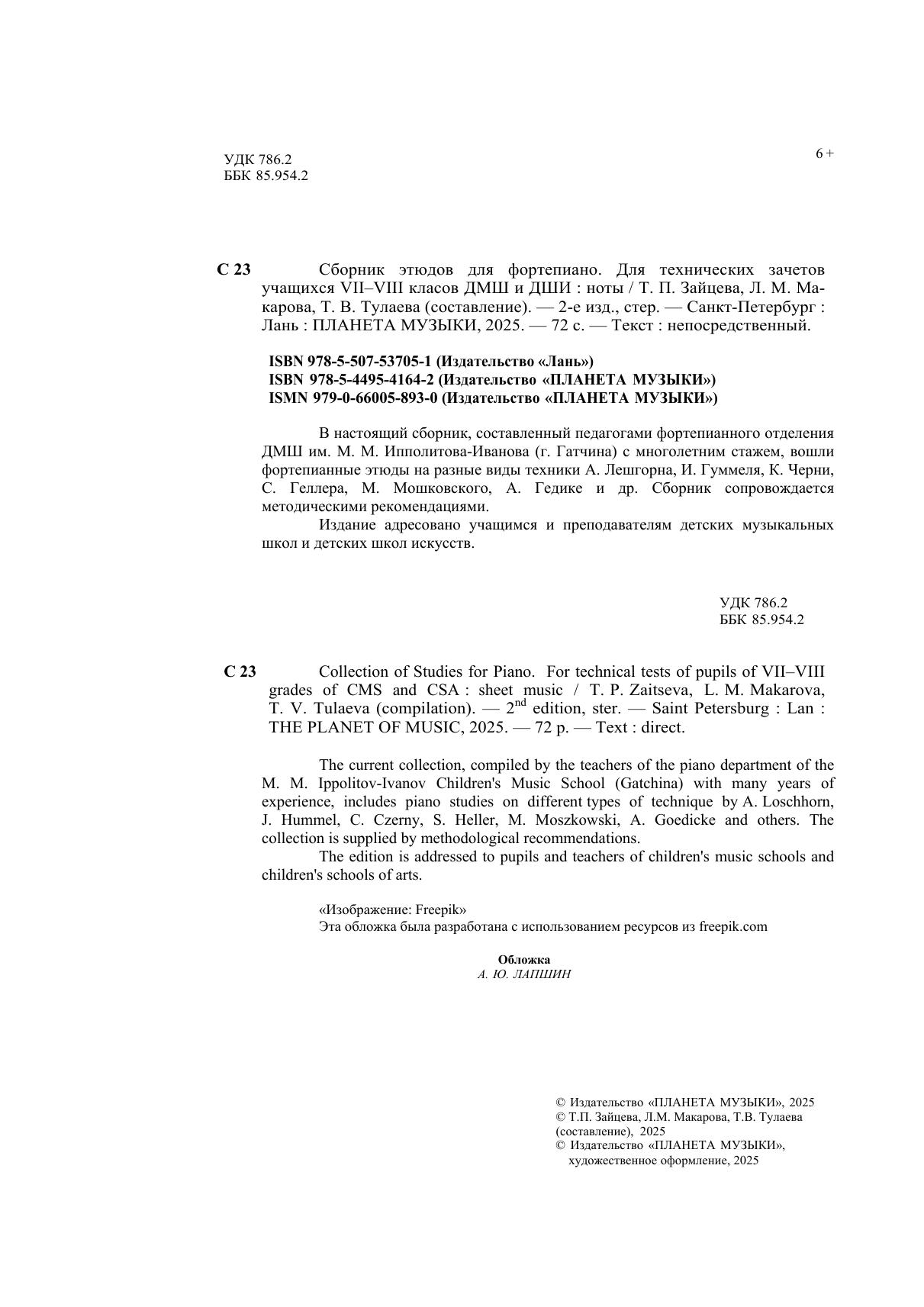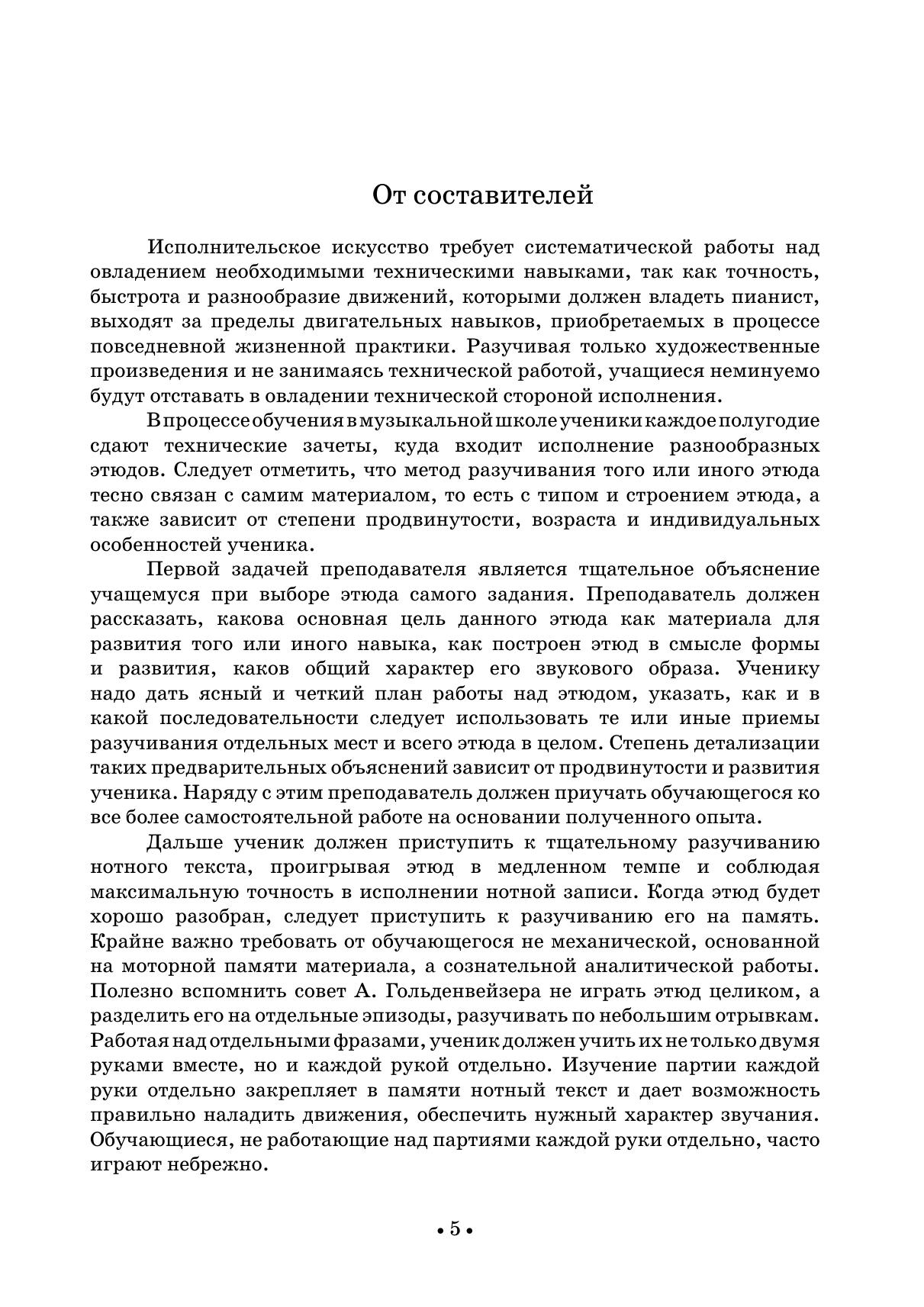 В настоящий cборник, составленный педагогами фортепианного отделения ДМШ им. М. М. Ипполитова-Иванова (г. Гатчина) с многолетним стажем, вошли фортепианные этюды на разные виды техники К. Черни, А. Бертини, С. Геллера, Л. Шитте и др. Сборник сопровождается методическими рекомендациями. Издание адресовано учащимся и преподавателям детских музыкальных школ и детских школ искусств. The current collection, compiled by the teachers of the piano department of the M. M. Ippolitov-Ivanov Children's Music School (Gatchina) with many years of experience, includes piano studies on different types of technique by C. Czerny, H. Bertini, S. Heller, L. Schytte and others. The collection is supplied by methodological recommendations. The edition is addressed to pupils and teachers of children's music schools and children's schools of arts.