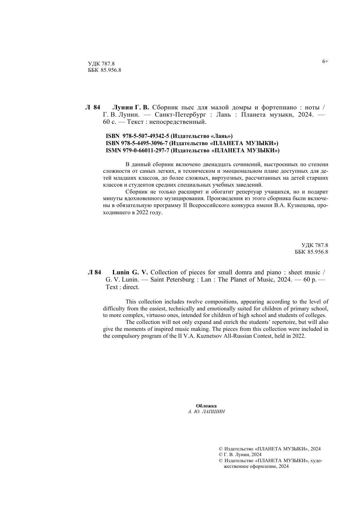 В данный сборник включено двенадцать сочинений, выстроенных по степени сложности от самых легких, в техническом и эмоциональном плане доступных для детей младших классов, до более сложных, виртуозных, рассчитанных на детей старших классов и студентов ССУЗов. Сборник не только расширит и обогатит репертуар учащихся, но и подарит минуты вдохновенного музицирования. Произведения из этого сборника были включены в обязательную программу II Всероссийского конкурса имени В.А. Кузнецова, проходившем в 2022 году. This collection includes twelve compositions, appearing according to the level of difficulty from the easiest, technically and emotionally suited for children of primary school, to more complex, virtuoso ones, intended for children of high school and students of colleges. The collection will not only expand and enrich the students’ repertoire, but will also give the moments of inspired music making. The pieces from this collection were included in the compulsory program of the II V.A. Kuznetsov All-Russian Contest, held in 2022.