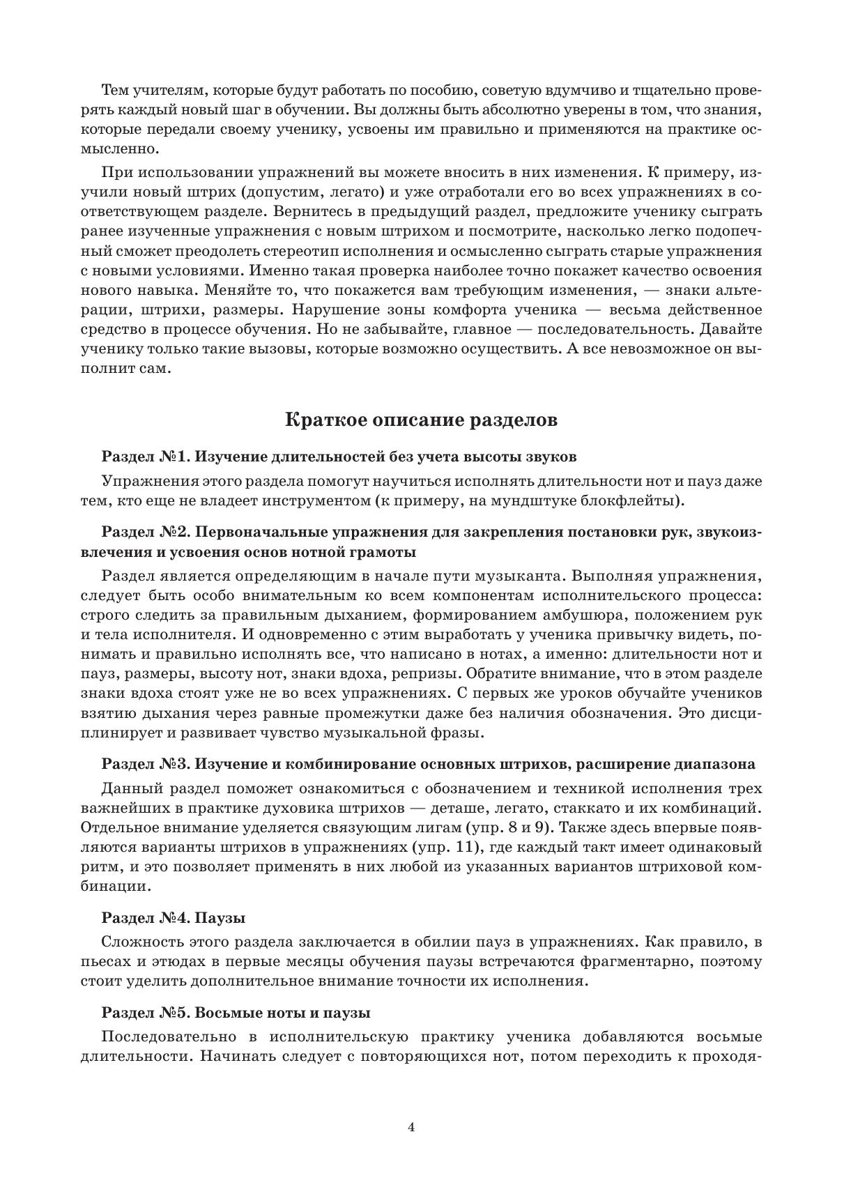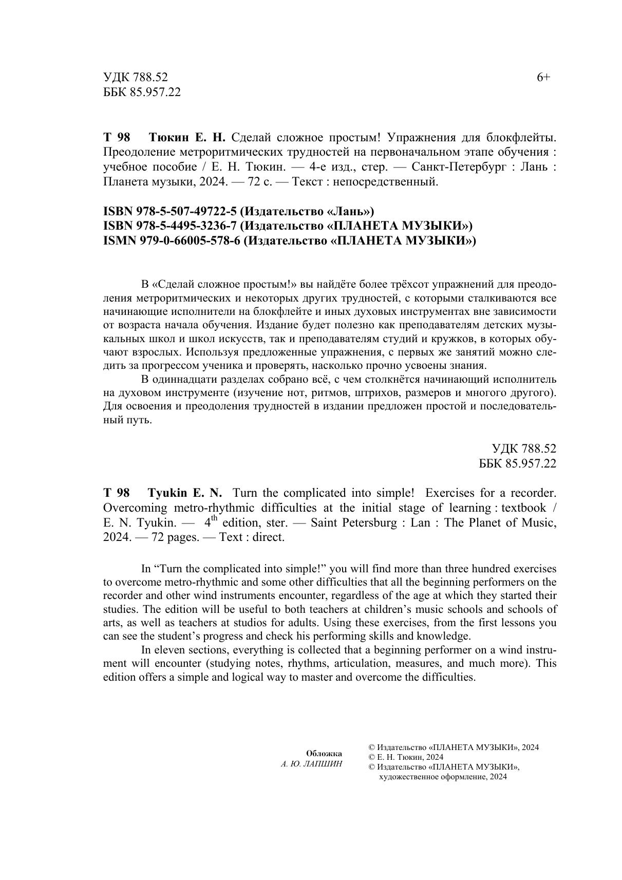 В «Сделай сложное простым!» вы найдёте более трёхсот упражнений для преодоления метроритмических и некоторых других трудностей, с которыми сталкиваются все начинающие исполнители на блокфлейте и иных духовых инструментах вне зависимости от возраста начала обучения. Издание будет полезно как преподавателям детских музыкальных школ и школ искусств, так и преподавателям студий и кружков, в которых обучают взрослых. Используя предложенные упражнения, с первых же занятий можно следить за прогрессом ученика и проверять, насколько прочно усвоены знания. В одиннадцати разделах собрано всё, с чем столкнётся начинающий исполнитель на духовом инструменте (изучение нот, ритмов, штрихов, размеров и многого другого). Для освоения и преодоления трудностей в издании предложен простой и последовательный путь. In “Turn the complicated into simple!” you will find more than three hundred exercises to overcome metro-rhythmic and some other difficulties that all the beginning performers on the recorder and other wind instruments encounter, regardless of the age at which they started their studies. The edition will be useful to both teachers at children's music schools and schools of arts, as well as teachers at studios for adults. Using these exercises, from the first lessons you can see the student’s progress and check his performing skills and knowledge. In eleven sections, everything is collected that a beginning performer on a wind instrument will encounter (studying notes, rhythms, articulation, measures, and much more). This edition offers a simple and logical way to master and overcome the difficulties.