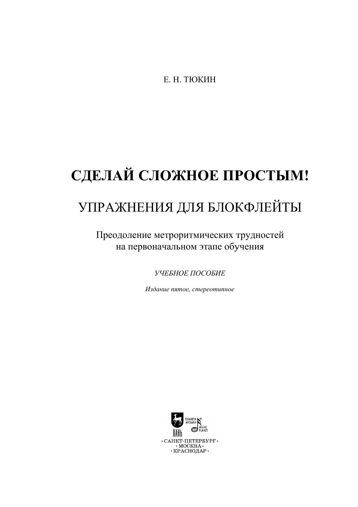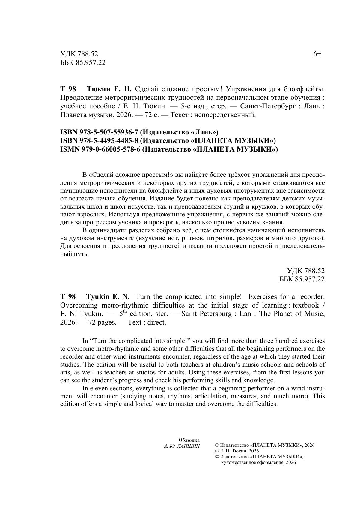 В «Сделай сложное простым!» вы найдёте более трёхсот упражнений для преодоления метроритмических и некоторых других трудностей, с которыми сталкиваются все начинающие исполнители на блокфлейте и иных духовых инструментах вне зависимости от возраста начала обучения. Издание будет полезно как преподавателям детских музыкальных школ и школ искусств, так и преподавателям студий и кружков, в которых обучают взрослых. Используя предложенные упражнения, с первых же занятий можно следить за прогрессом ученика и проверять, насколько прочно усвоены знания. В одиннадцати разделах собрано всё, с чем столкнётся начинающий исполнитель на духовом инструменте (изучение нот, ритмов, штрихов, размеров и многого другого). Для освоения и преодоления трудностей в издании предложен простой и последовательный путь. In “Turn the complicated into simple!” you will find more than three hundred exercises to overcome metro-rhythmic and some other difficulties that all the beginning performers on the recorder and other wind instruments encounter, regardless of the age at which they started their studies. The edition will be useful to both teachers at children's music schools and schools of arts, as well as teachers at studios for adults. Using these exercises, from the first lessons you can see the student’s progress and check his performing skills and knowledge. In eleven sections, everything is collected that a beginning performer on a wind instrument will encounter (studying notes, rhythms, articulation, measures, and much more). This edition offers a simple and logical way to master and overcome the difficulties.