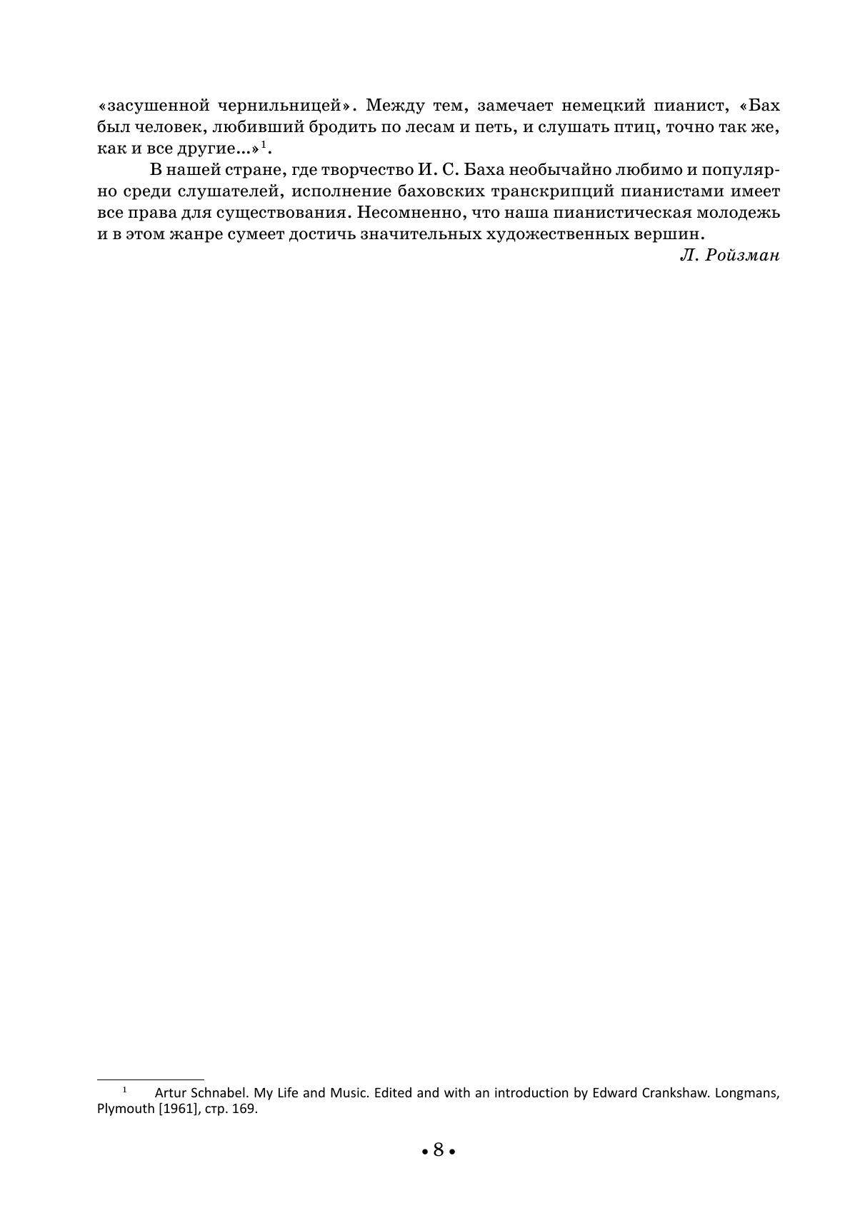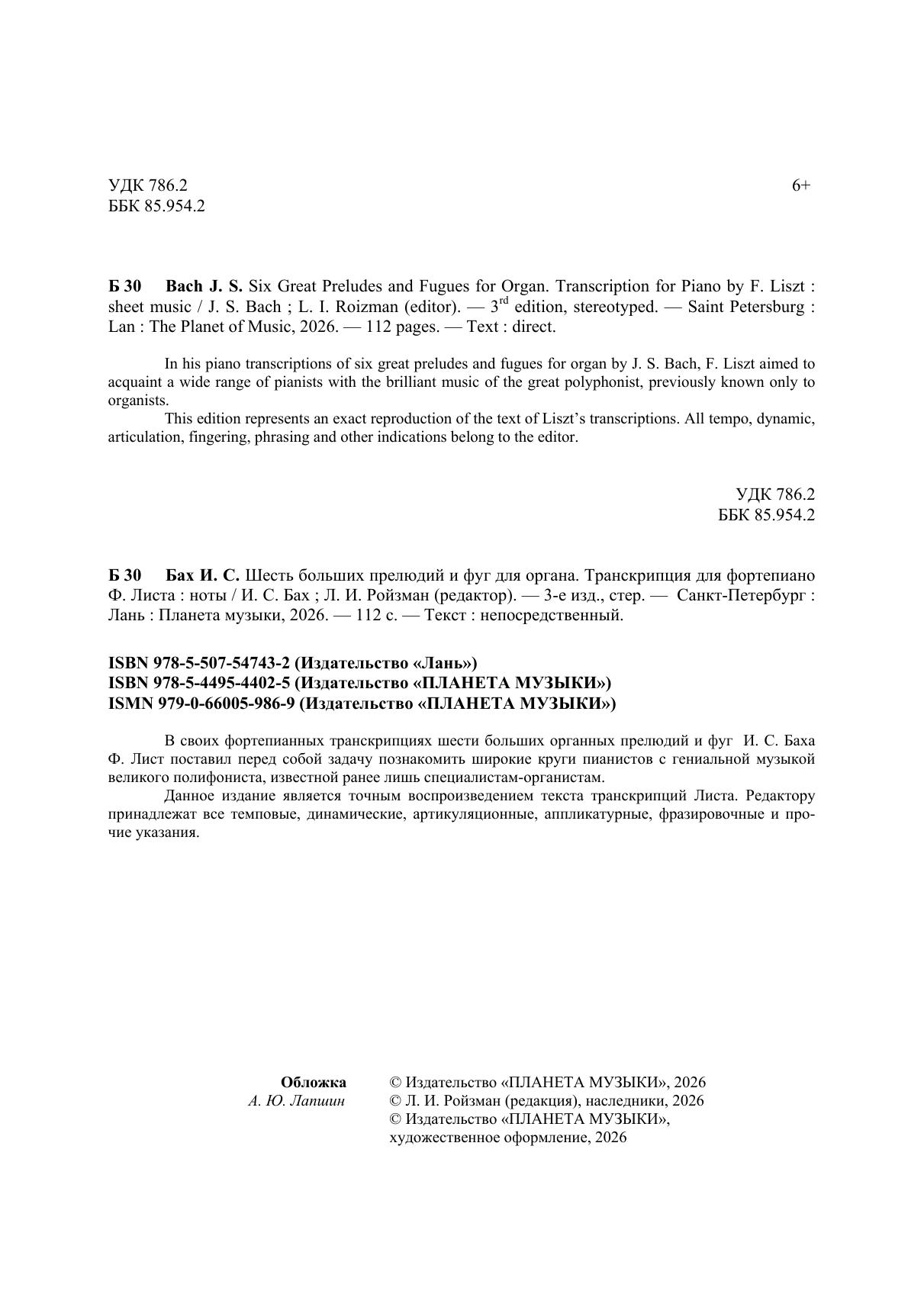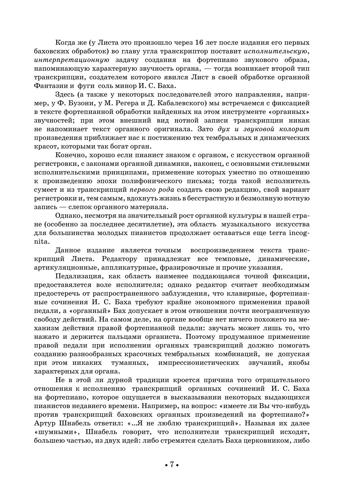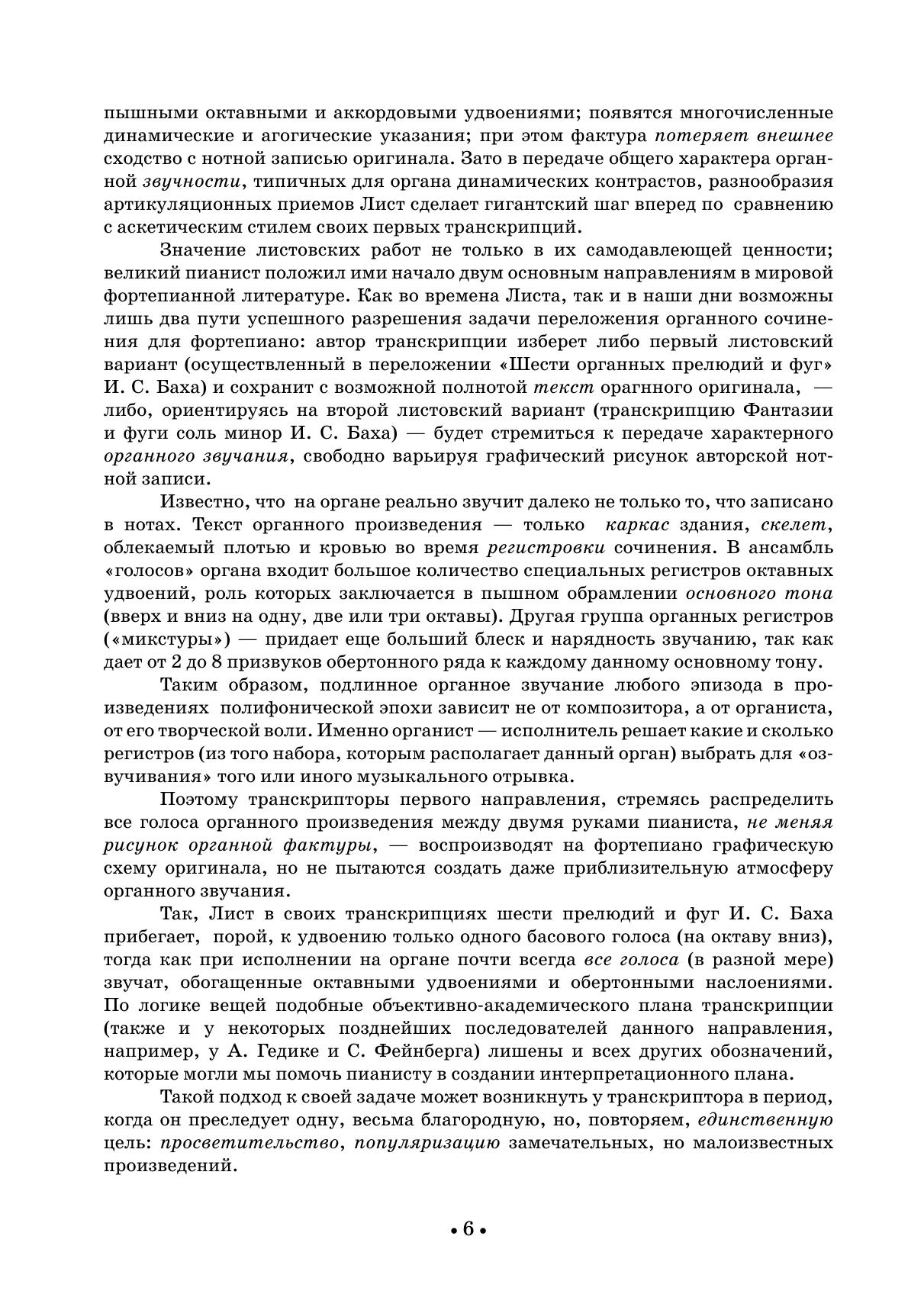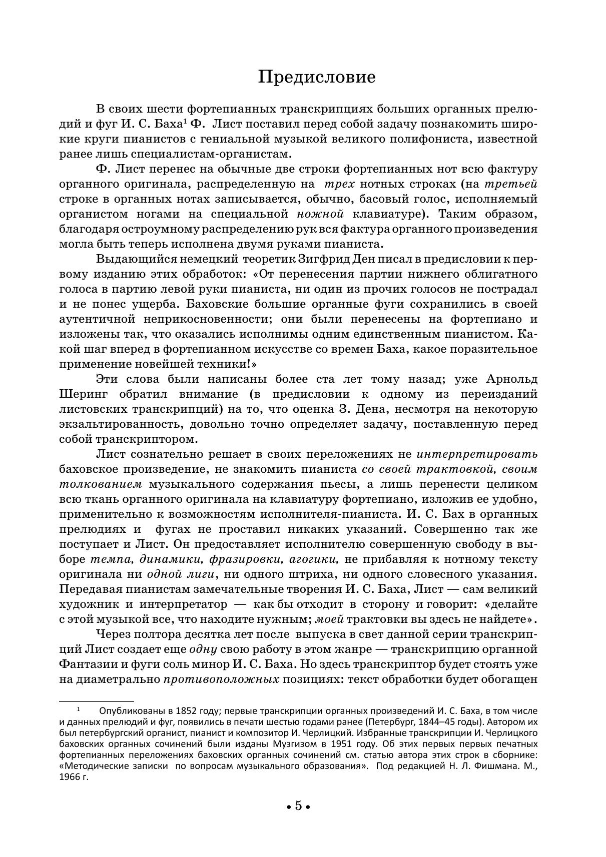 В своих шести фортепианных транскрипциях больших органных прелюдий и фуг И. С. Баха Ф. Лист поставил перед собой задачу познакомить широкие круги пианистов с гениальной музыкой великого полифониста, известной ранее лишь специалистам-органистам. Данное издание является точным воспроизведением текста транскрипций Листа. Редактору принадлежат все темповые, динамические, артикуляционные, аппликатурные, фразировочные и прочие указания.