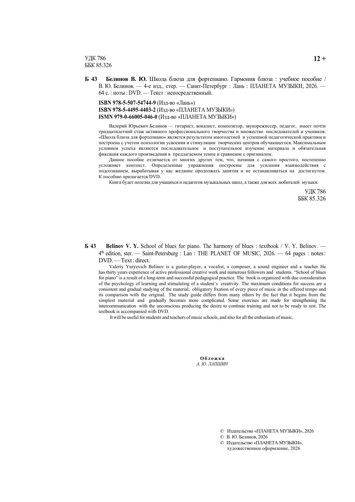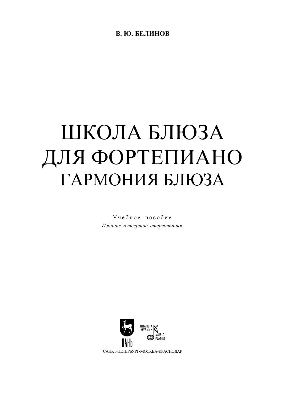 Валерий Юрьевич Белинов (1956 г.) — гитарист, вокалист, композитор, звукорежиссер, педагог, имеет почти тридцатилетний стаж активного профессионального творчества и имеет множество последователей и учеников. «Школа блюза для фортепиано» является результатом многолетней и успешной педагогической практики и построена с учетом психологии усвоения и стимуляции творческих центров обучающегося. Максимальным условием успеха являются последовательное и поступательное изучение материала и обязательная фиксация каждого произведения в предлагаемом темпе и сравнение с оригиналом. Данное пособие отличается от многих других тем, что, начиная с самого простого, постепенно усложняет контекст. Определенные упражнения построены для усиления взаимодействия с подсознанием, вырабатывая у нас желание продолжать занятия и не останавливаться на достигнутом. Книга будет полезна для учащихся и педагогов музыкальных школ, а также для всех любителей музыки.