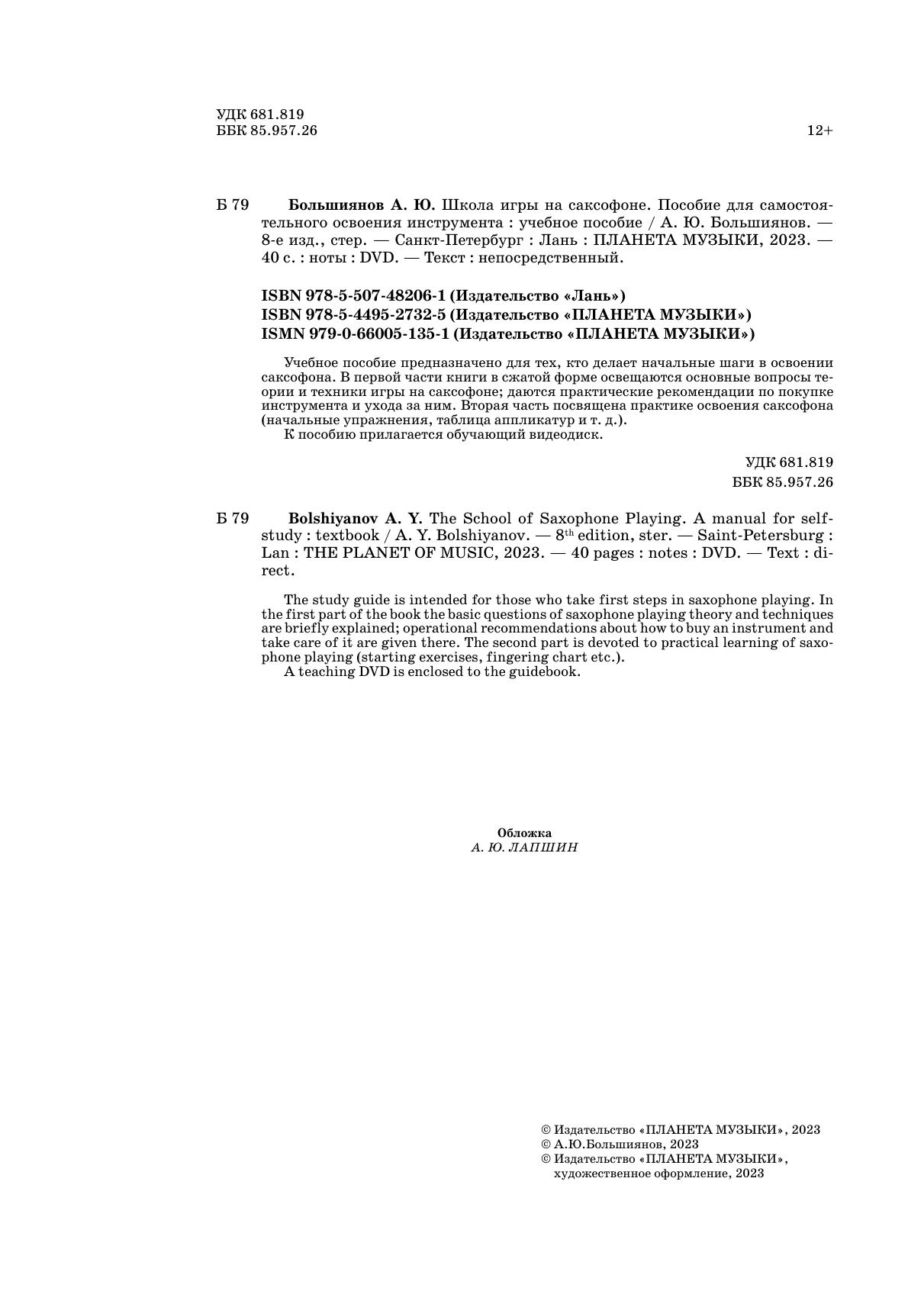 Учебное пособие предназначено для тех, кто делает начальные шаги в освоении саксофона. В первой части книги в сжатой форме освещаются основные вопросы теории и техники игры на саксофоне, даются практические рекомендации по покупке инструмента и ухода за ним. Вторая часть посвящена практике освоения саксофона (начальные упражнения, таблица аппликатур и т. д.). К пособию прилагается обучающий видеодиск. The study guide is intended for those who take first steps in saxophone playing. In the first part of the book the basic questions of saxophone playing theory and techniques are briefly explained, operational recommendations about how to buy an instrument and take care of it are given there. The second part is devoted to practical learning of saxophone playing (starting exercises, fingering chart etc.). A teaching DVD is enclosed to the guidebook.