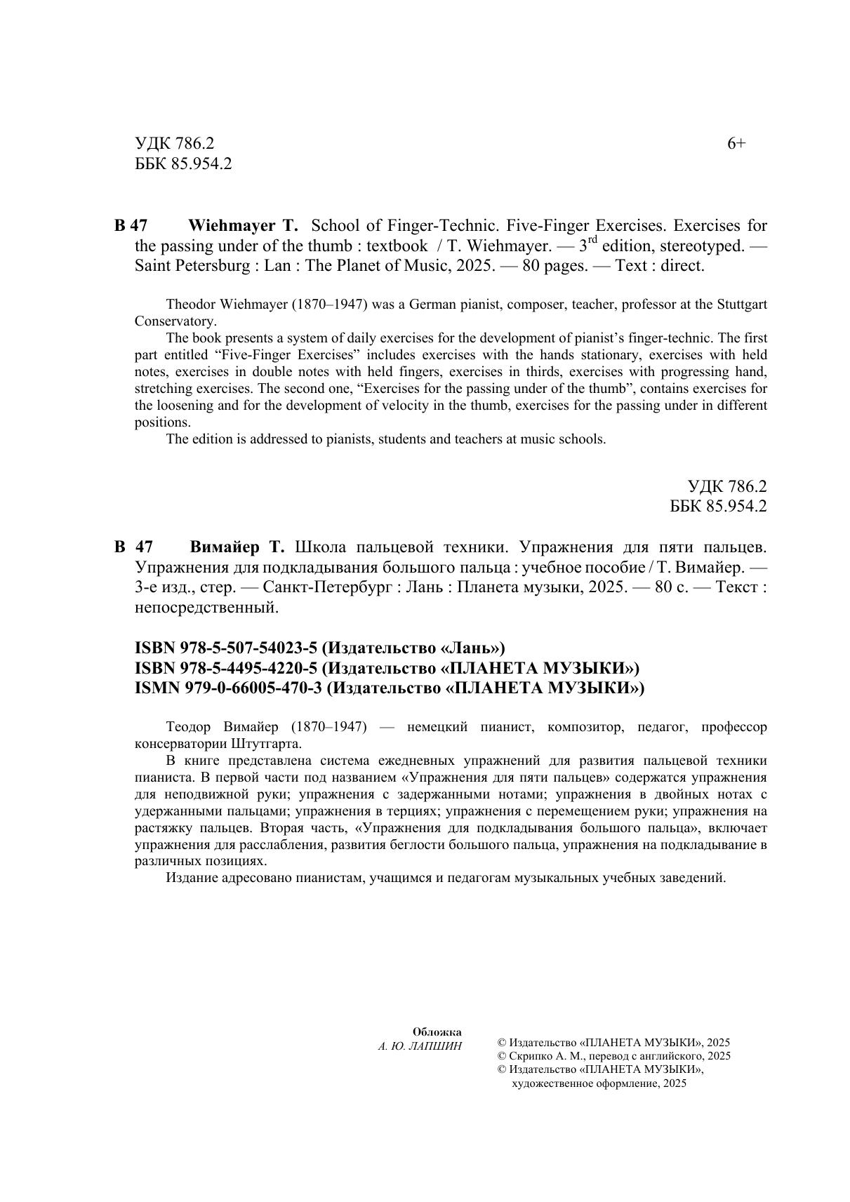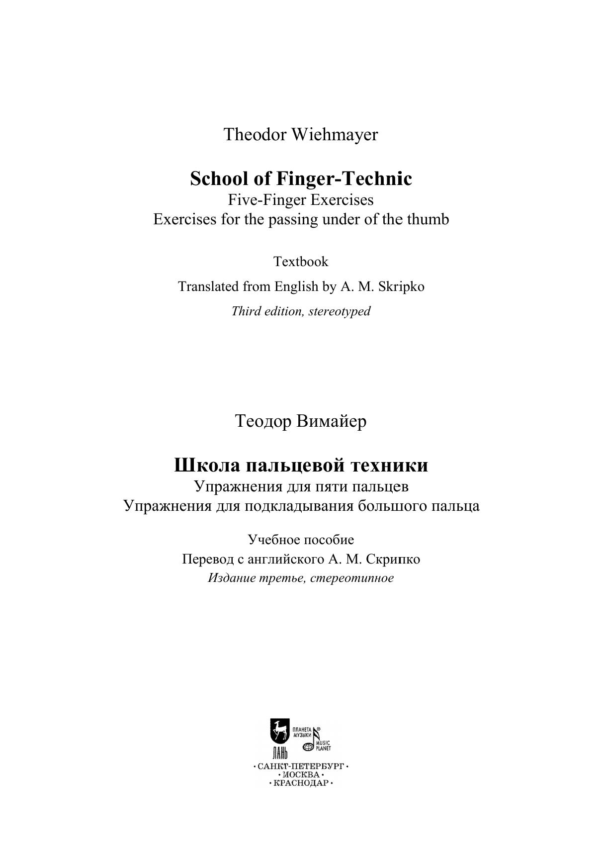 Теодор Вимайер (1870–1947) – немецкий пианист, композитор, педагог, профессор консерватории Штутгарта. В книге представлена система ежедневных упражнений для развития пальцевой техники пианиста. В первой части под названием "Упражнения для пяти пальцев" содержатся упражнения для неподвижной руки, упражнения с задержанными нотами, упражнения в двойных нотах с удержанными пальцами, упражнения в терциях, упражнения с перемещением руки, упражнения на растяжку пальцев. Вторая часть, "Упражнения для подкладывания большого пальца", включает упражнения для расслабления, развития беглости большого пальца, упражнения на подкладывание в различных позициях. Издание адресовано пианистам, учащимся и педагогам музыкальных учебных заведений.