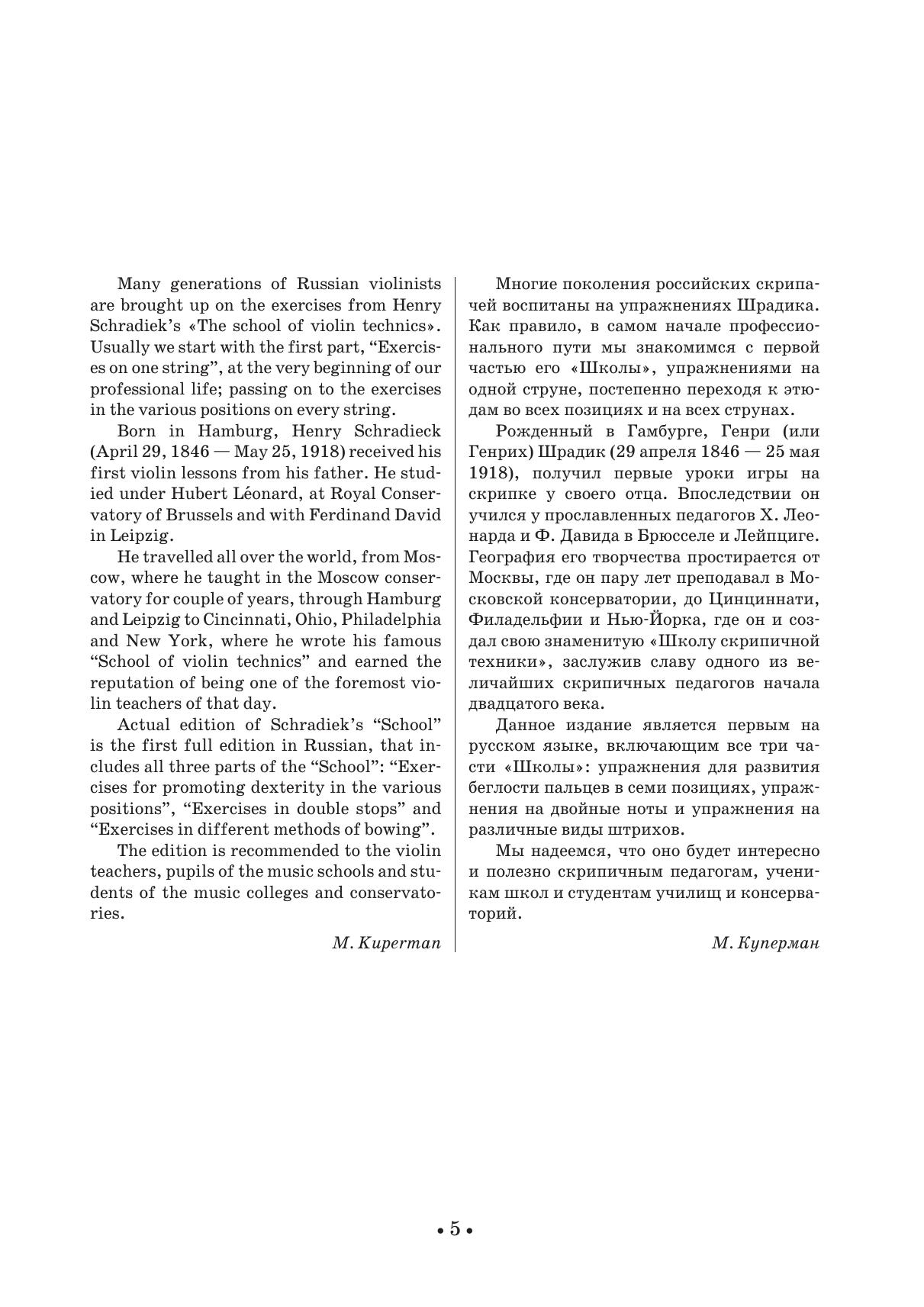 Многие поколения российских скрипачей воспитаны на упражнениях Генри Шрадика (1846–1918), немецкого скрипача, педагога, композитора. Данное издание является первым на русском языке, включающим все три части «Школы»: упражнения для развития беглости пальцев в семи позициях, упражнения на двойные ноты и упражнения на различные виды штрихов. Мы надеемся, что оно будет интересно и полезно скрипичным педагогам, ученикам школ и студентам училищ и консерваторий.