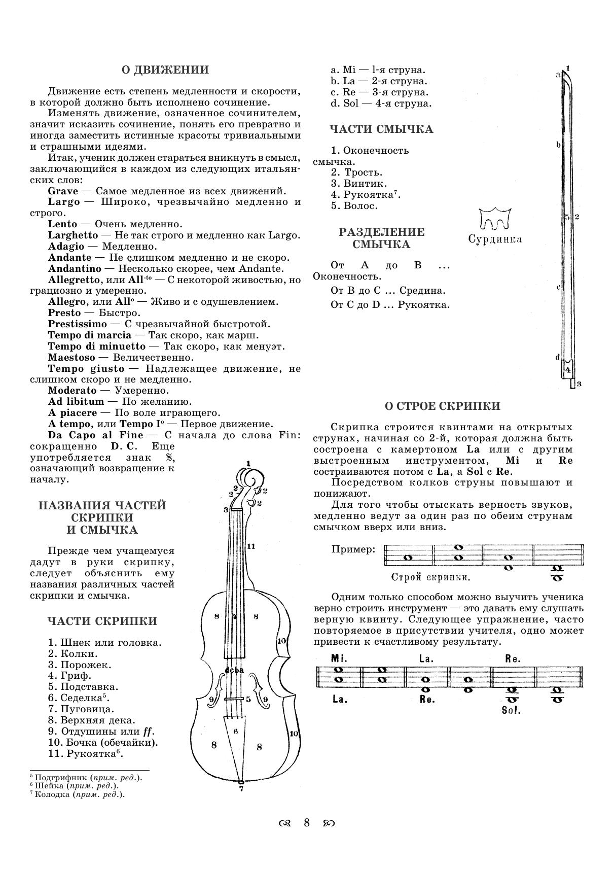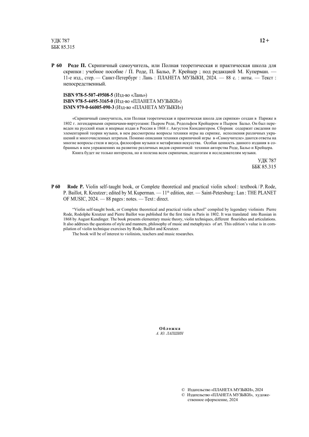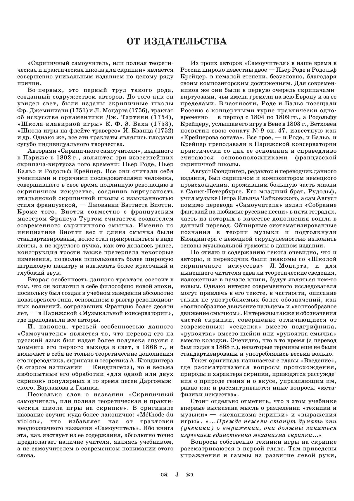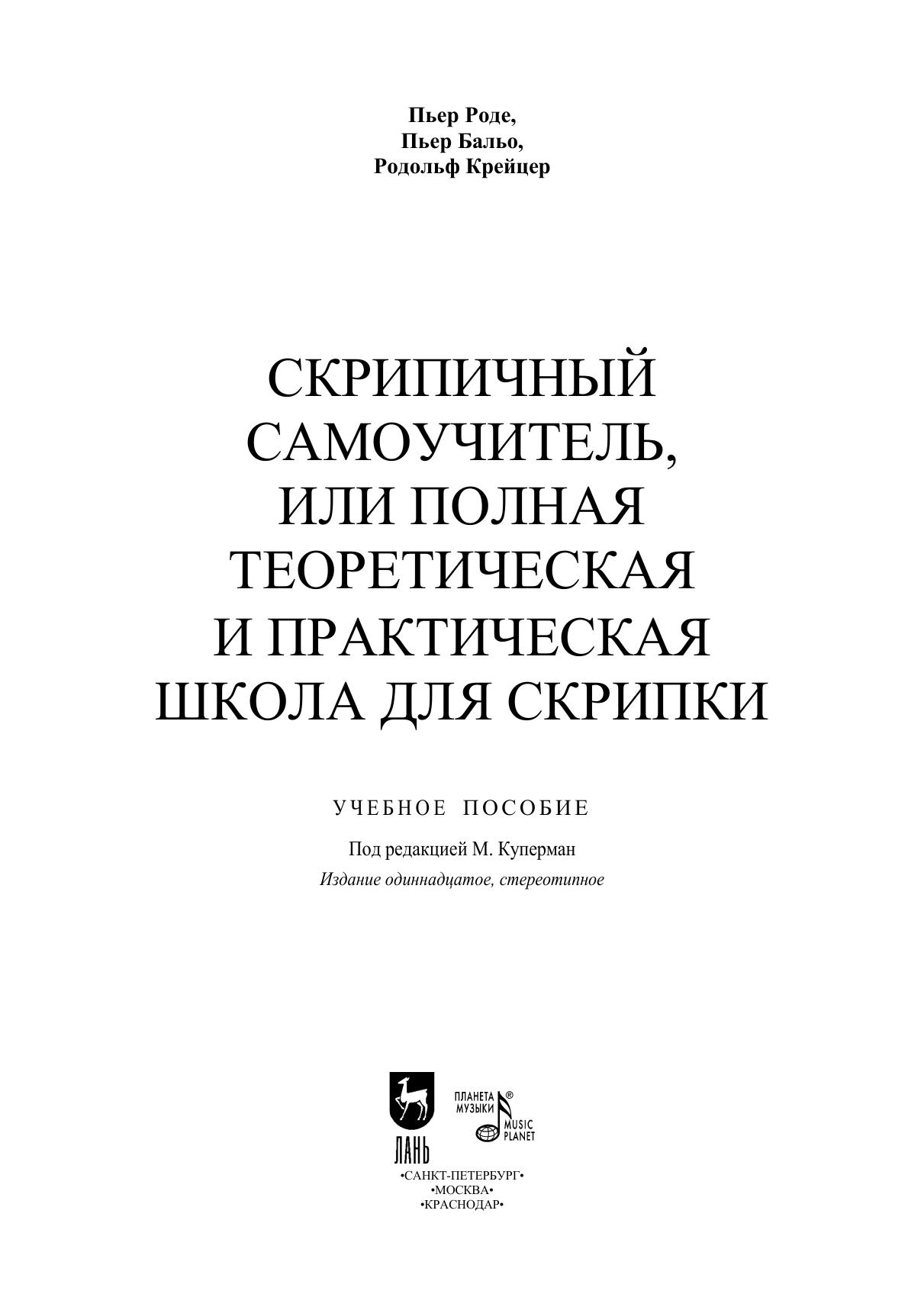«Скрипичный самоучитель или полная теоретическая и практическая школа для скрипки» увидел свет в Париже в 1802 г. легендарными скрипачами-виртуозами: Пьером Роде, Родольфом Крейцером и Пьером Бальо. Он был переведен на русский язык и впервые издан в России в 1868 г. Августом Кюндигером. Сборник содержит сведения по элементарной теории музыки, в нем рассмотрены вопросы техники игры на скрипке, исполнения различных украшений и многочисленных штрихов. Помимо описания техники скрипичной игры в «Самоучителе» даются ответы на многие вопросы стиля и вкуса, философии музыки и метафизики искусства. Особая ценность данного издания в собранных упражнениях на развитие различных видов скрипичной техники авторства Роде, Бальо и Крейцера. Книга будет не только интересна, но и полезна всем скрипачам, педагогам и исследователям музыки. “Violin school” compiled by legendary violinists Pierre Rode, Rodolphe Kreutzer and Pierre Baillot was published for the first time in Paris in 1802. It was translated into Russian in 1868 by August Kundinger. The book presents elementary music theory, violin techniques, different flourishes and articulations. It also address the questions of style and manners, philosophy of music and metaphysics of art. This edition’s value in compilation of violin technique exercises by Rode, Baillot and Kreutzer. The book will be of interest to violinists, teachers and music researches.