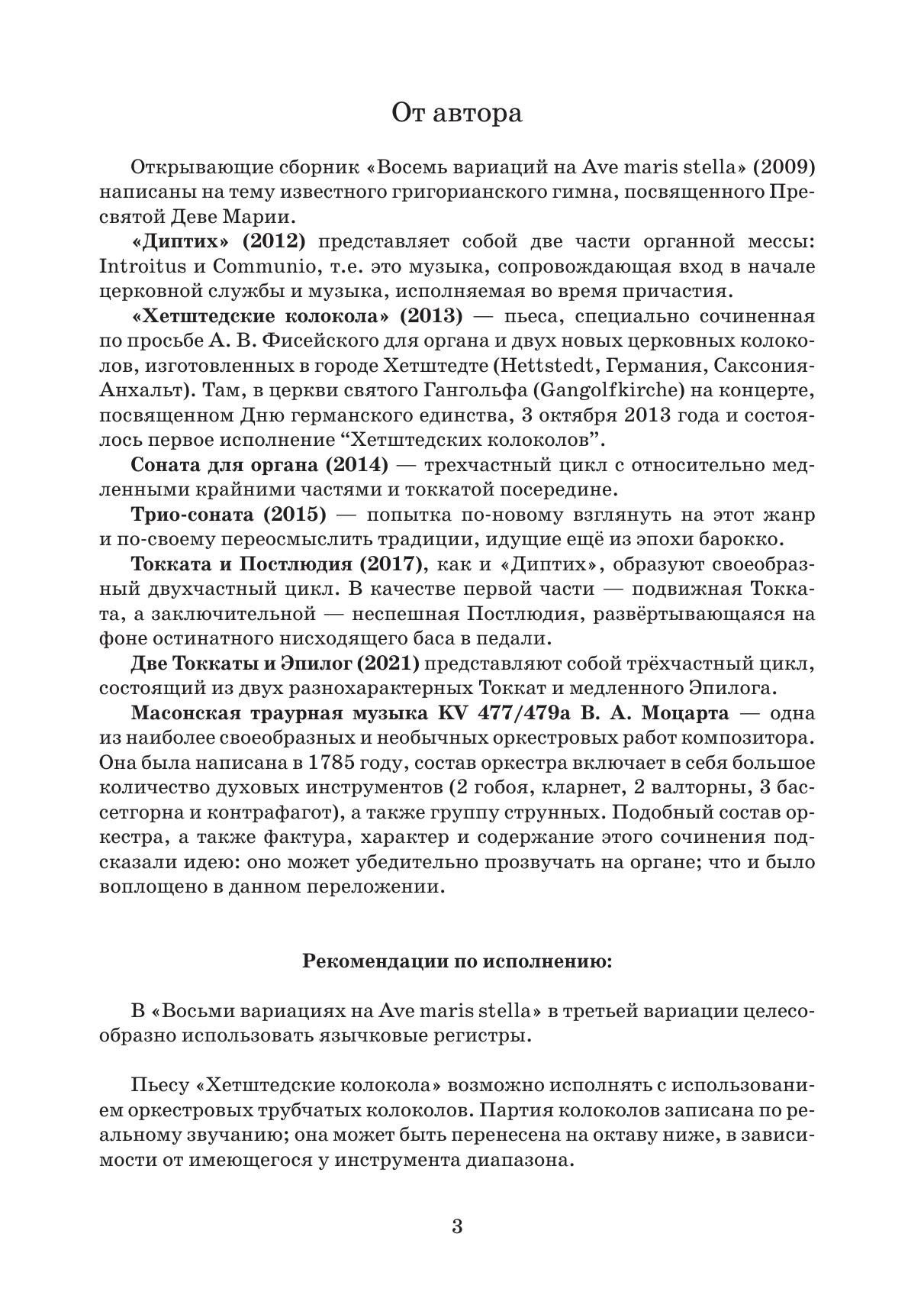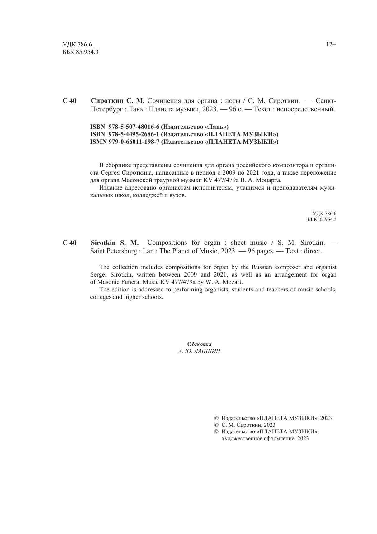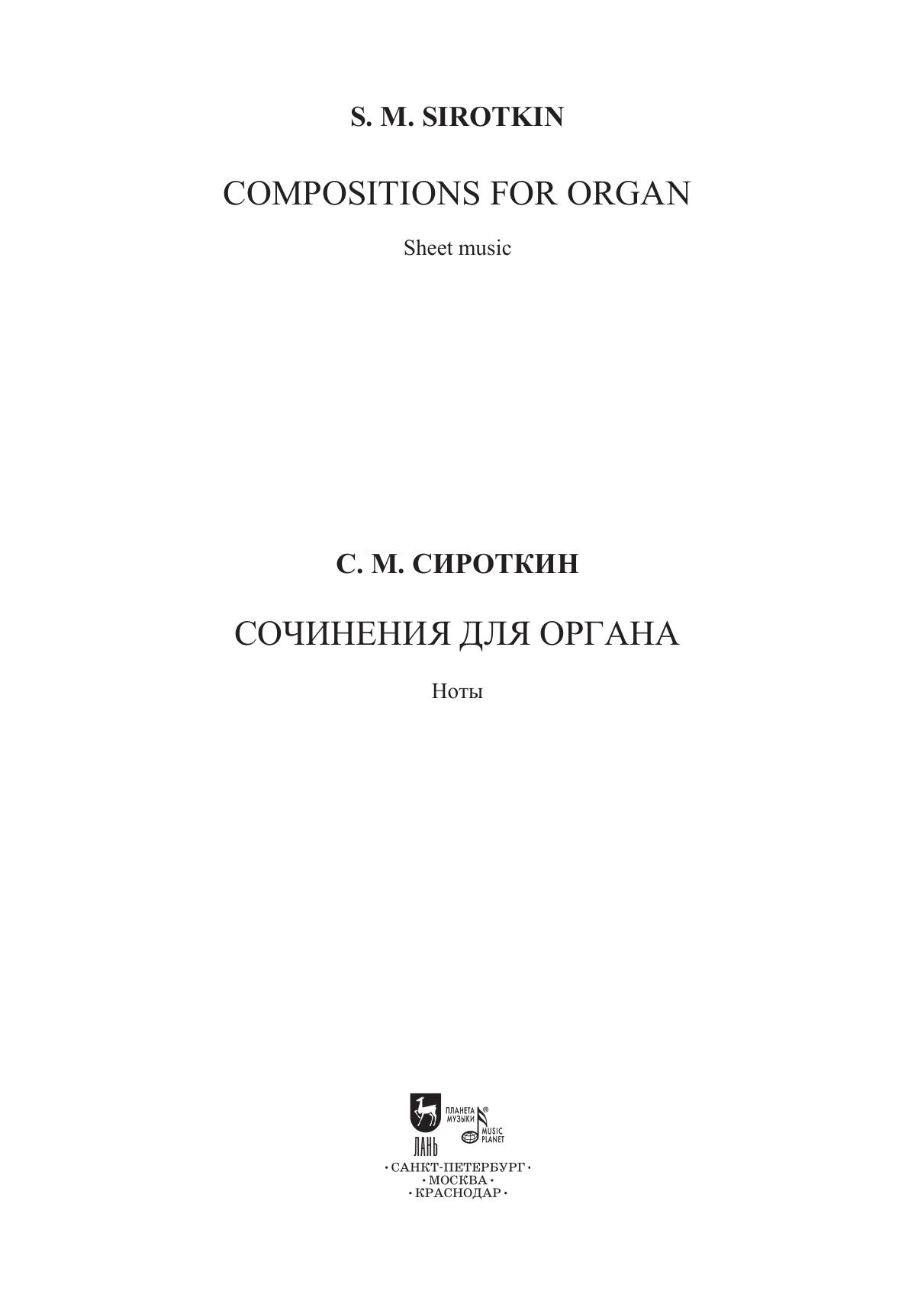 В сборнике представлены сочинения для органа российского композитора и органиста Сергея Сироткина, написанные в период с 2009 по 2021 года. А также переложение для органа Масонской траурной музыки KV 477/479а В.А. Моцарта. Издание адресовано органистам-исполнителям, учащимся и преподавателям музыкальных школ, колледжей и вузов. The collection includes compositions for organ by the Russian composer and organist Sergei Sirotkin, written between 2009 and 2021, as well as an arrangement for organ of Masonic Funeral Music KV 477/479a by W. A. Mozart. The edition is addressed to performing organists, students and teachers of music schools, colleges and higher schools.