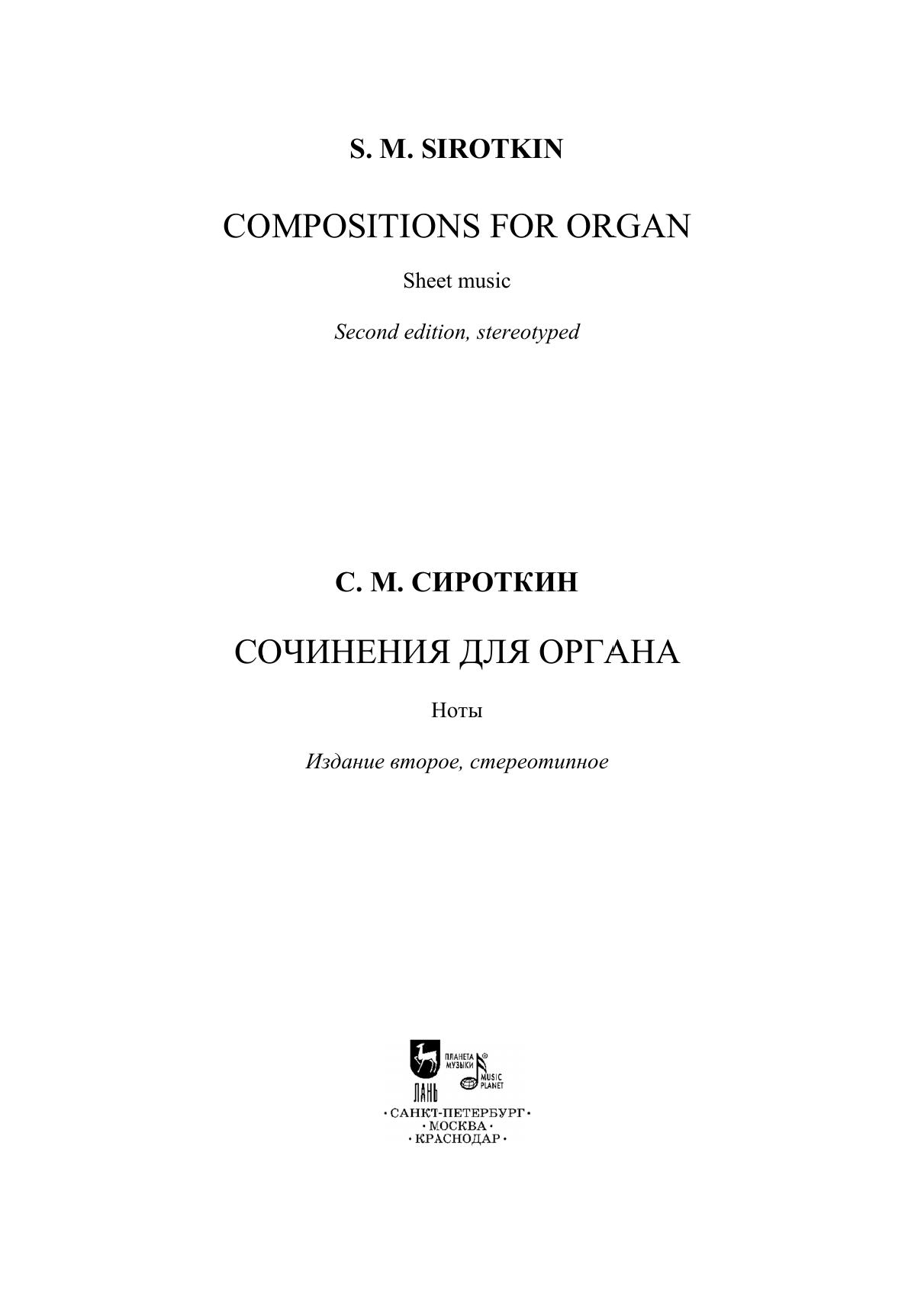 В сборнике представлены сочинения для органа российского композитора и органиста Сергея Сироткина, написанные в период с 2009 по 2021 года. А также переложение для органа Масонской траурной музыки KV 477/479а В.А. Моцарта. Издание адресовано органистам-исполнителям, учащимся и преподавателям музыкальных школ, колледжей и вузов. The collection includes compositions for organ by the Russian composer and organist Sergei Sirotkin, written between 2009 and 2021, as well as an arrangement for organ of Masonic Funeral Music KV 477/479a by W. A. Mozart. The edition is addressed to performing organists, students and teachers of music schools, colleges and higher schools.