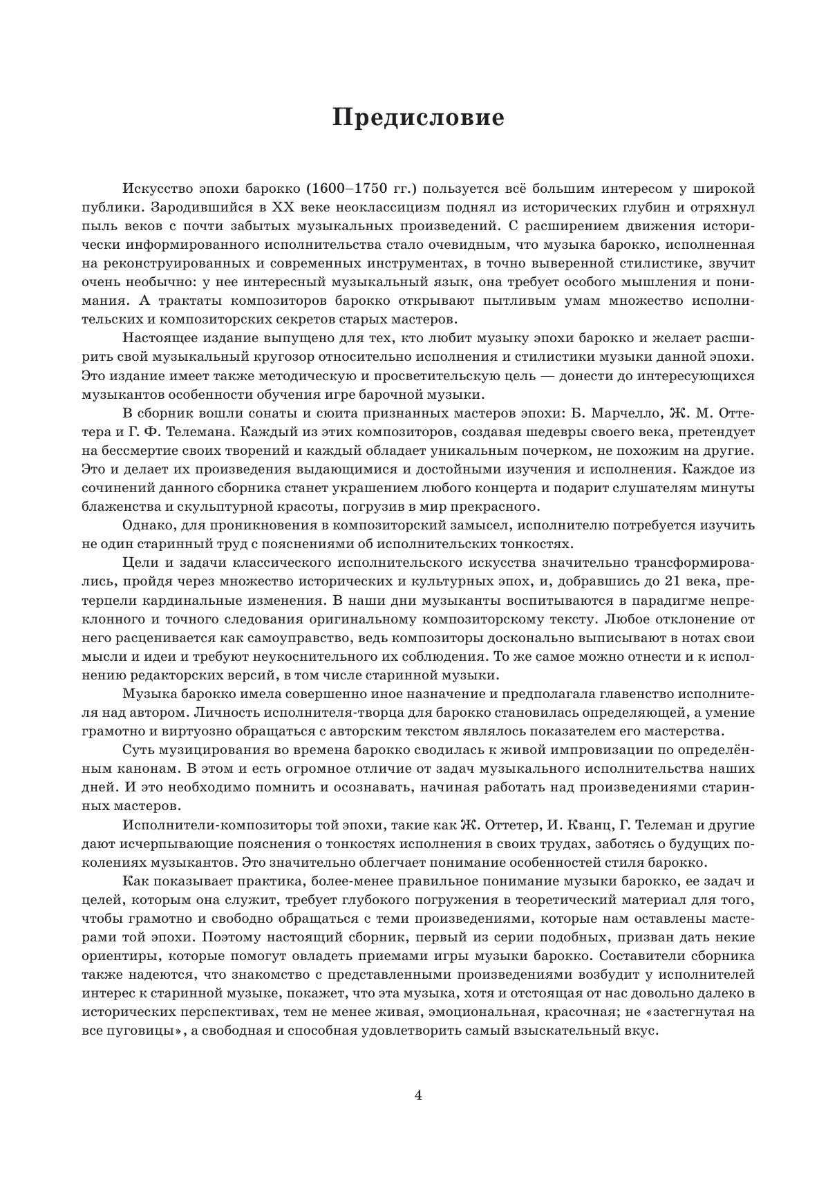 Искусство эпохи Барокко (1600 – 1750 гг.) пользуется всё большим интересом у широкой публики. Зародившийся в ХХ веке неоклассицизм поднял из исторических глубин и отряхнул пыль веков с почти забытых музыкальных произведений. С расширением движения исторически информированного исполнительства стало очевидным, что музыка Барокко, исполненная на реконструированных и современных инструментах, в точно выверенной стилистике, звучит очень необычно: у нее интересный музыкальный язык, она требует особого мышления и понимания. А трактаты композиторов Барокко открывают пытливым умам множество исполнительских и композиторских секретов старых мастеров. Настоящее издание выпущено для тех, кто любит музыку эпохи Барокко и желает расширить свой музыкальный кругозор относительно исполнения и стилистики музыки данной эпохи.