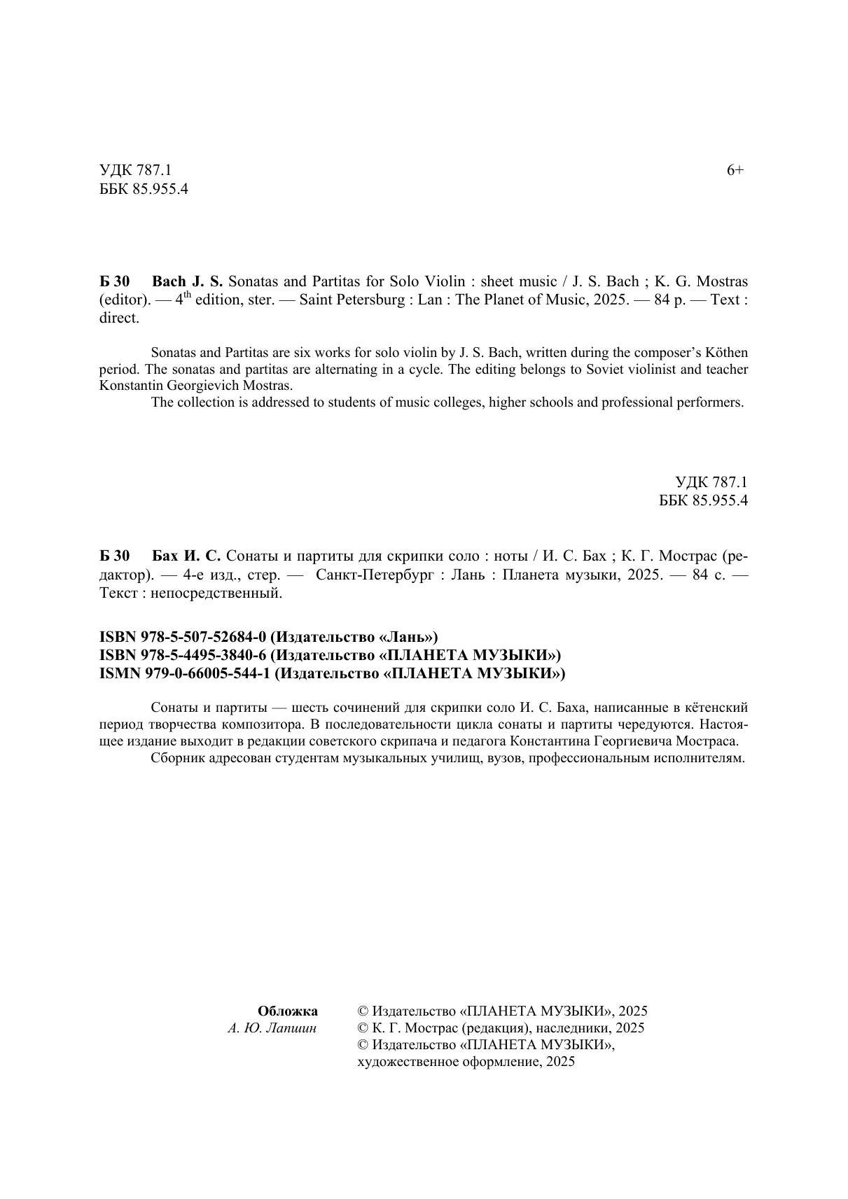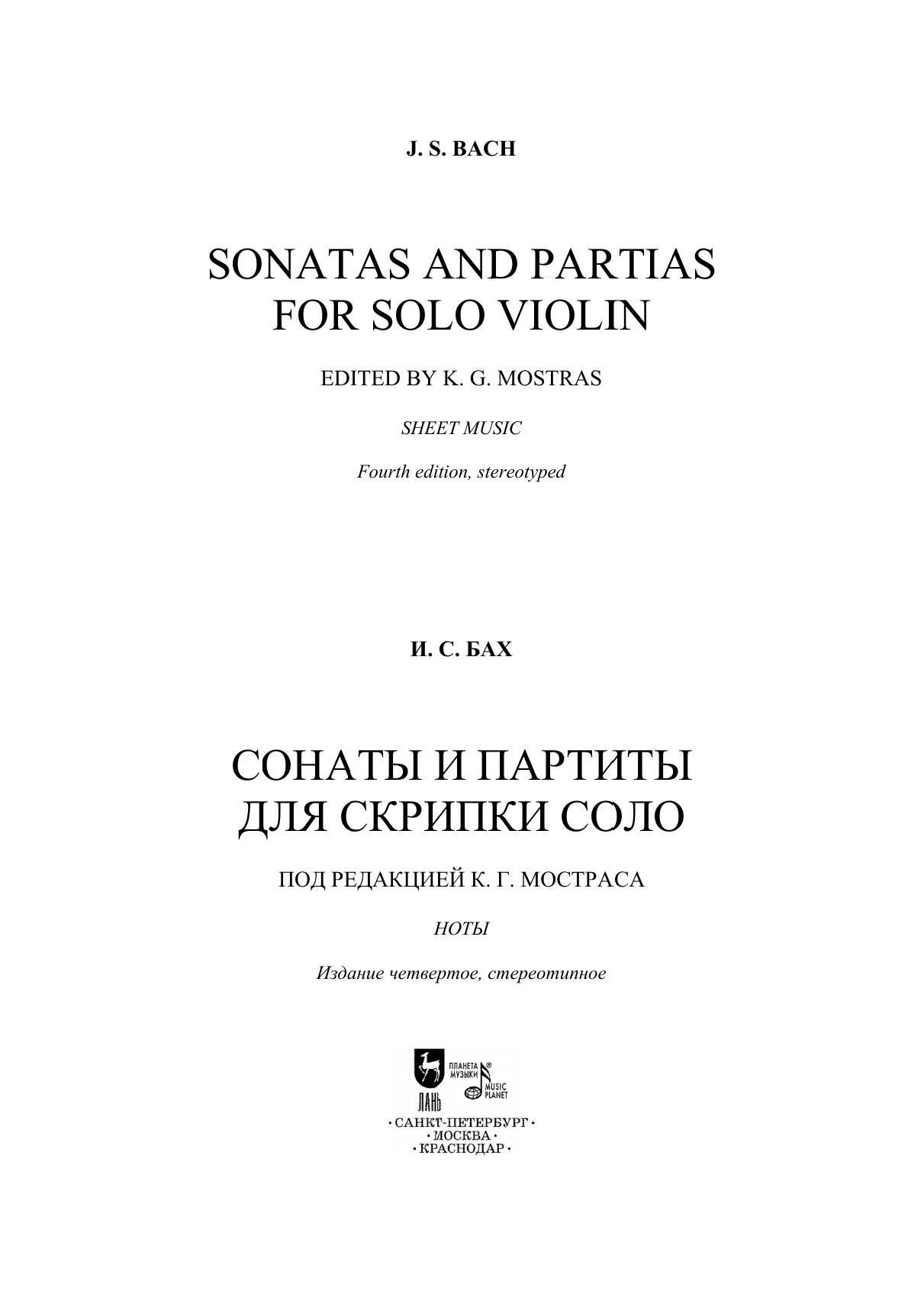 Сонаты и партиты – шесть сочинений для скрипки соло И. С. Баха, написанные в кётенский период творчества композитора. В последовательности цикла сонаты и партиты чередуются. Настоящее издание выходит в редакции советского скрипача и педагога Константина Георгиевича Мостраса. Сборник адресован студентам музыкальных училищ, вузов, профессиональным исполнителям.